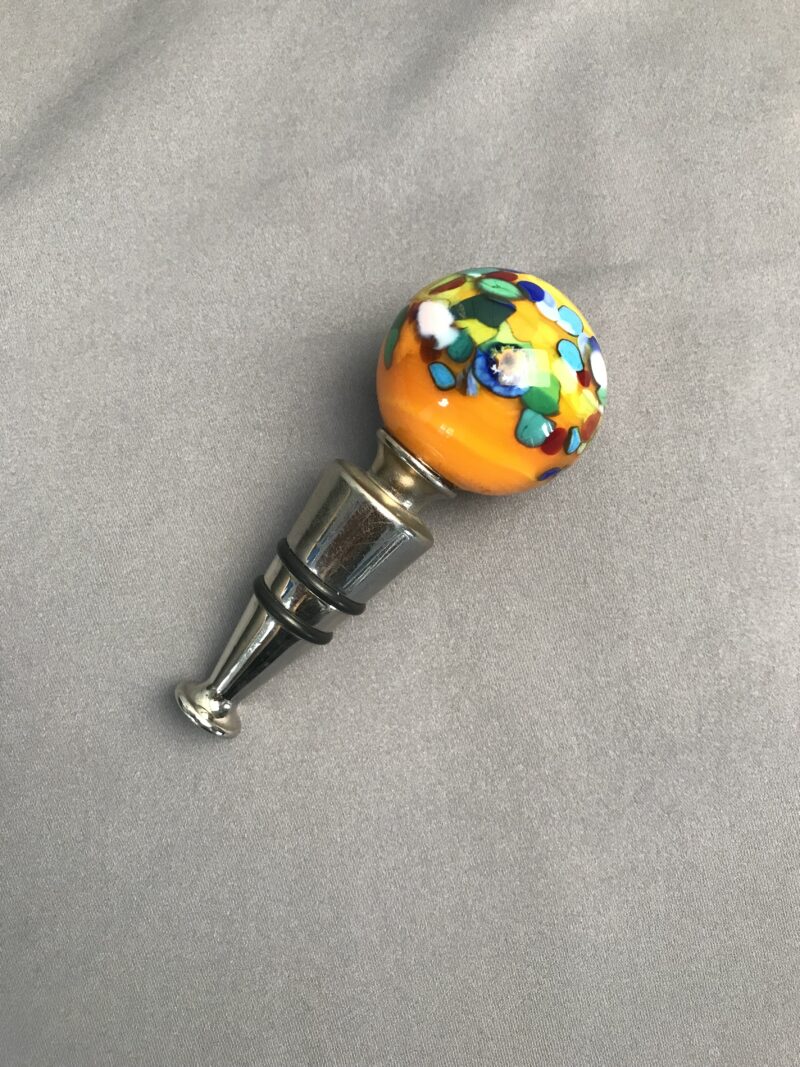 Bouchon en verre Murano Italy. Superbe bouchon en inox et verre Murano. Bouchon composé d’une partie en inox avec deux joints en silicone. Et une partie avec la boule du bouchon qui est en verre Murano de milles couleurs. Avec une dominance d’orange nous avons également du bleu du vert, du rouge et du blanc. Une vraie explosion visuelle. Un joli cadeau qui mettra en valeur vos bouteilles.