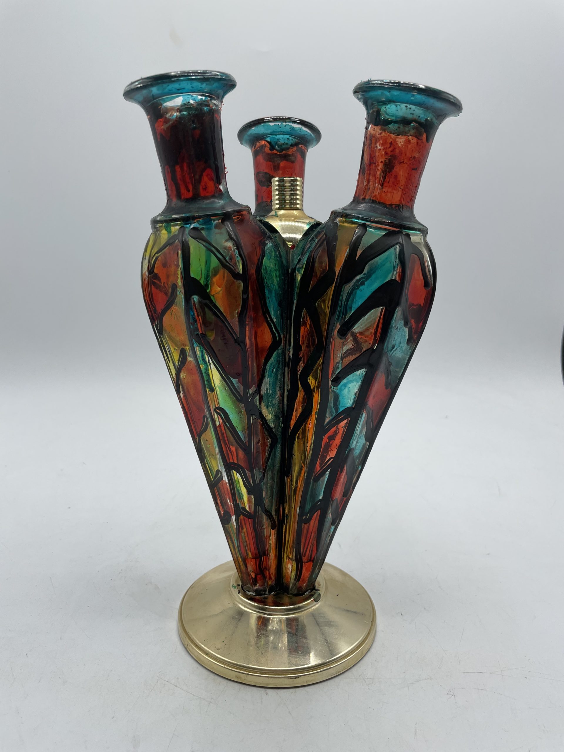On adore cet objet insolite qui est en réalité un flacon triptyque des liqueurs Garnier. En forme de bouquet, ces bouteilles ont été éditées par les établissement Eighien à Paris, breveté et déposé par Garnier. La bouteille se constitue de 3 flacons en verre disposées sur un pied en métal de couleur doré. Les bouteilles ont été repeintes en rouge, jaune et bleu. Vitrage, il manque les bouchons et des traces d’usure sont à prévoir (cf photos) jolies marques du temps passé. Un bel objet à collectionner !