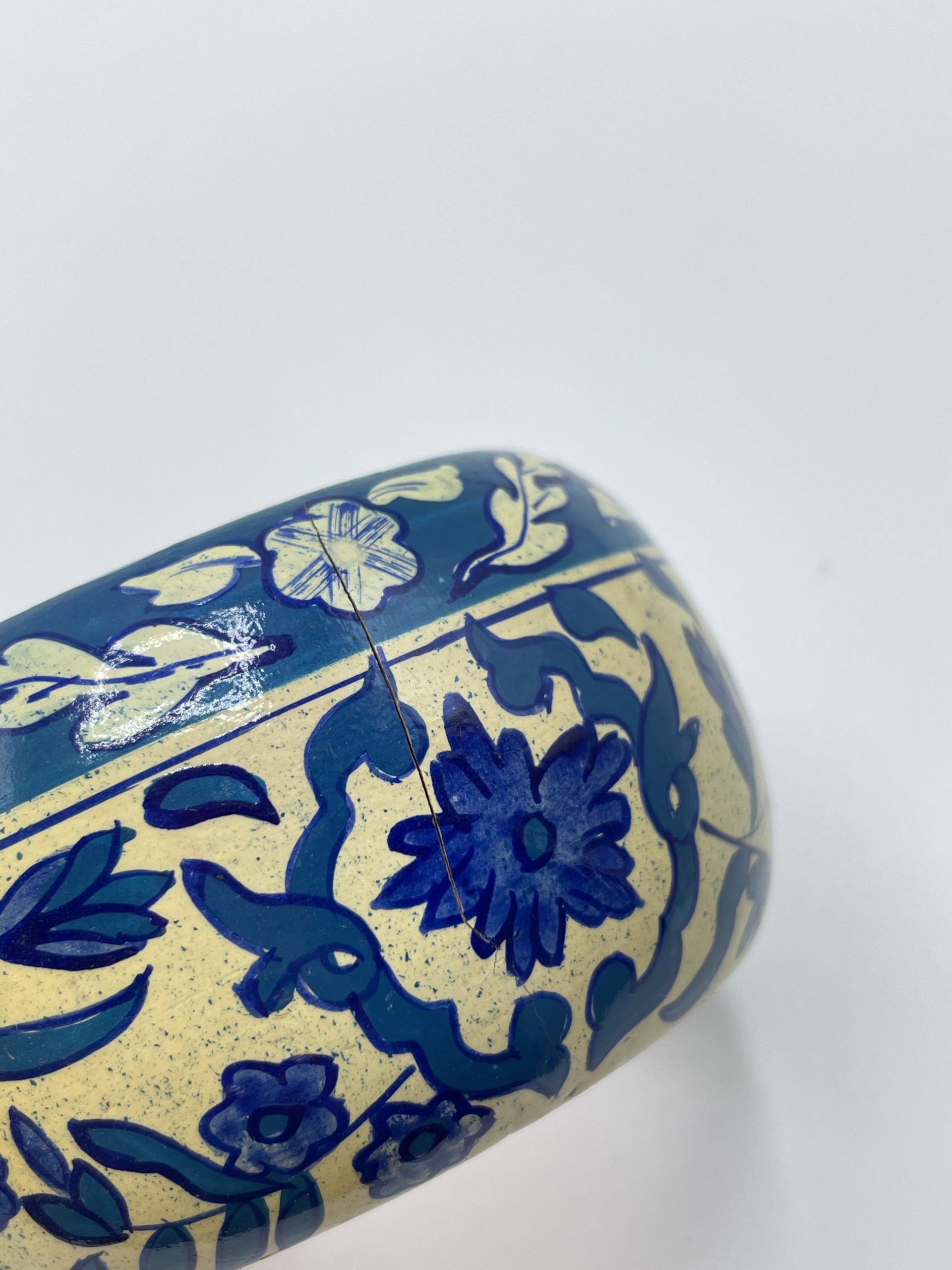 Ce joli bracelet en bois verni est peint à la main et décoré avec un motif champêtre de fleurs bleues et beiges. Création artisanale, ce bracelet a quelques traces d’usure (cf photos), jolies marques du temps passé.