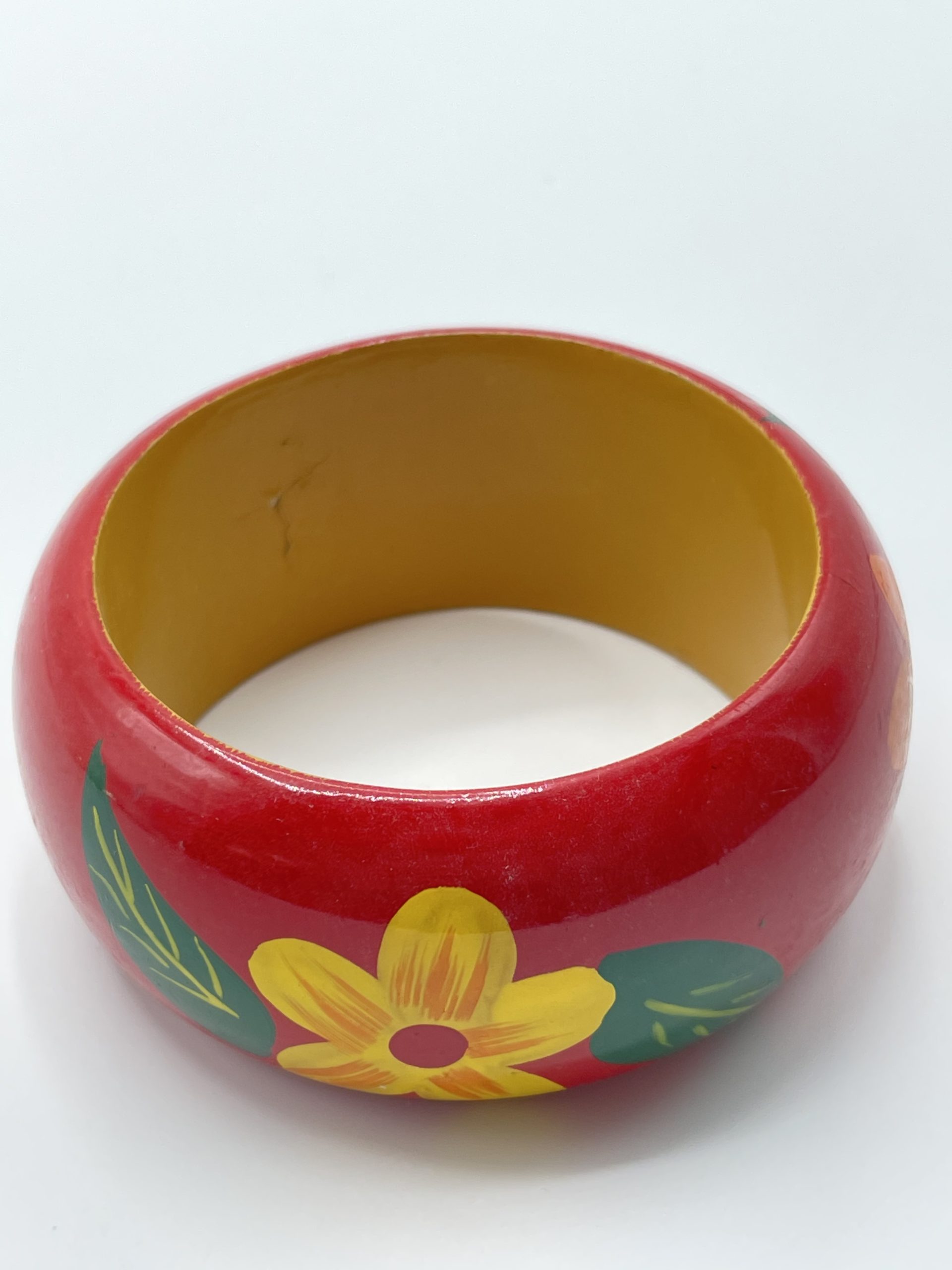 Joli bracelet vintage. Ce bracelet en bois verni est de couleur rouge et il est décoré à la main avec des motifs de fleurs jaunes et oranges. Création artisanale, ce bracelet présente quelques traces d’usure jolies marques du temps passé.