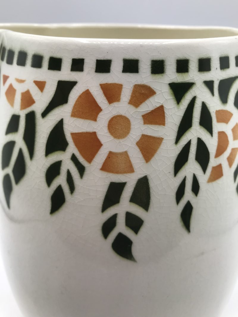 Joli broc de toilette ancien. Style Art Déco il apportera du pep’s à votre déco. Il porte des décors floraux géométrique qui lui donnent tout son charme. Il est estampillé nouvelle galeries collection « Claudine ». Ses dessins font penser à quelque chose d’ethnique, une belle façon de voyager avec un objet. Il est en très bon état.