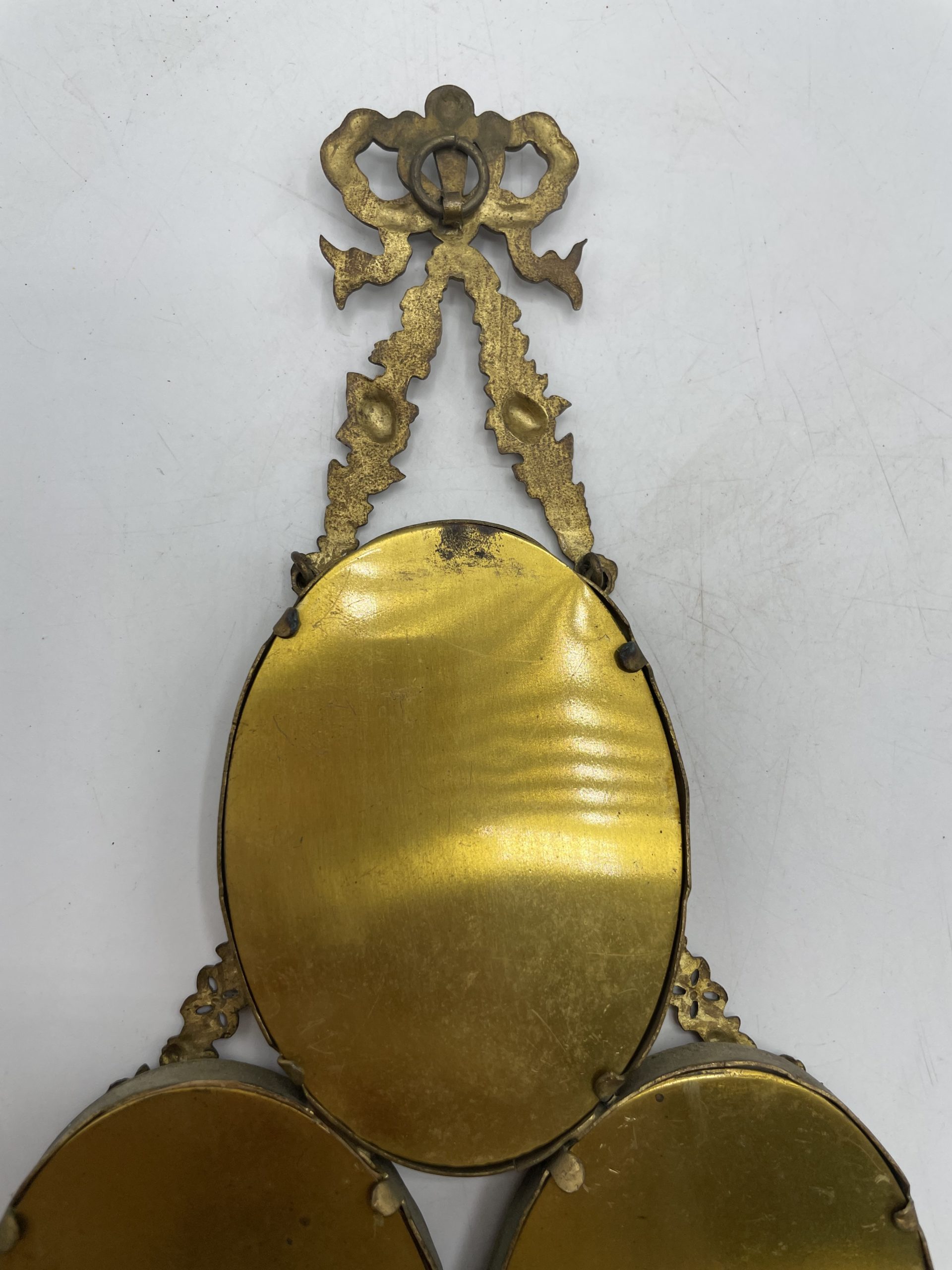 On adore ce joli cadre triptyque. En laiton couleur doré, le cadre se compose de 3 sous verres fixés ensemble et il s’accroche via son extension en forme de nœud et de guirlande fleurie en relief. Les 3 cadres renferment 3 illustrations réalisées à l’encre noire qui représentent un paysage emprisonnées sous le verre par une plaque de laiton. Celui du haut une vue sur la clôture d’un jardin décoré par 2 vases fleuris. Celui de gauche représente un paysage d’une forêt coupée en deux qui laisse voir un sapin et celui de droite un paysage sur une hutte ou une cabane au pied d’un grand arbre. Les illustrations sont signées et numérotées sur 300. Une jolie collection à adopter d’urgence !