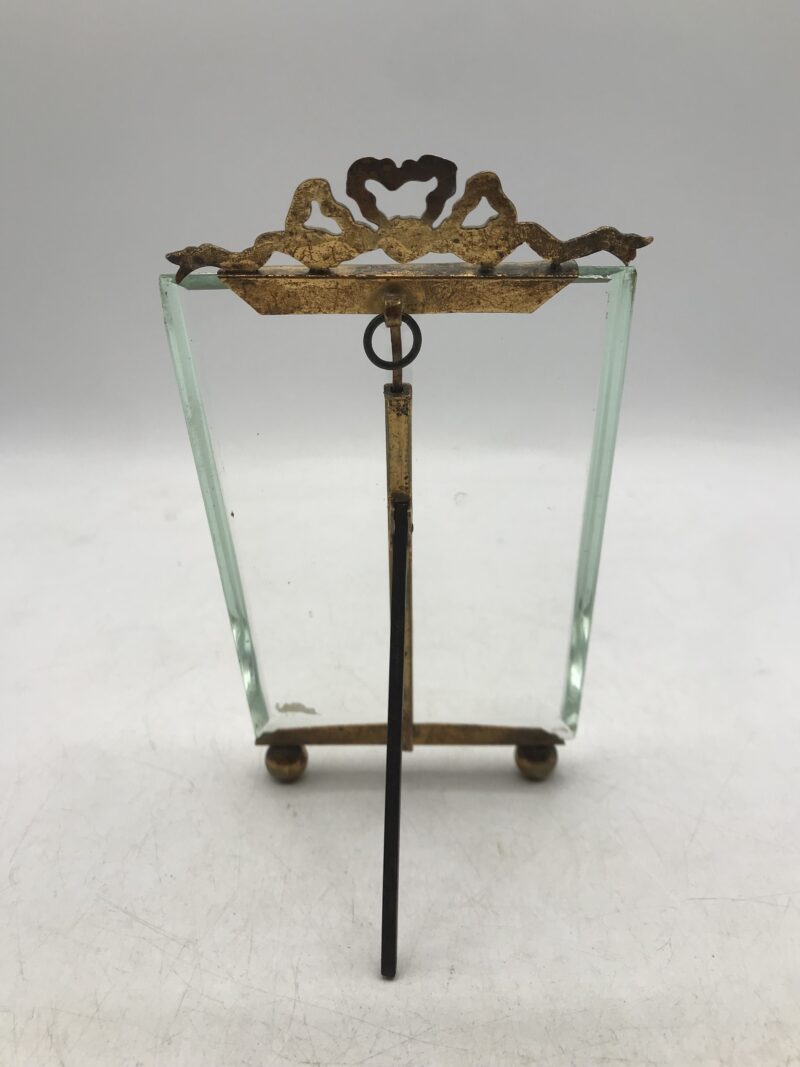 Alerte pépite !!! Cadres anciens style Louis XIX. Joli duo de cadres anciens en verre biseauté et métal doré. Le duo est composé d’un cadre pour des photos de taille 9 x 14 cm, il est orné d’un nœud sur le dessus et de deux petits pieds boules. Le deuxième est plus petit il est pour le format 6,5 x 10 cm, il porte également un petit nœud sur le dessus et des petits pieds boules. Une belle manière de mettre en avant de belles photos, des cadres qui nous racontent le temps passé, les souvenirs et le temps qui s’écoule. Ils sont dans leur jus, des marques d’usure sont à prévoir, sur le petit model il faut noter deux petit éclats en bas du verre (cf photos). Des jolis objets déco anciens. Ils sont prêts à trôner sur vos meubles avec élégance.