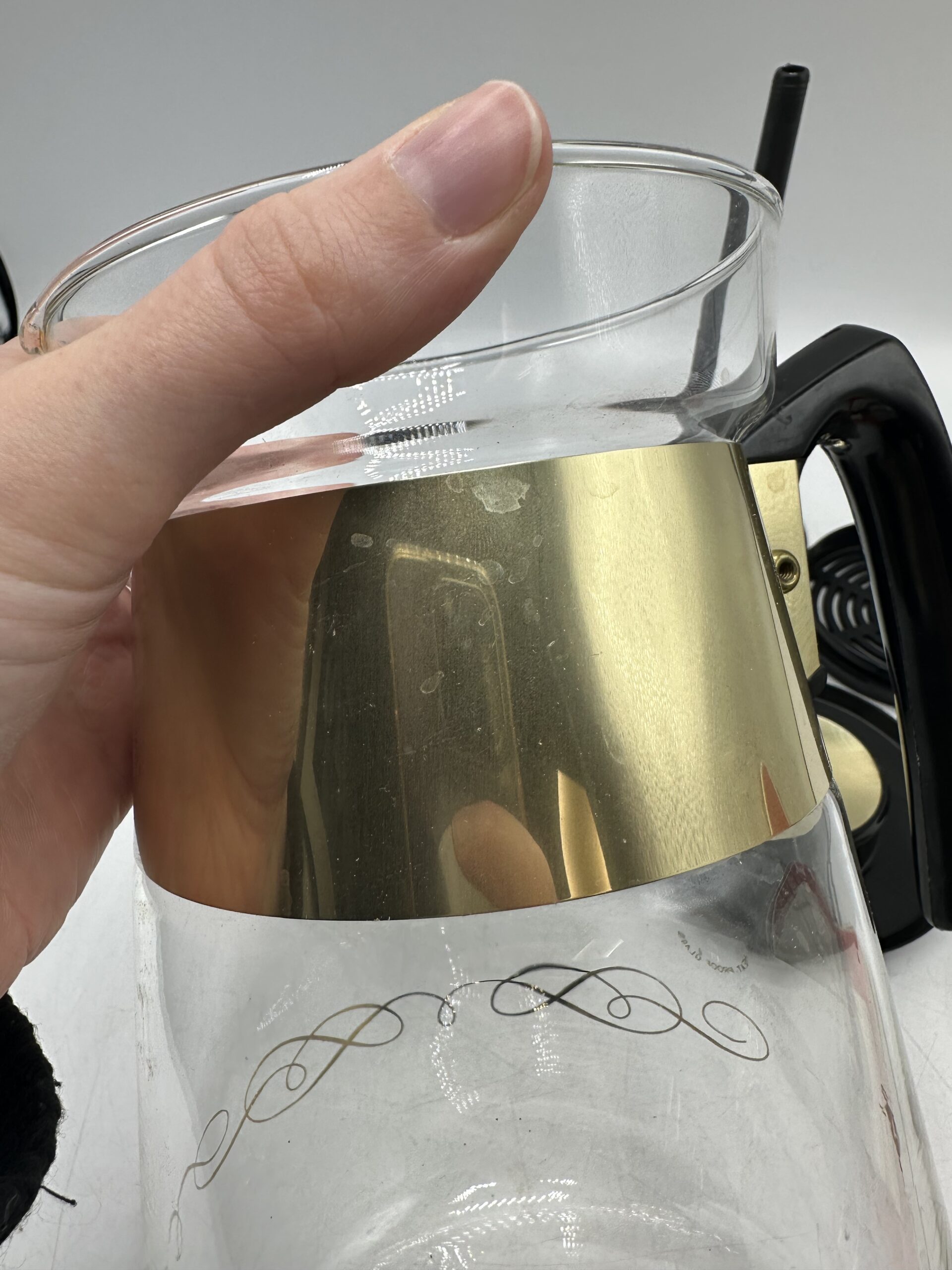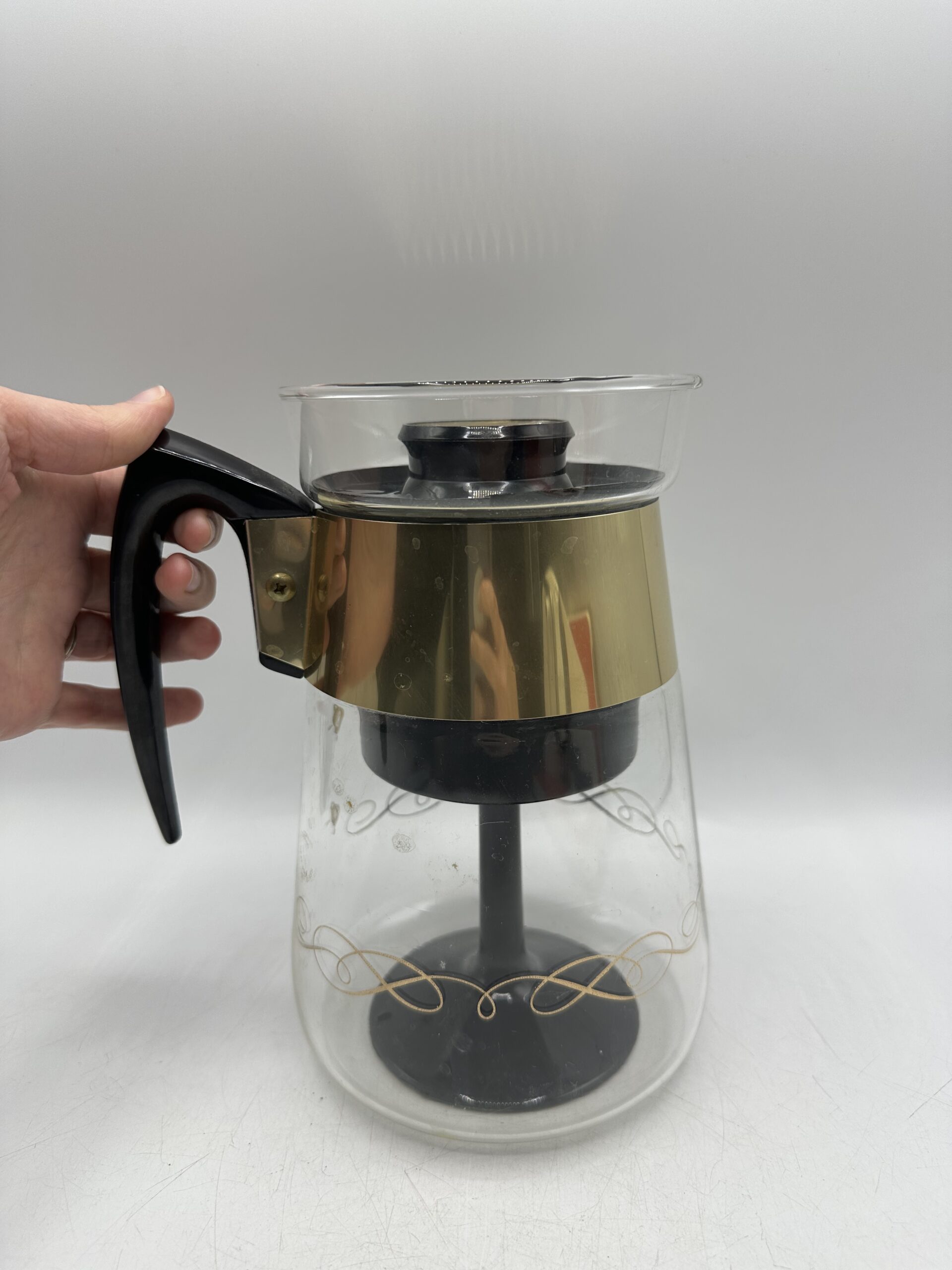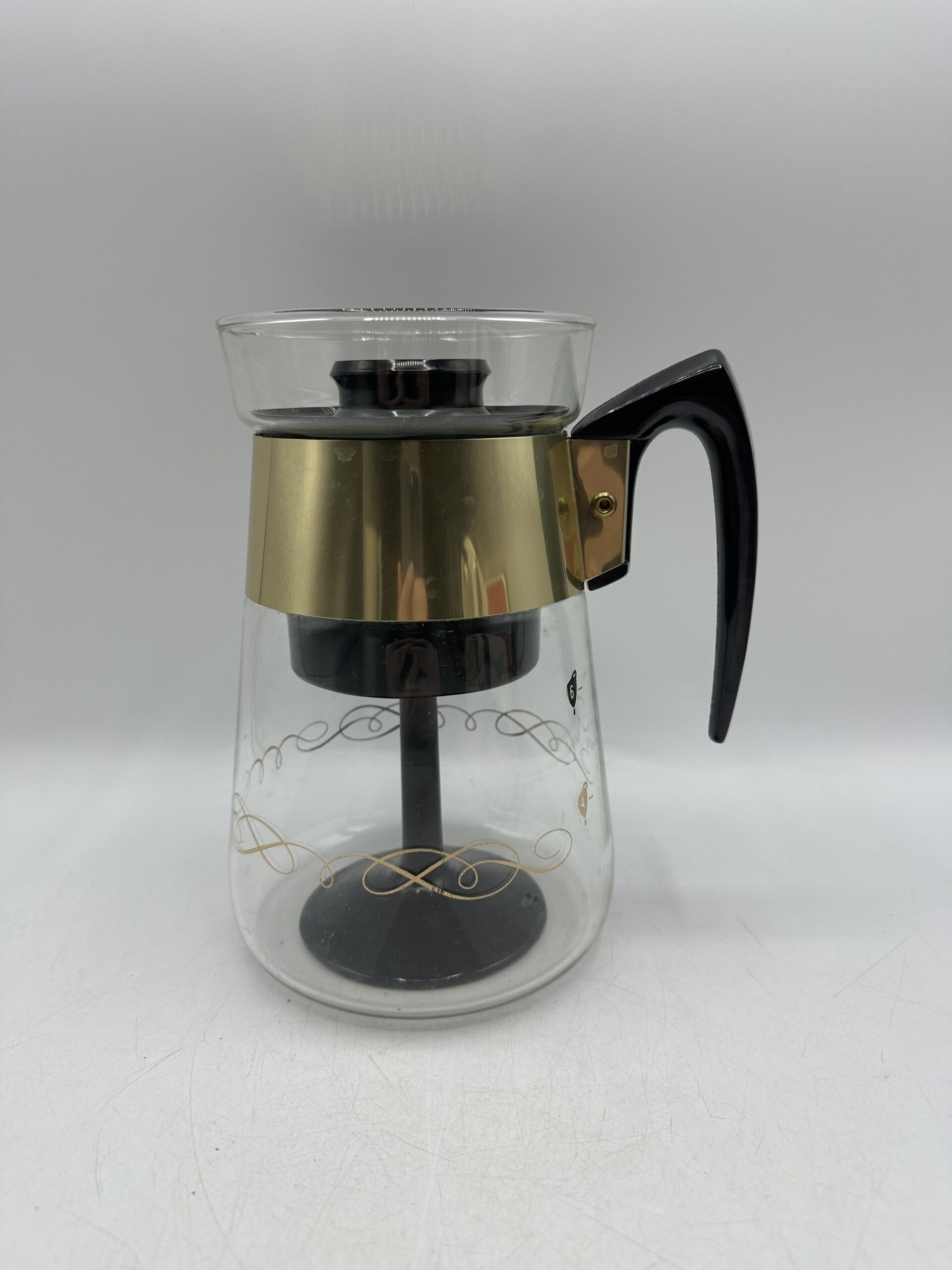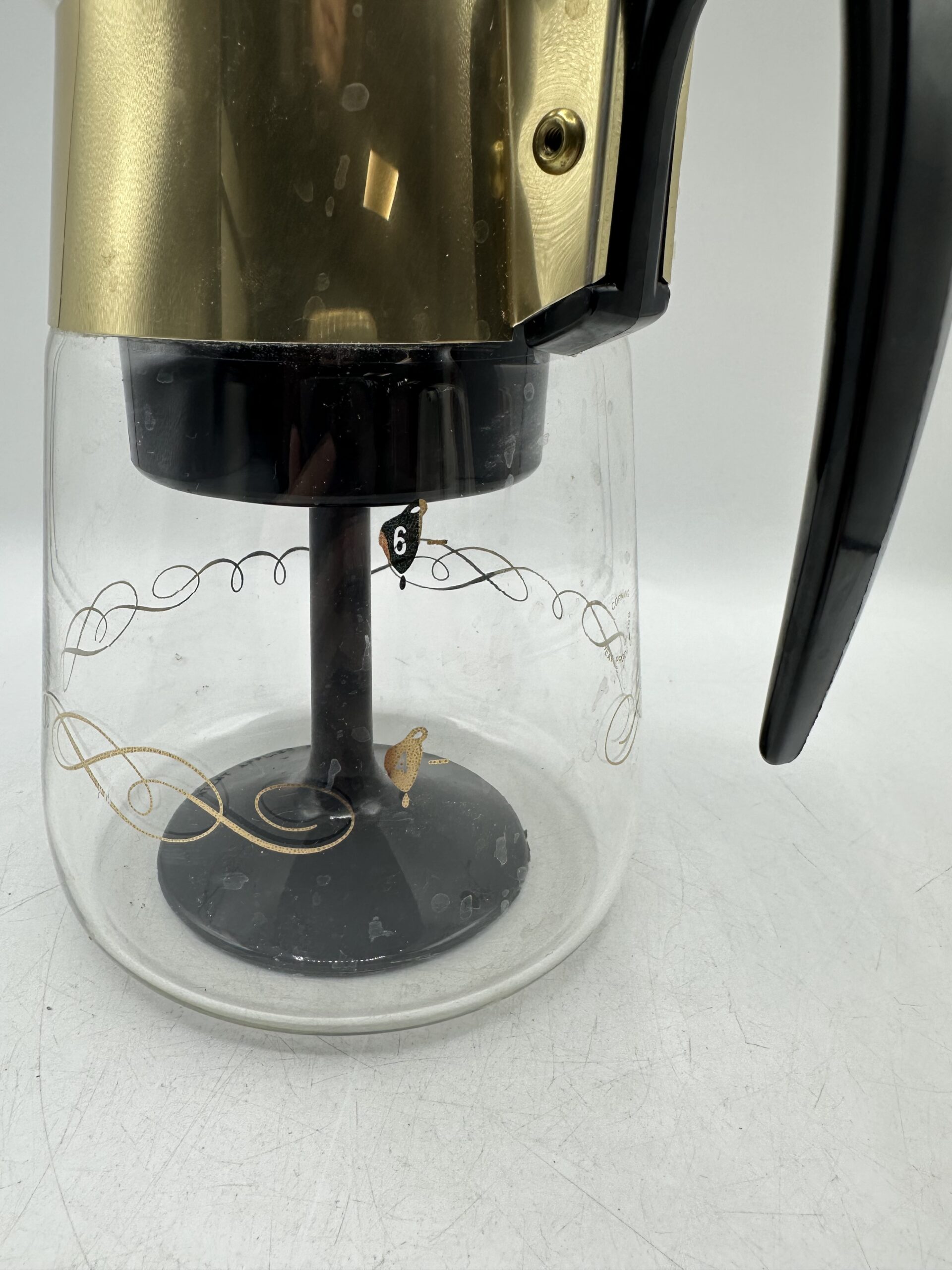 Authentique cafetière Corning emblématique du design américain Mid-Century. Cette cafetière 6 tasses est réalisée en verre avec une structure noire et une élégante bague métallique dorée.