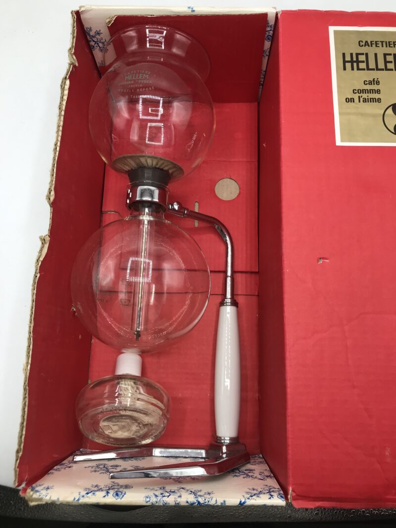 Cafetière Hellem Pyrex 8 tasses. Modèle déposé de la marque Hellem, cette cafetière a une capacité de 8 tasses à café. En inox pour le pied, toute la verrerie est signée Pyrex et la poignée de la cafetière est en porcelaine. Pour les amoureux du café, un bel objet déco et fonctionnel. Cafetière à dépression, système toujours utilisé de nos jours, vous allez redécouvrir le gout du ce type de café. Vintage, quelques traces d’usure sont à prévoir ainsi qu’un petit nettoyage (cf photos). Une jolie cafetière qui a conservé tout son charme et son élégance ! Elle sera vous accompagner lors des matins un peu rudes d’hiver ou même en été, une fidèle amie. Elle est complète et dans sa boite d’origine qui a été abimée par le temps.