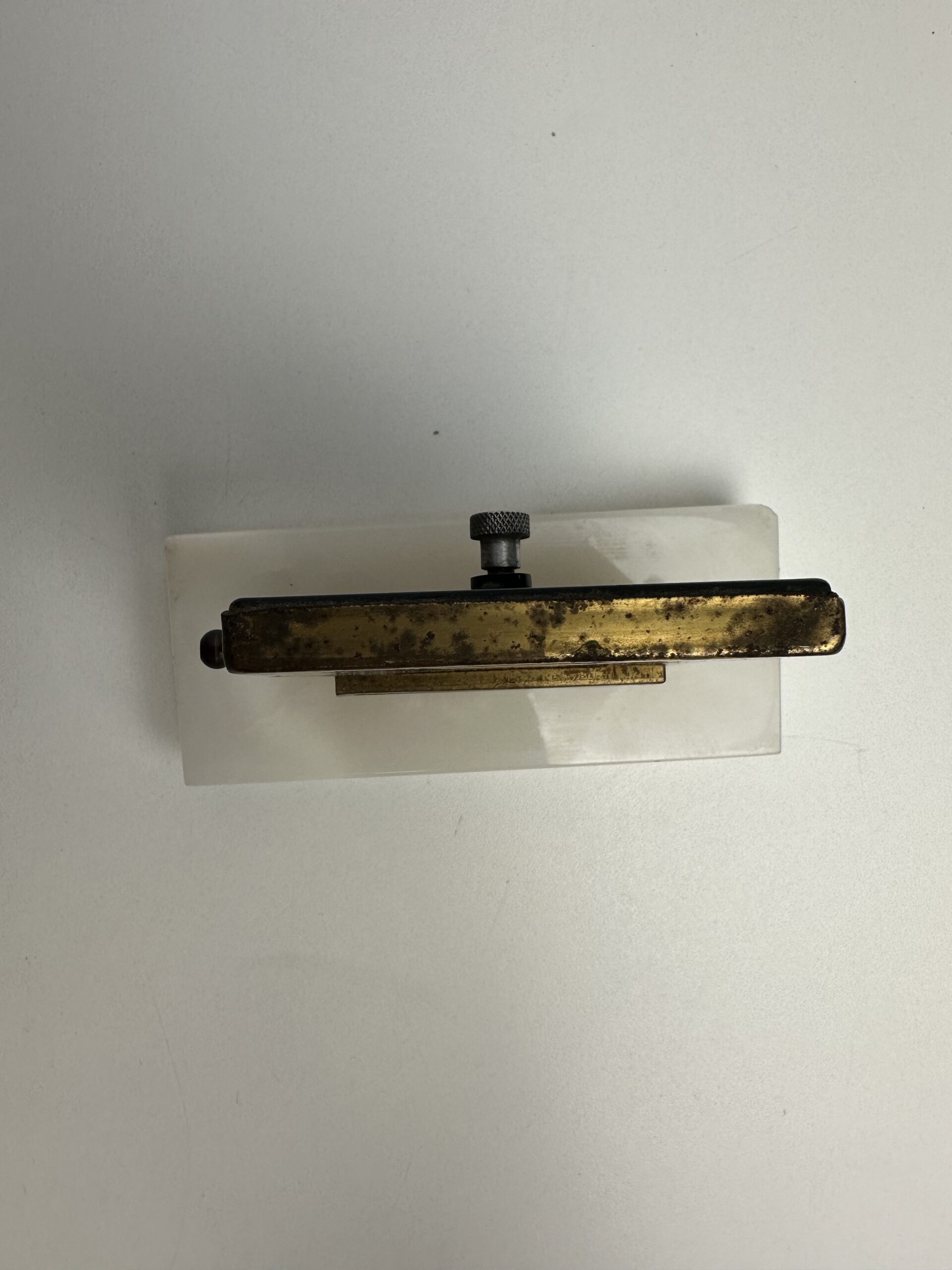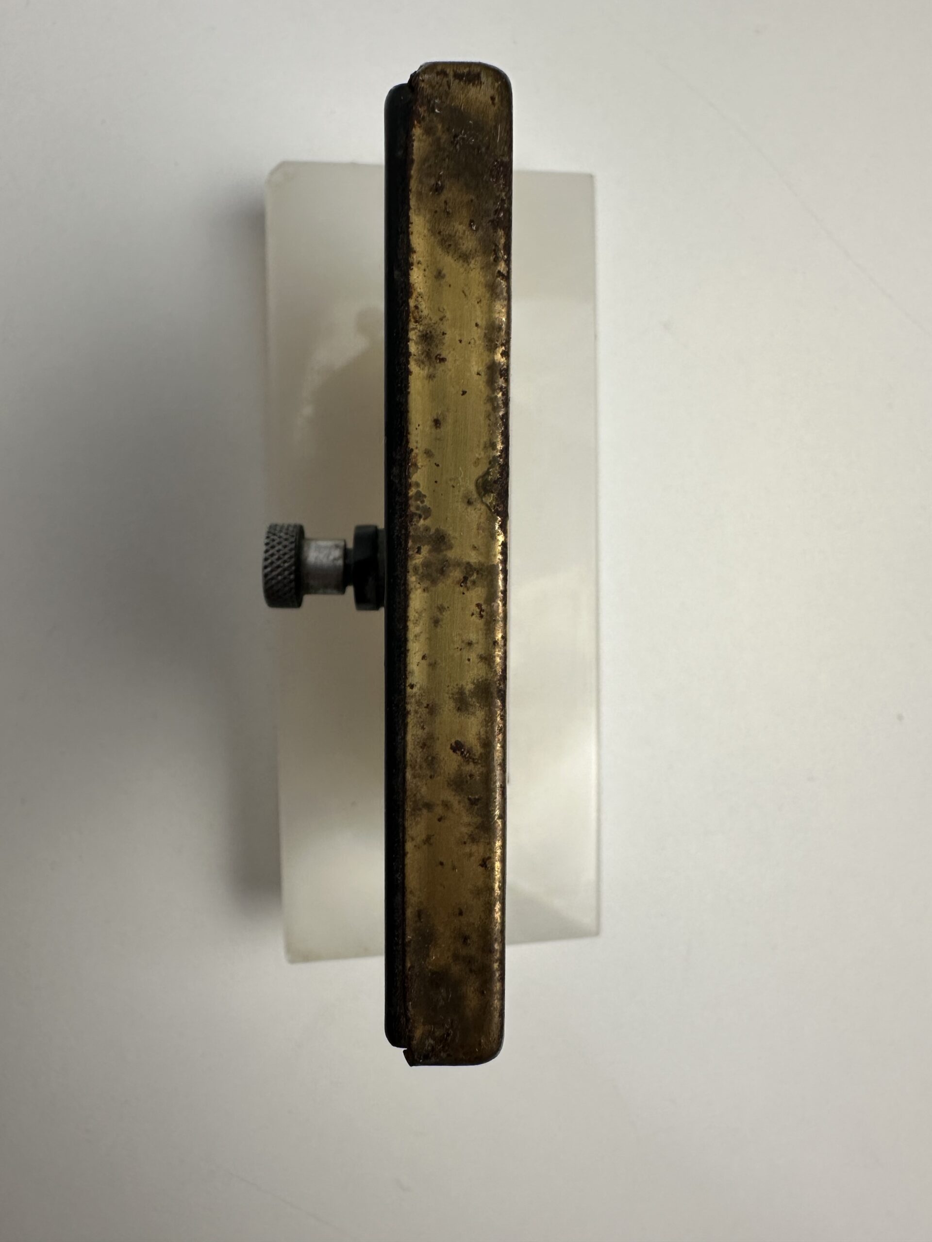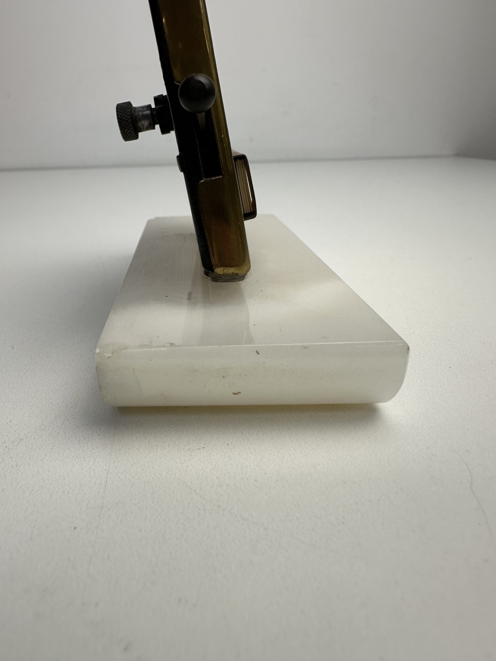 Le calendrier est en laiton, et il est posé sur un socle en pierre, probablement en marbre blanc. Au dos, on lit les initiales MJ pour Jacob Maul. Il n’est pas clairement daté, mais il s’avère plutôt être des années 1930.