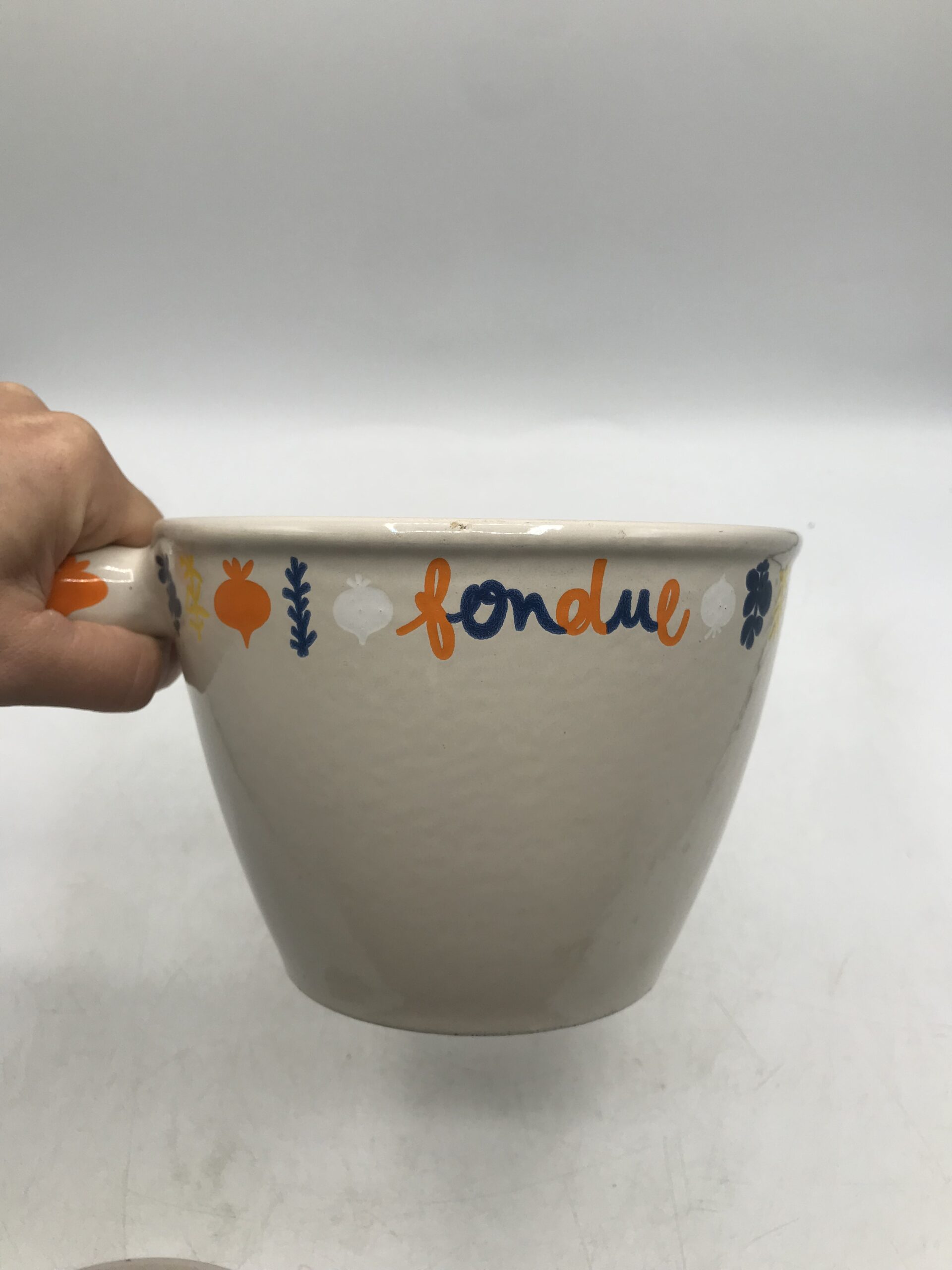 Caquelon à fondue Le creuset vintage. petit caquelon à croquer de chez le creuset, ce modèle est vintage. Il a un diamètre de 16 cm pour une hauteur sans couvercle de 12 cm. Il est en fonte, décoré de motifs naïfs automnales. De couleur crème il passe partout. Il est noté fondue sur le haut de caquelon. Il est en très bon état pas d’éclat et la fonte n’est pas abimée l’émail est intacte. Une jolie pièce à bientôt ressortir pour des soirées conviviales entre amis. Le creuset une marque française de référence.