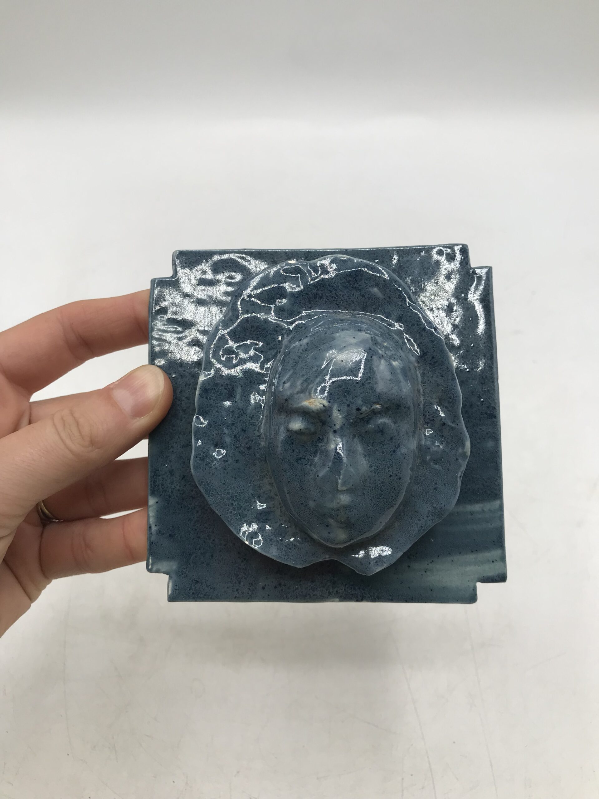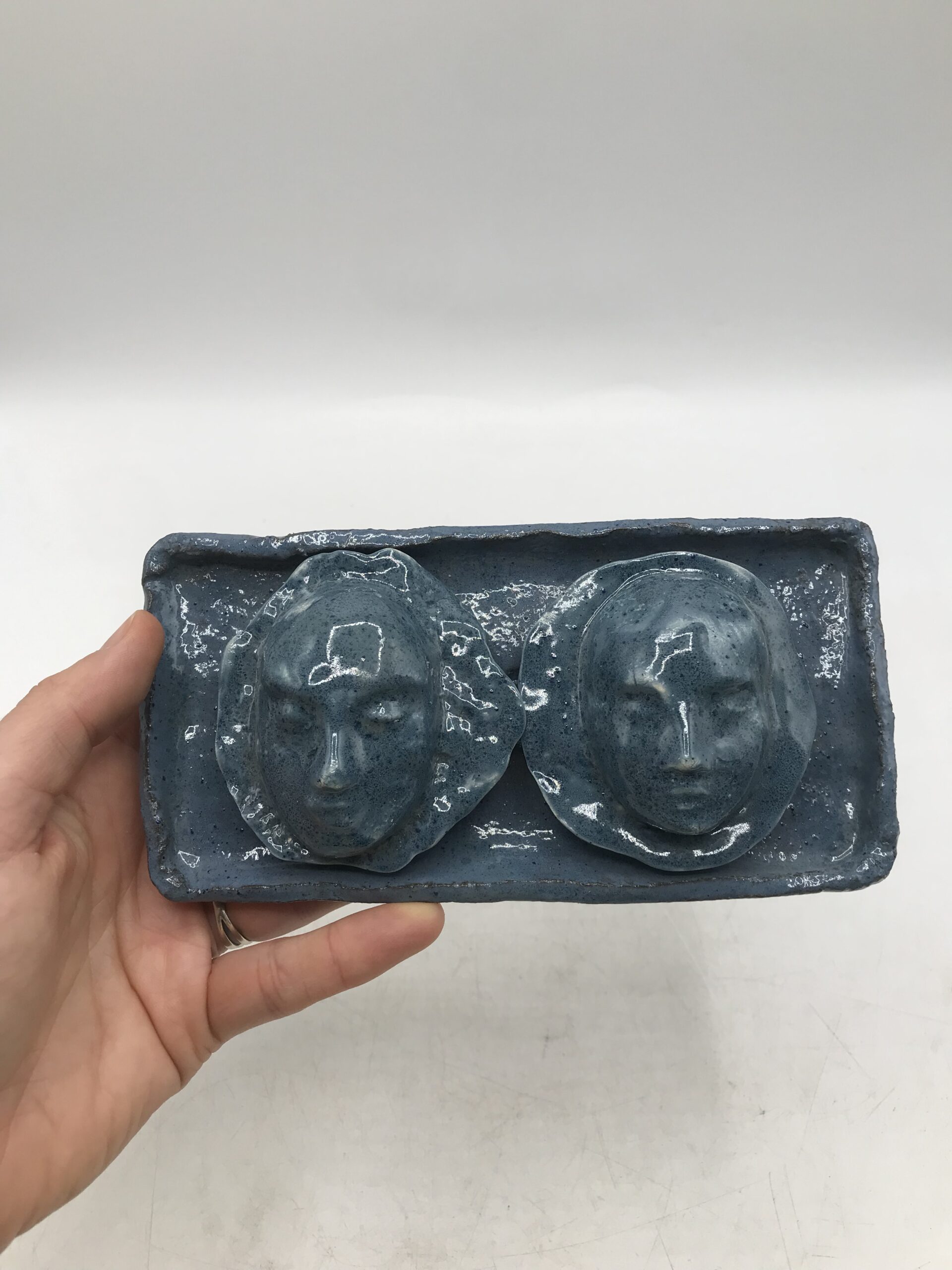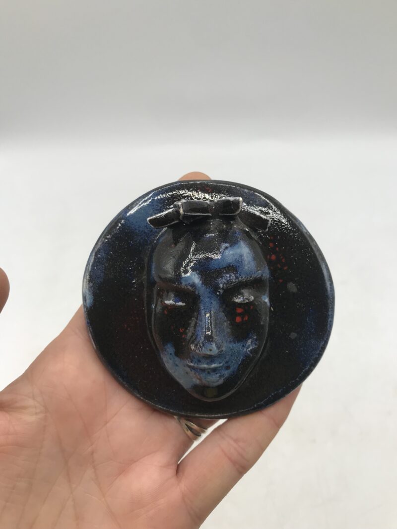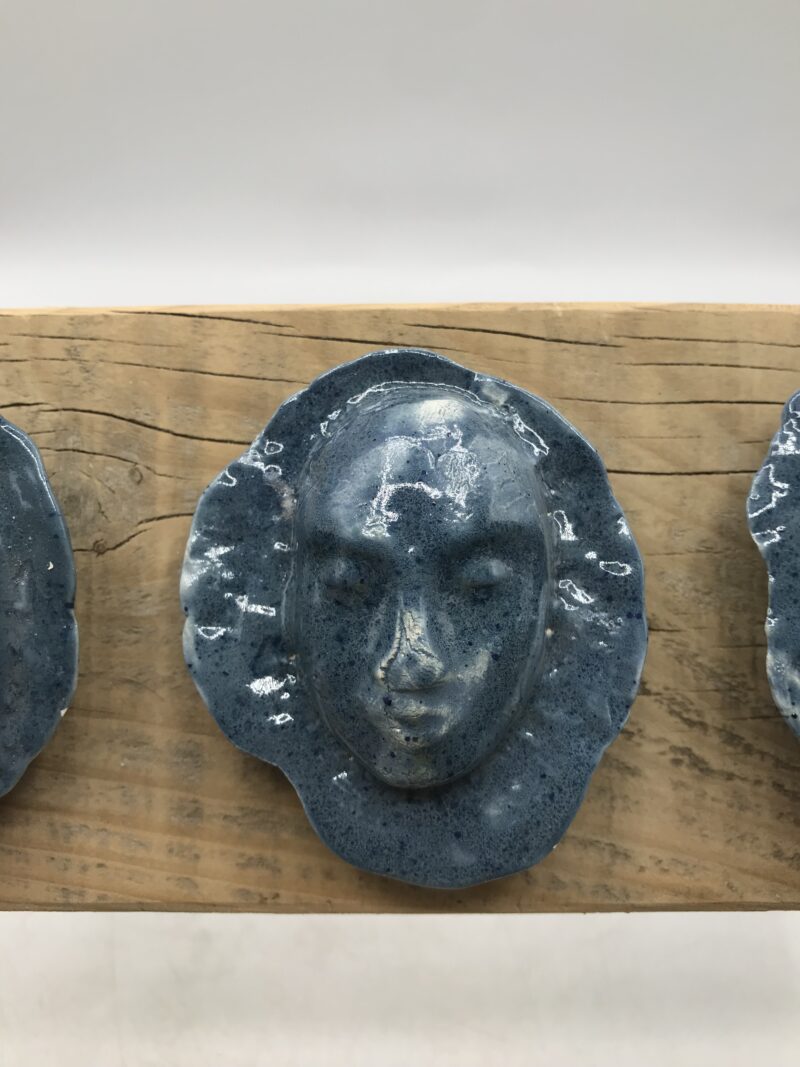 Nous avons en première pièce trois visages en céramique sur un bois flotté. Puis deux visages toujours en céramique sur un cadre de même matière. Dans la même veine un petit cadre avec un visage et pour finir, un visage différent en forme et en teintes. Toutes ces pièces possèdent de quoi les accrocher au mur.
