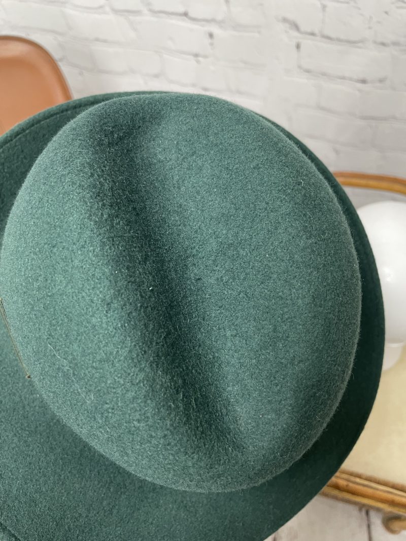 Amoureux de pièces vintage, on a des jolis accessoires à vous proposer comme ce chapeau vintage ! En feutre de couleur vert émeraude, ce joli chapeau de collection est signé du chapelier E. Werlé Paris établi depuis 1903. Décoré d’un ruban large de couleur vert kaki, le chapeau a une jolie forme ovale et ses bords sont repliés à l’arrière pour ajouter une silhouette élégante. En bon état général, ce chapeau élégant est une belle fabrication française !