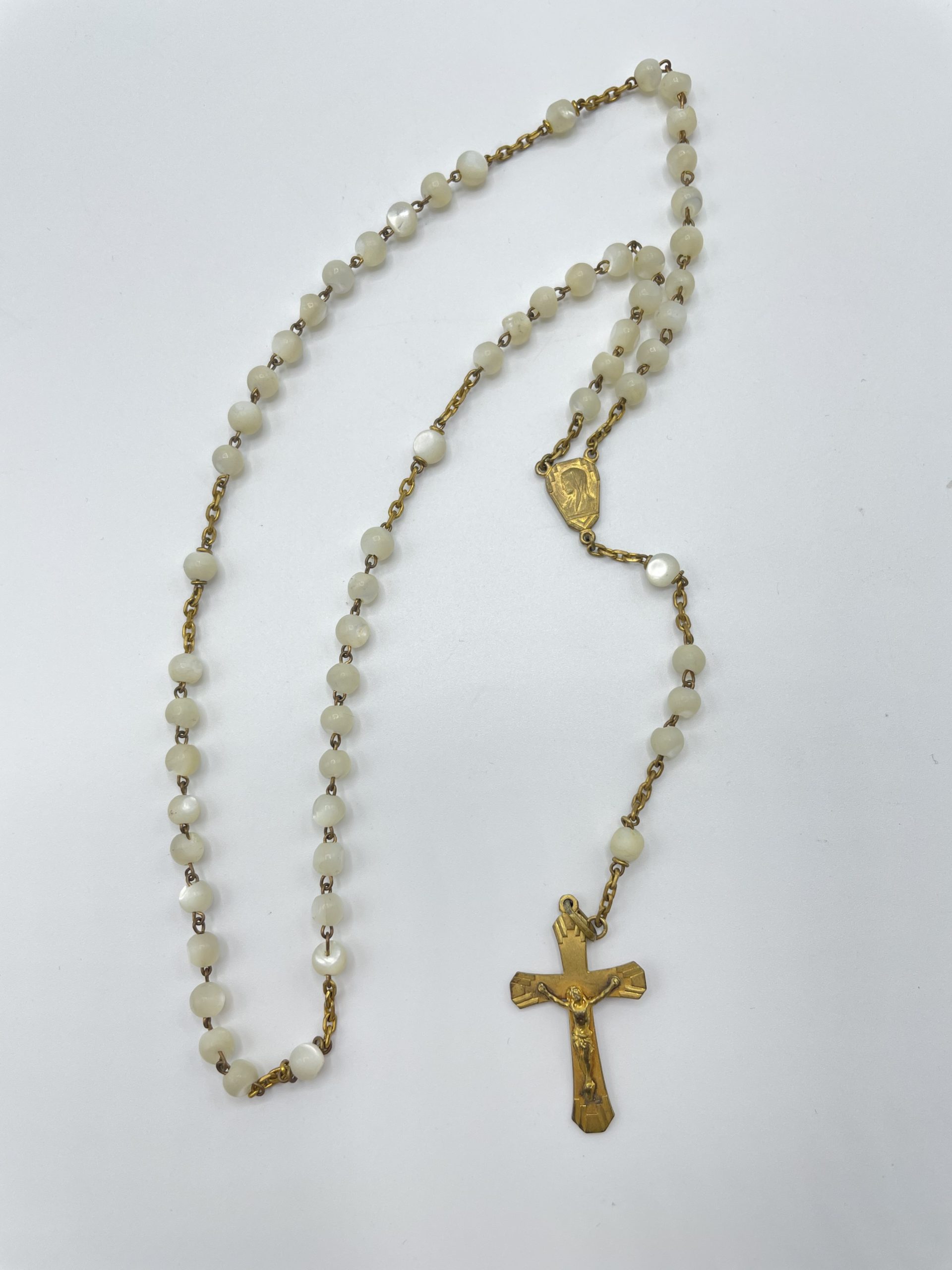 Ce joli chapelet en métal doré est décoré de jolies perles rondes de couleur blanches. La croix représentant le Christ crucifié et la médaille représentant la Vierge Marie sont en métal doré et de style art déco. Porté autour du cou ou accroché à votre rétroviseur ou au mur, ce joli chapelet vous apportera protection.