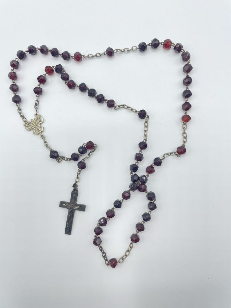 Ce joli chapelet en métal est décoré de jolies perles ciselées de couleur rouge, grenat et bordeaux. La croix représentant le Christ crucifié et la médaille sont en métal. La médaille représente une forme baroque. Porté autour du cou ou accroché à votre rétroviseur ou au mur, ce joli chapelet vous apportera protection.