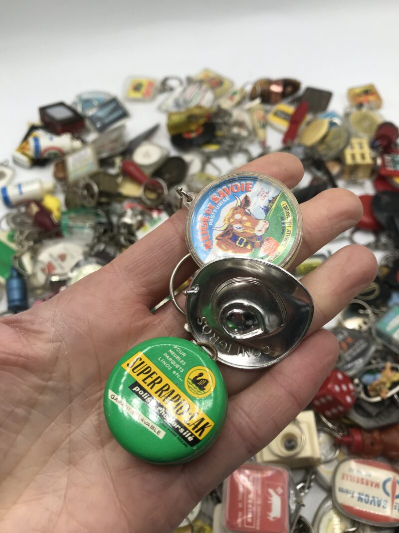 Alerte pépite !!! Collection de 180 portes clés vintage. Voici une super collection de plus de 180 portes clés des années 60. Il y a de tout comme porte clé, des représentations de marques, des lieux, des personnages, des célébrités de l’époque. Les portes clés sont dans leur jus ils ont vécu et portent des marques d’usure du à leur âge (cf photos). Ils sont livrés dans une boite métallique publicitaire de l’époque. Parfait lot pour les collectionneurs de portes clés, vous pourriez trouver quelques pépites pour compléter votre collection. Laisser votre coté collectionneur se régaler, il y a des quoi faire !!!! Avis aux amateurs de vintage et de petits objets anciens. Une bonne heure de tri en vue, mais quel bonheur de s’y plonger.