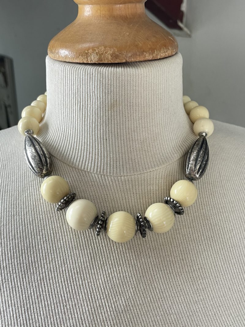 Joli collier vintage fabriqué en Italie. Ce collier qui se porte à hauteur de col est fabriqué avec des perles de couleur crème / beige et des perles métalliques qui lui donnent un style élégant et intemporel. Le fermoir vintage marche parfaitement bien.
