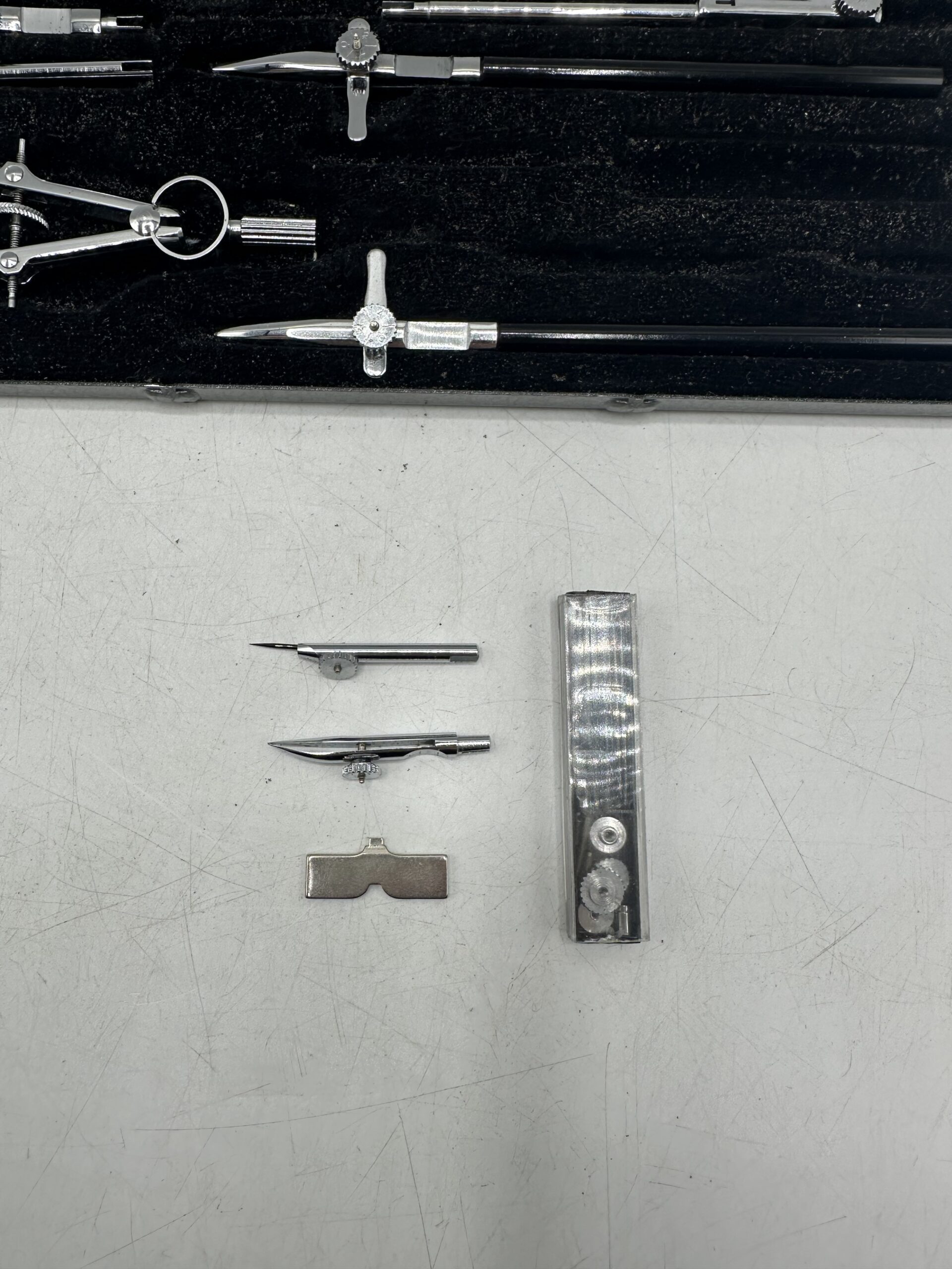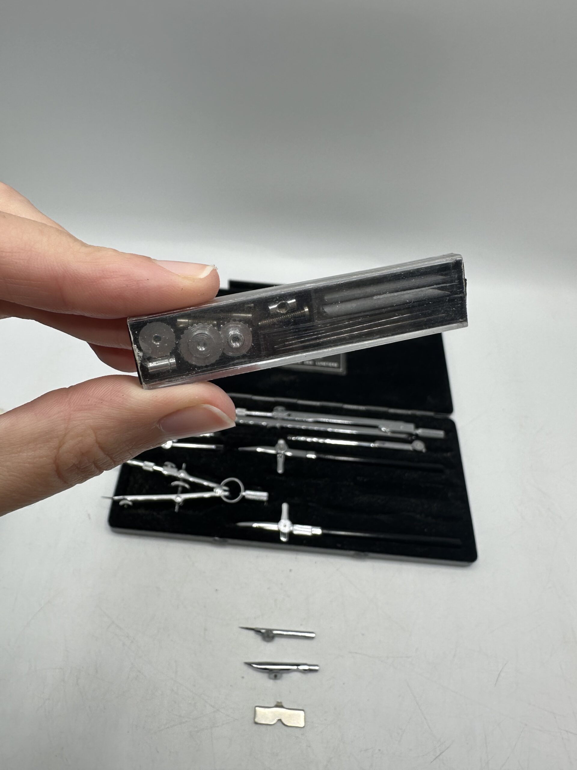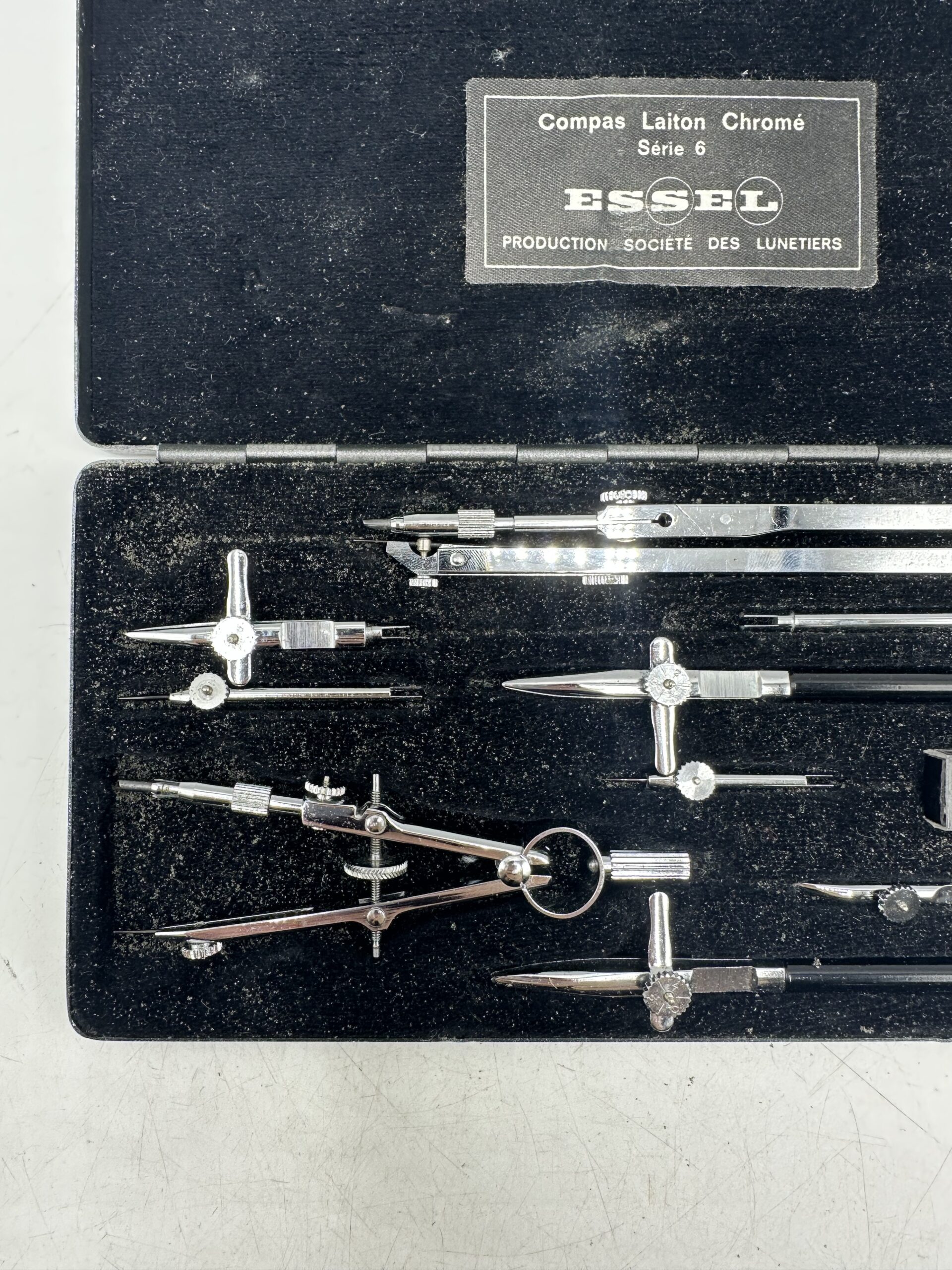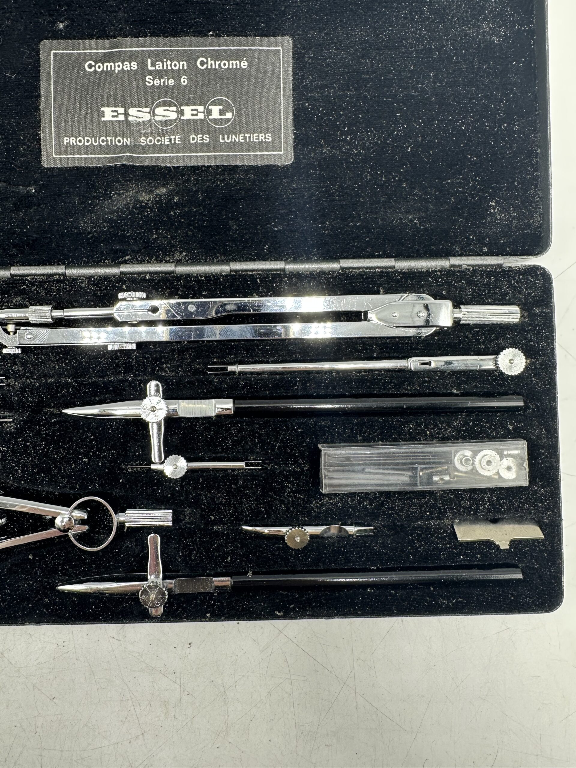 IL s’agit d’un compas ancien, en laiton chromé, et de la marque Essel, série 6. Les coffret et les accessoires sont en très bon état. Je ne suis pas en mesure de dire si le coffret est complet, soyez donc bien attentif aux photos. Cependant il y a bien le compas principal avec pleins d’autres accessoires.