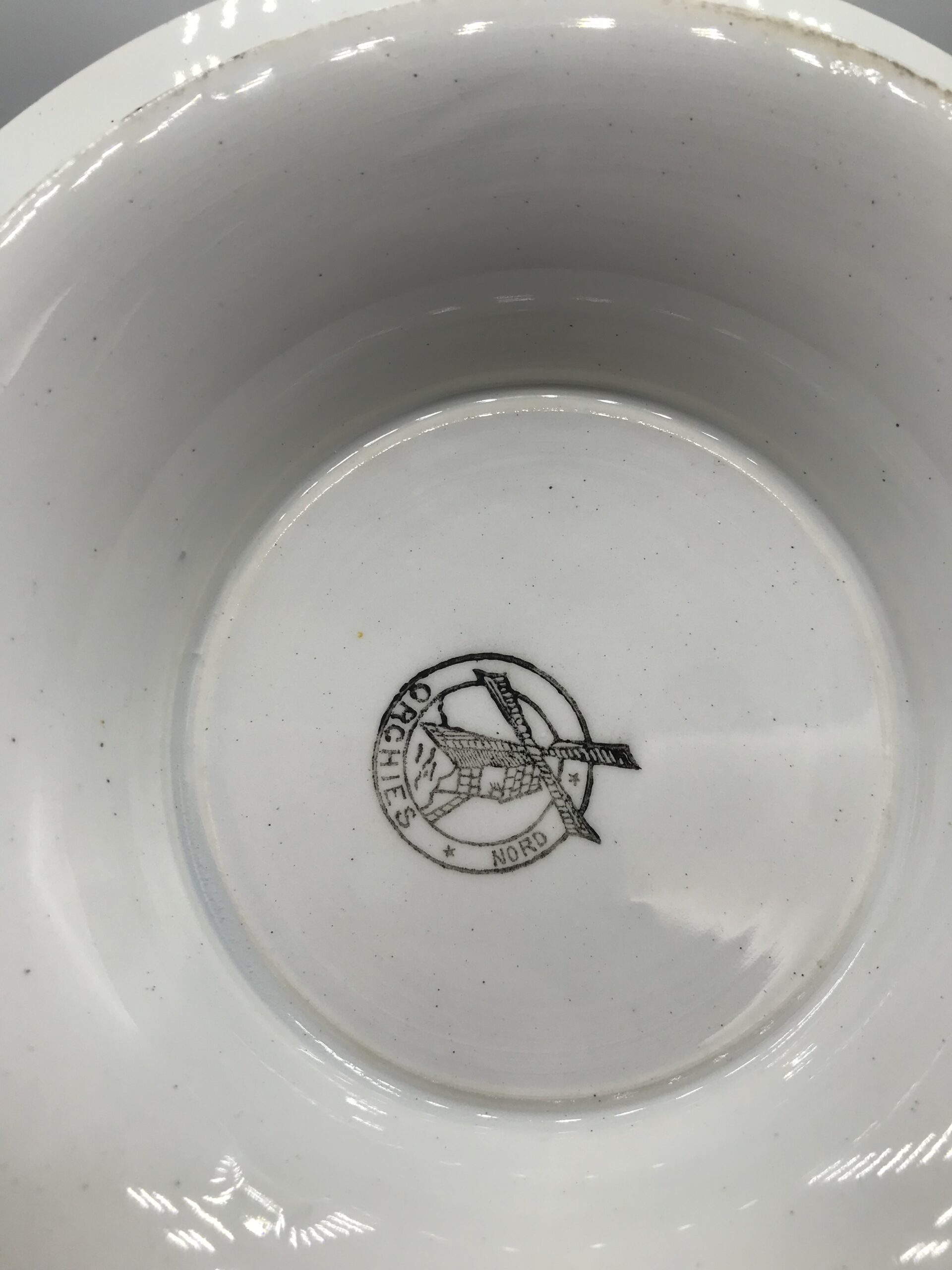 Compotier Moulin des loups Orchies. Joli petit compotier à l’allure vintage. Il est en bon état général pas d’éclat, quelques traces d’usure du au temps (cf photos). Il a un diamètre de 23 cm pour une hauteur de 5,5 cm. Signé Moulin des loups Orchies il est de couleur blanc avec une frise aux teintes jaune et rouge bordeaux qui donne le LA niveau décoration de table. Une belle pièce forte qui fera un merveilleux centre de table. Parfait pour mettre en valeur vos mets les plus délicats, il étonnera, et attisera la convoitise de vos convives. Un allié de taille lors de votre dressage de table. Un charme d’antan si tendance.
