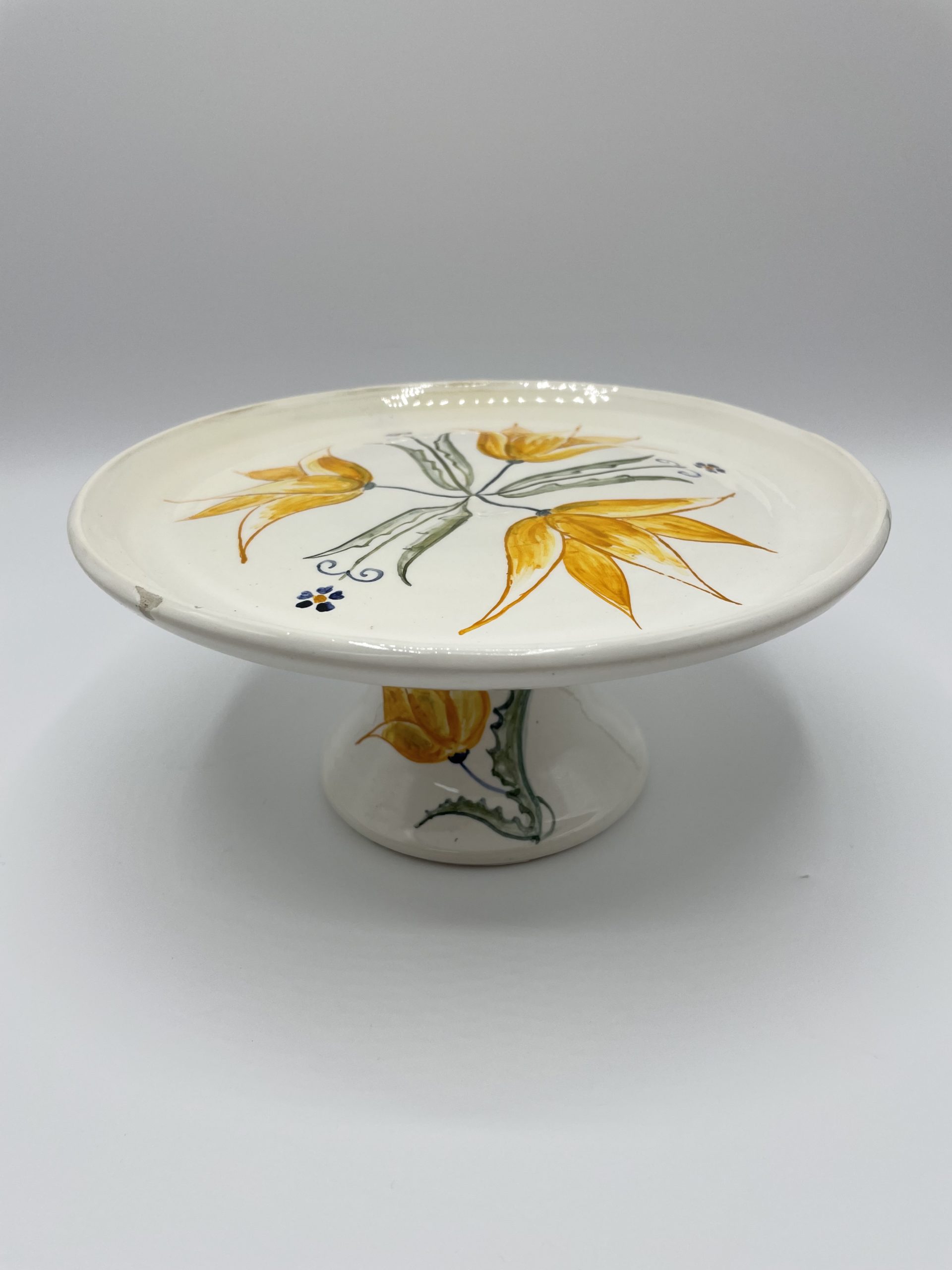 Ce joli compotier vintage est signé SALLES. D’une jolie couleur blanc cassé, le compotier est décoré avec de jolis motifs de fleurs jaunes et bleues sur le plateau et sur le pied. Quelques traces d’usure sont à prévoir (cf photos) jolies marques du temps passé. Creux, ce joli compotier est parfait pour présenter un gâteau, comme coupe de fruits, ou bien détournée comme un objet déco pour vos bougies, vos plantes ou encore comme vide poche !