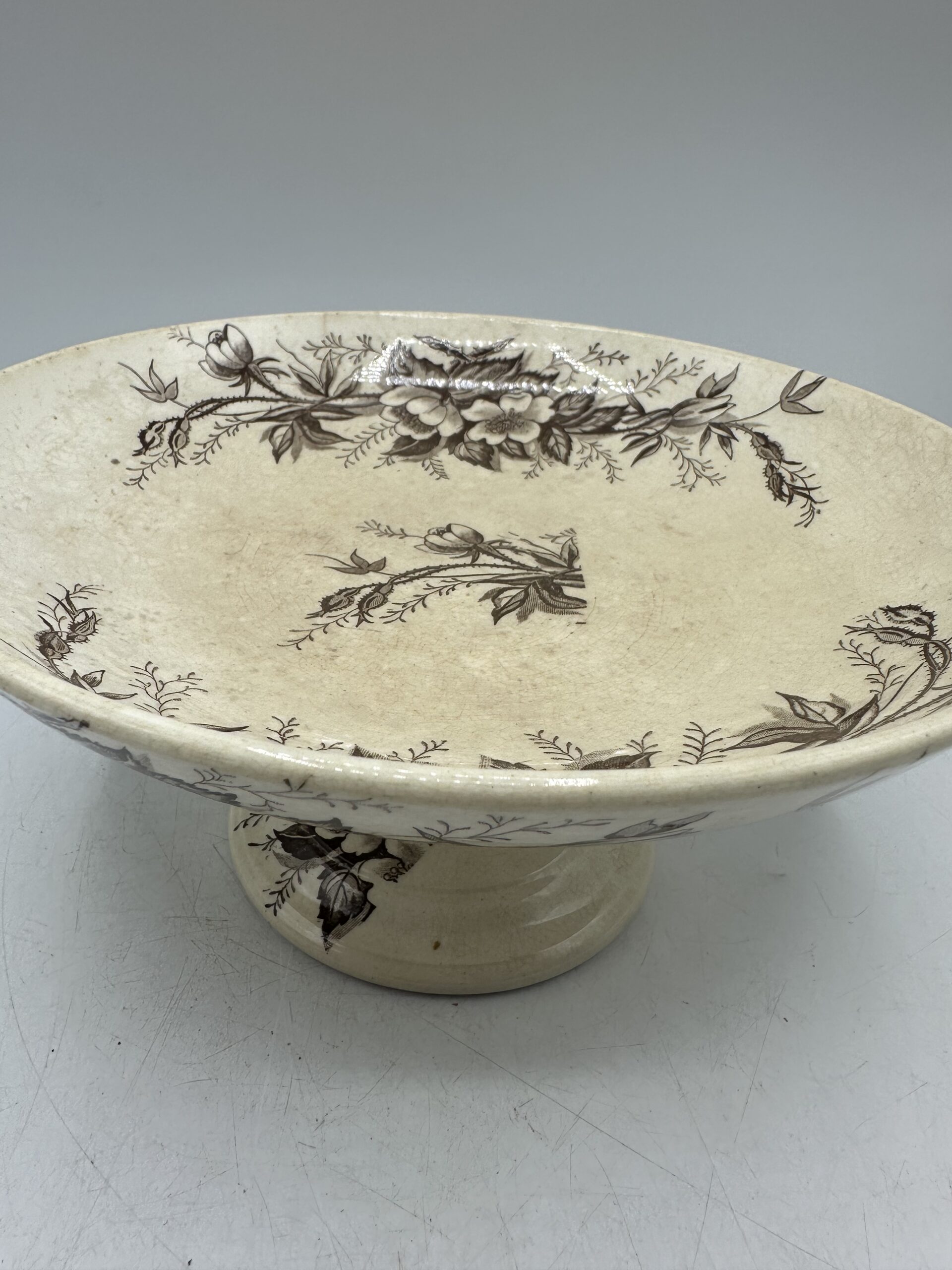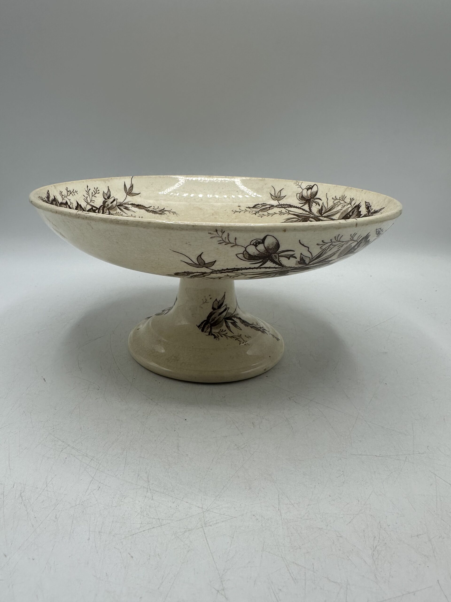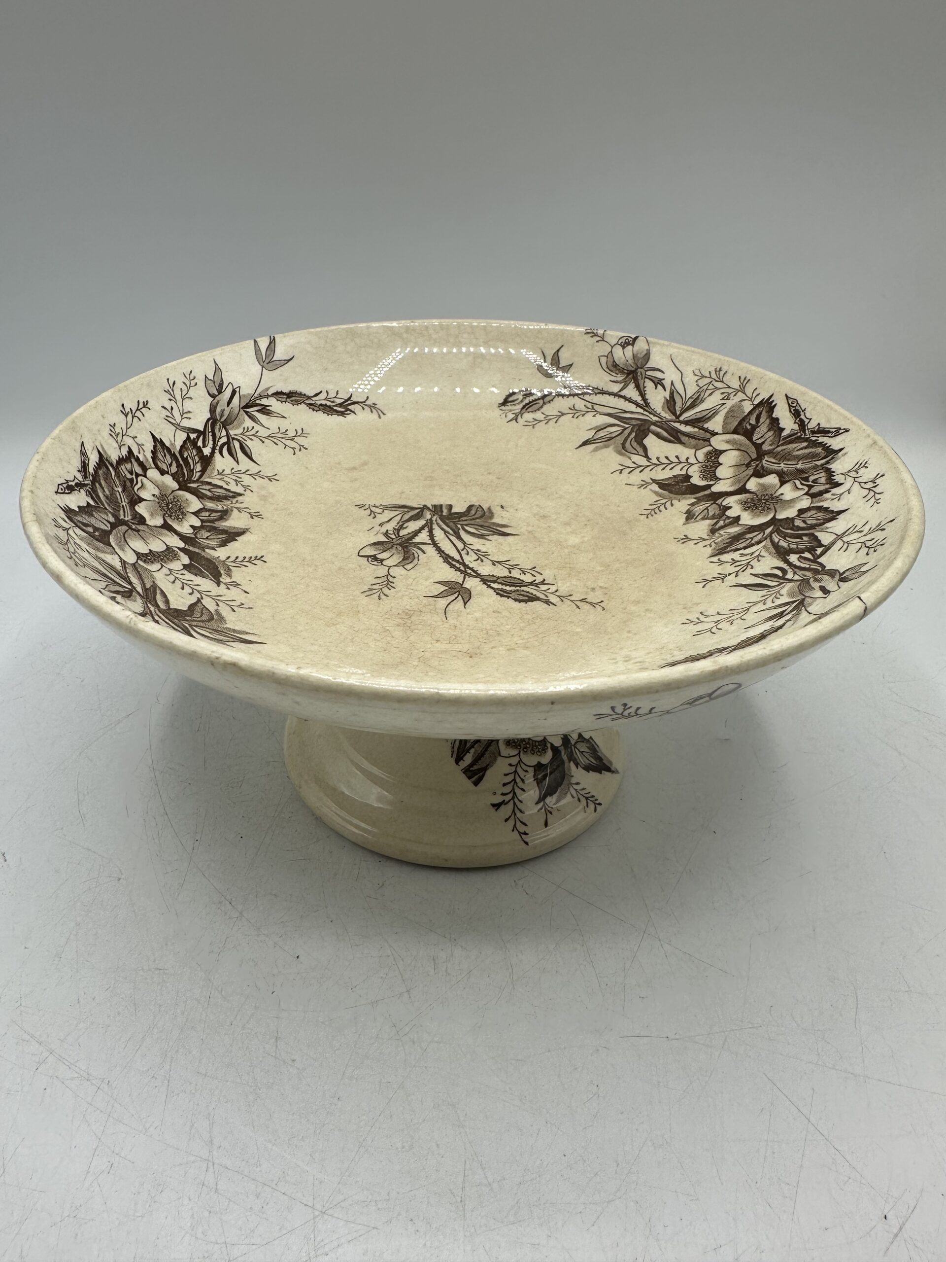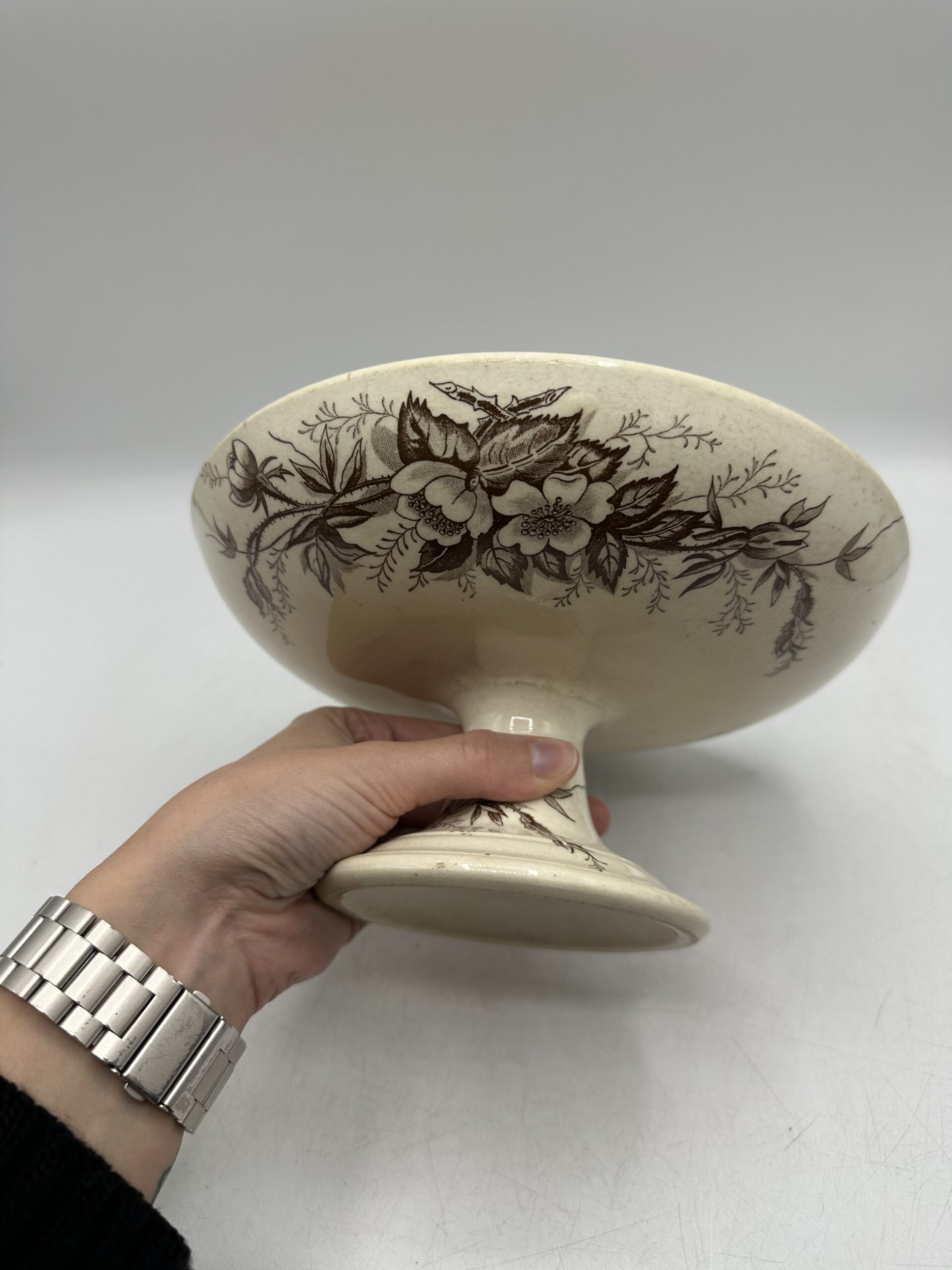 Avec ses motifs monochrome marron et sa patine, ce compotier est une vraie pépite ! En guise de décoration au centre d’une table ou dans une cuisine. Ou bien pour y mettre des biscuits, fruits ou gâteau, il saura trouver sa place.