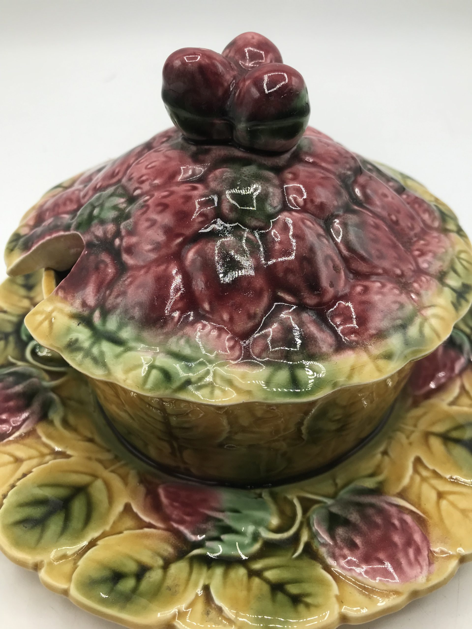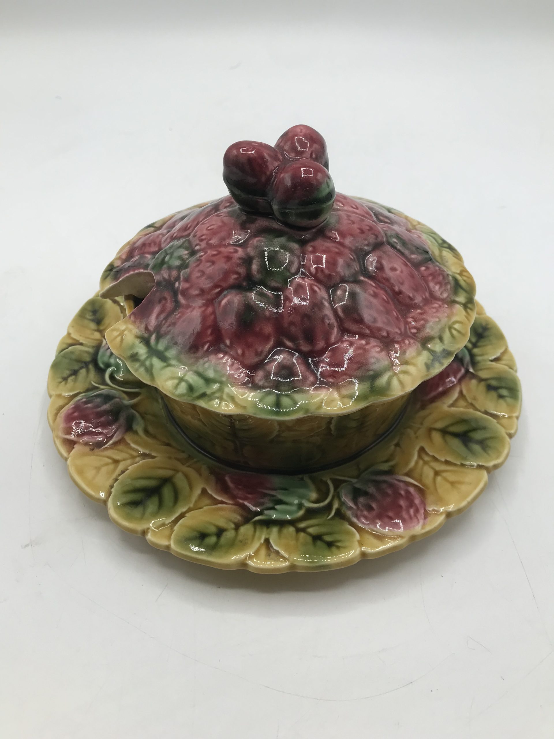 Confiturier en barbotine faïence Sarreguemines. Un joli petit contenant plein de charme orné de multitudes de petites fraises qui nous invitent à la gourmandise. Un note de douceur sucré de retour à l’enfance. Il présente un éclat sur un coté (cf photos).