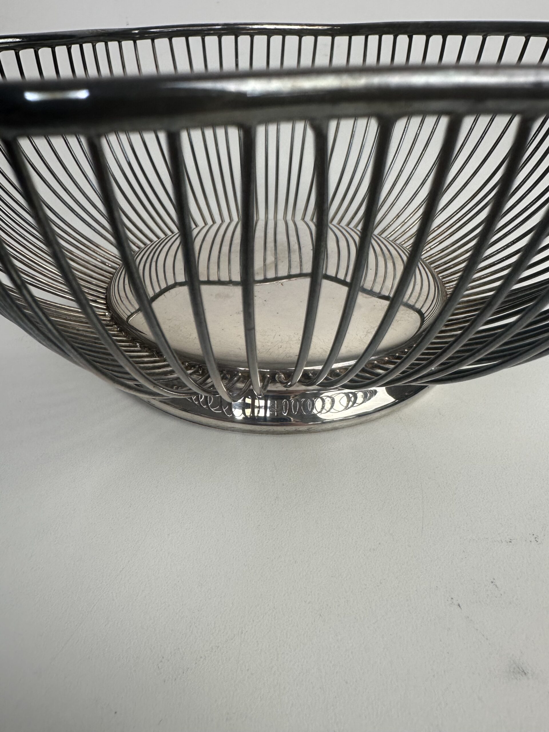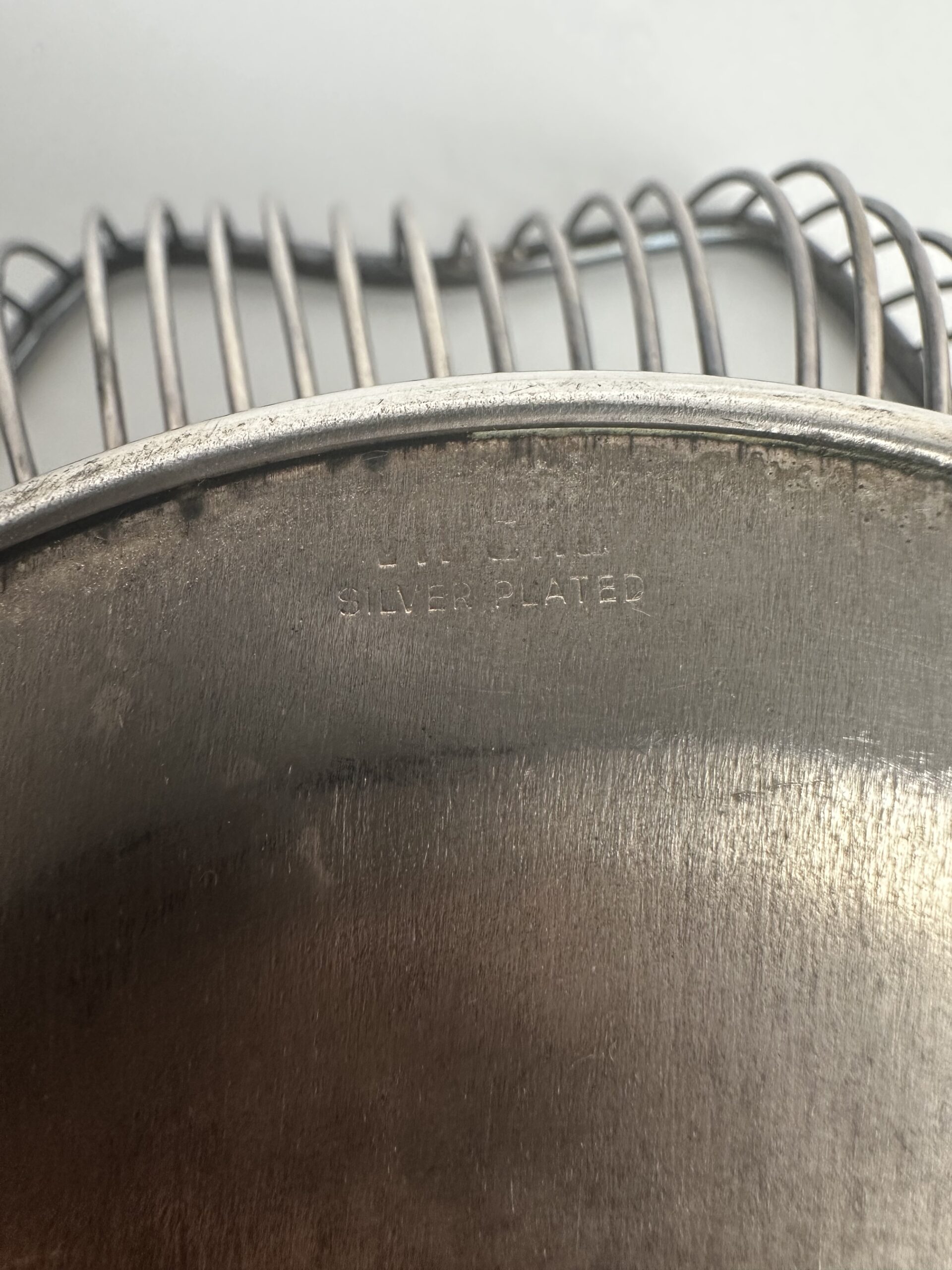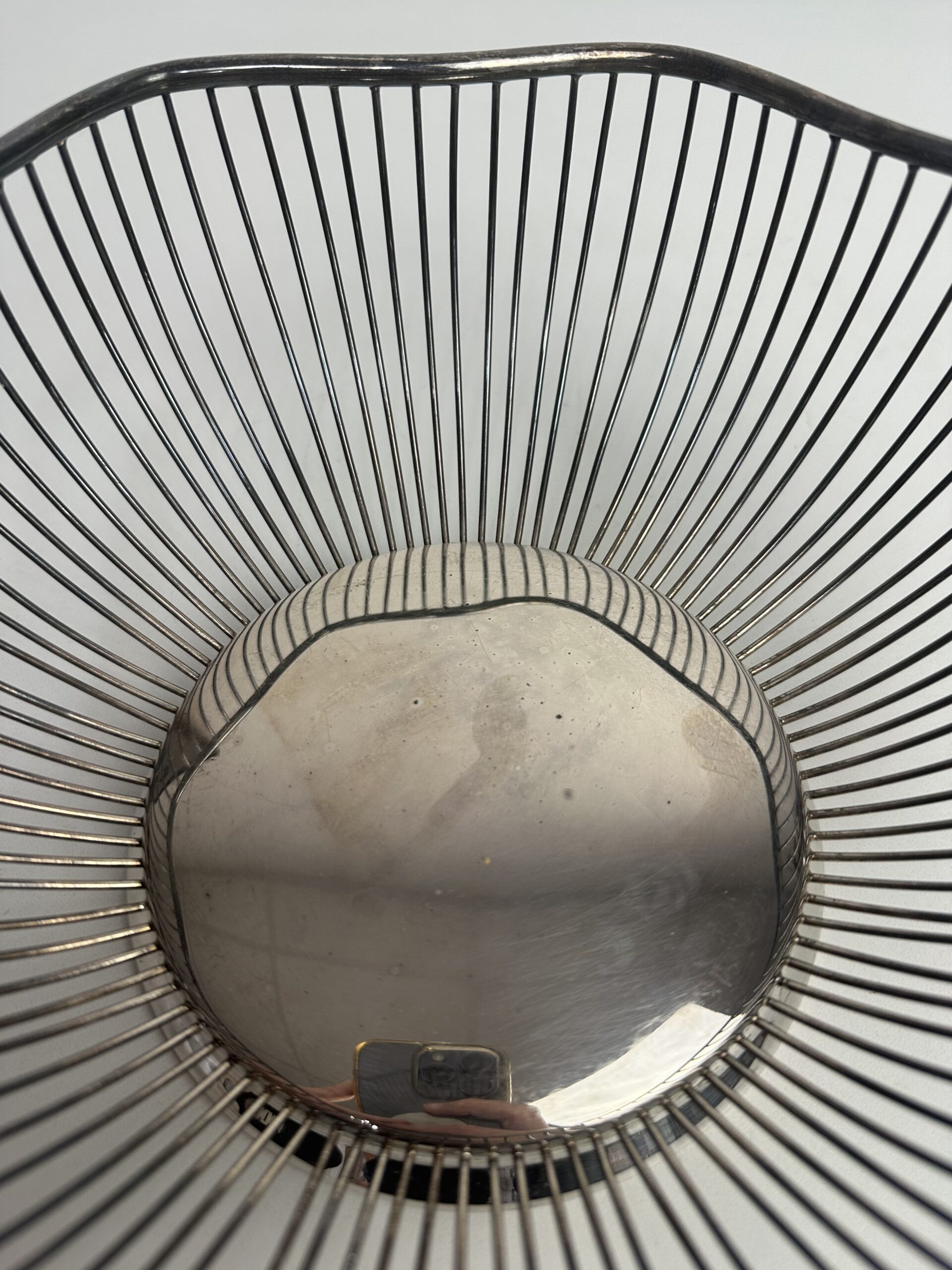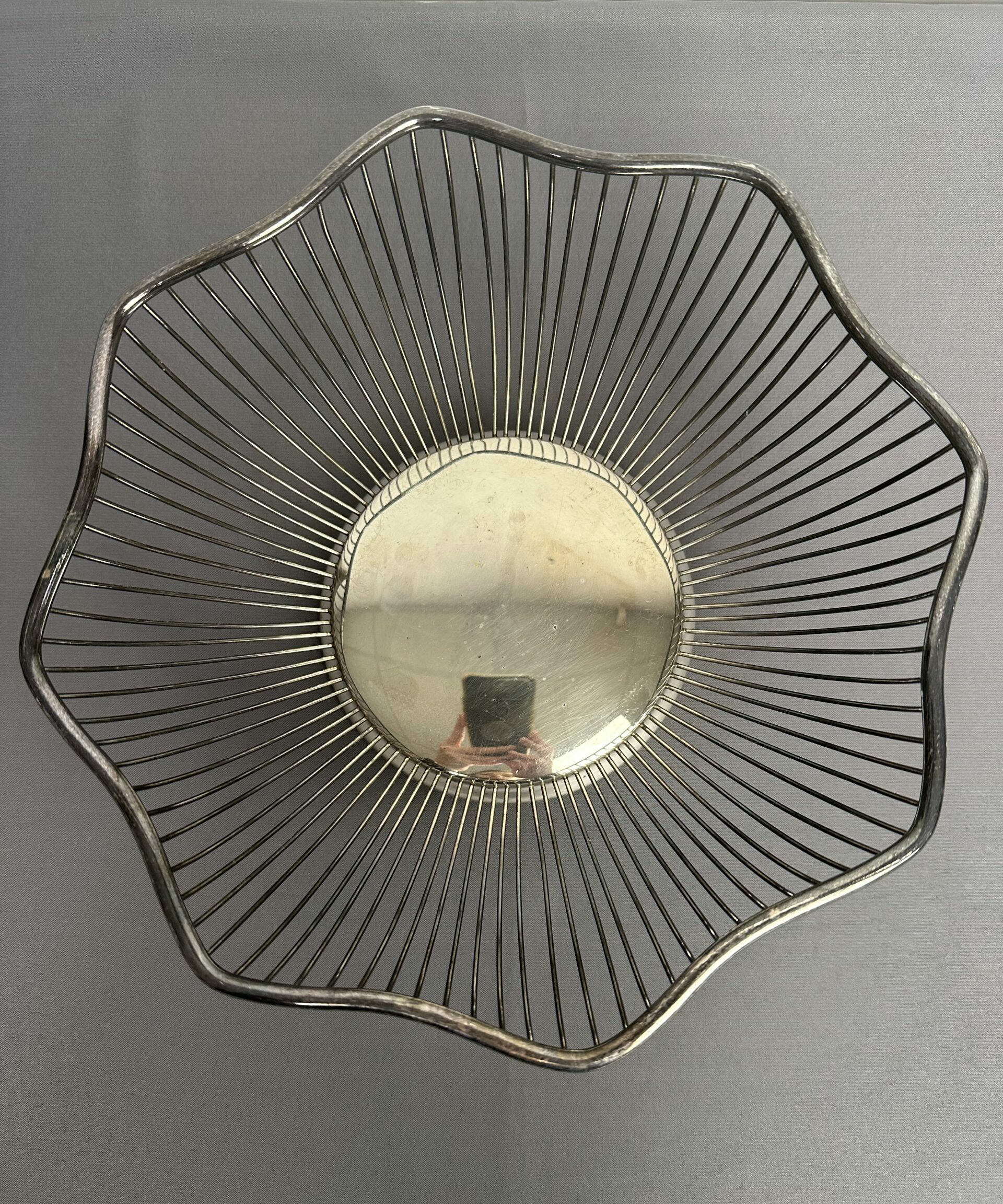 Cette jolie petite corbeille est en forme de fleur. Sur le dessous il y a la mention « silver plated » avec une signature difficilement lisible juste au dessus. Le métal à noirci, il faudra prévoir un petit nettoyage pour lui redonner tout son éclat.