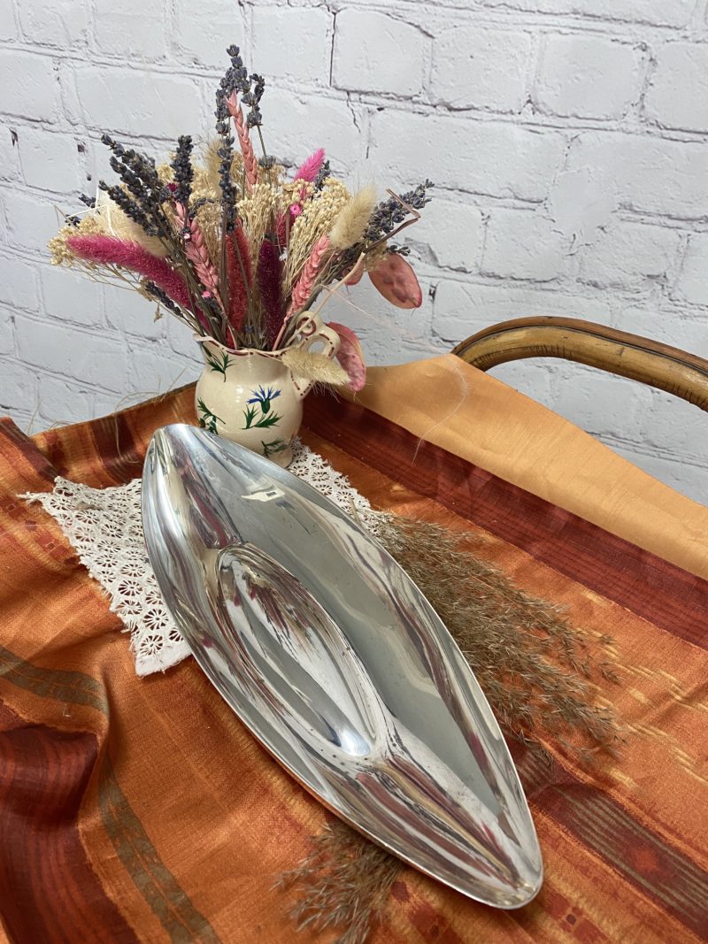 Ce plat en métal argenté est un plat de collection. Signé Christofle, il s’agit d’une jolie coupe en forme de navette designée par Lino Sabattini et faisant partie de la collection Gallia pour Christofle. Poinçonnée en dessous, la coupe présente quelques traces d’usure (cf photos) jolies marques du temps passé. Une sublime coupe design qui pourra servir de vide poche, de coupe à fruits ou encore d’objet design pour votre déco !