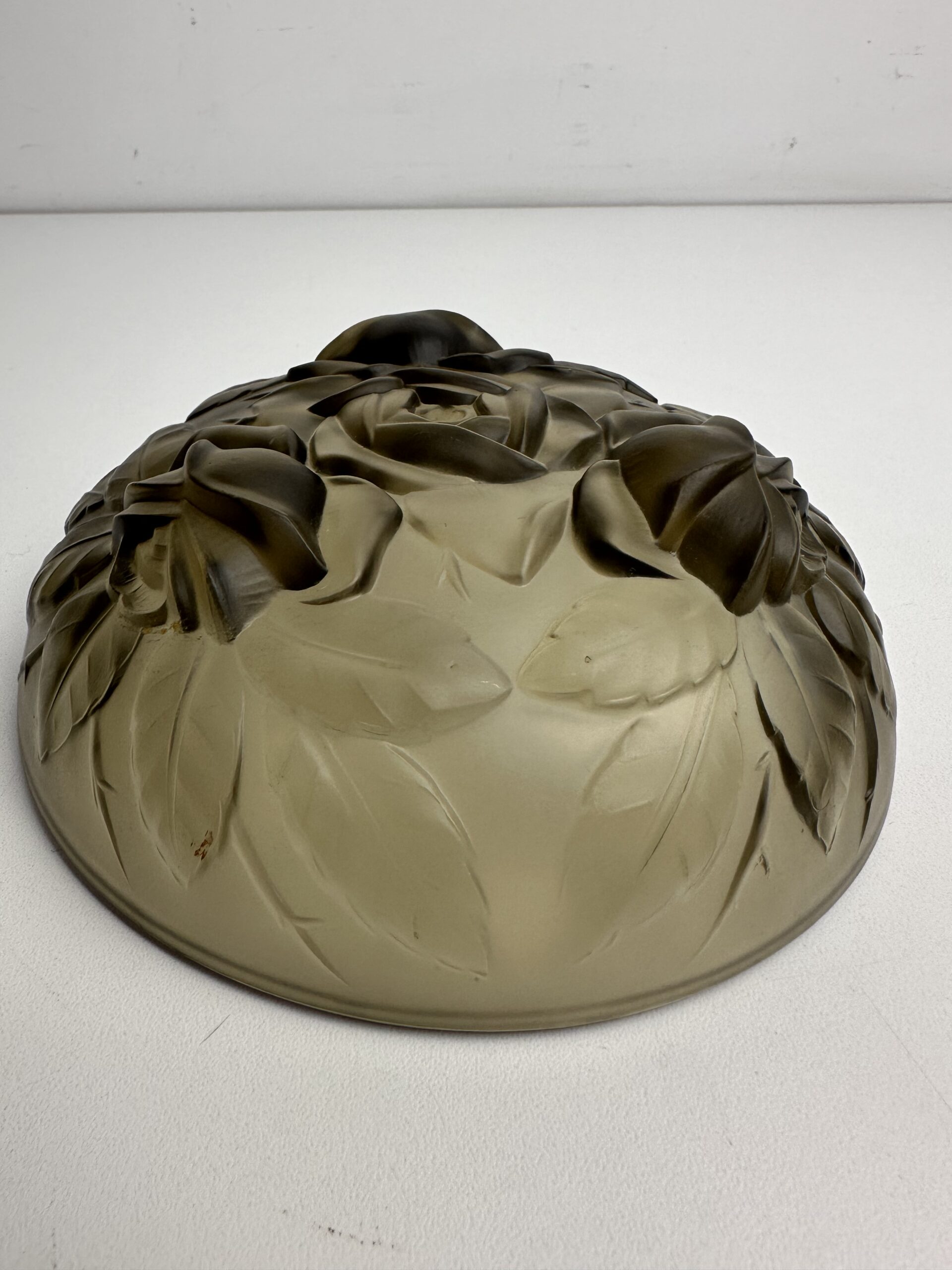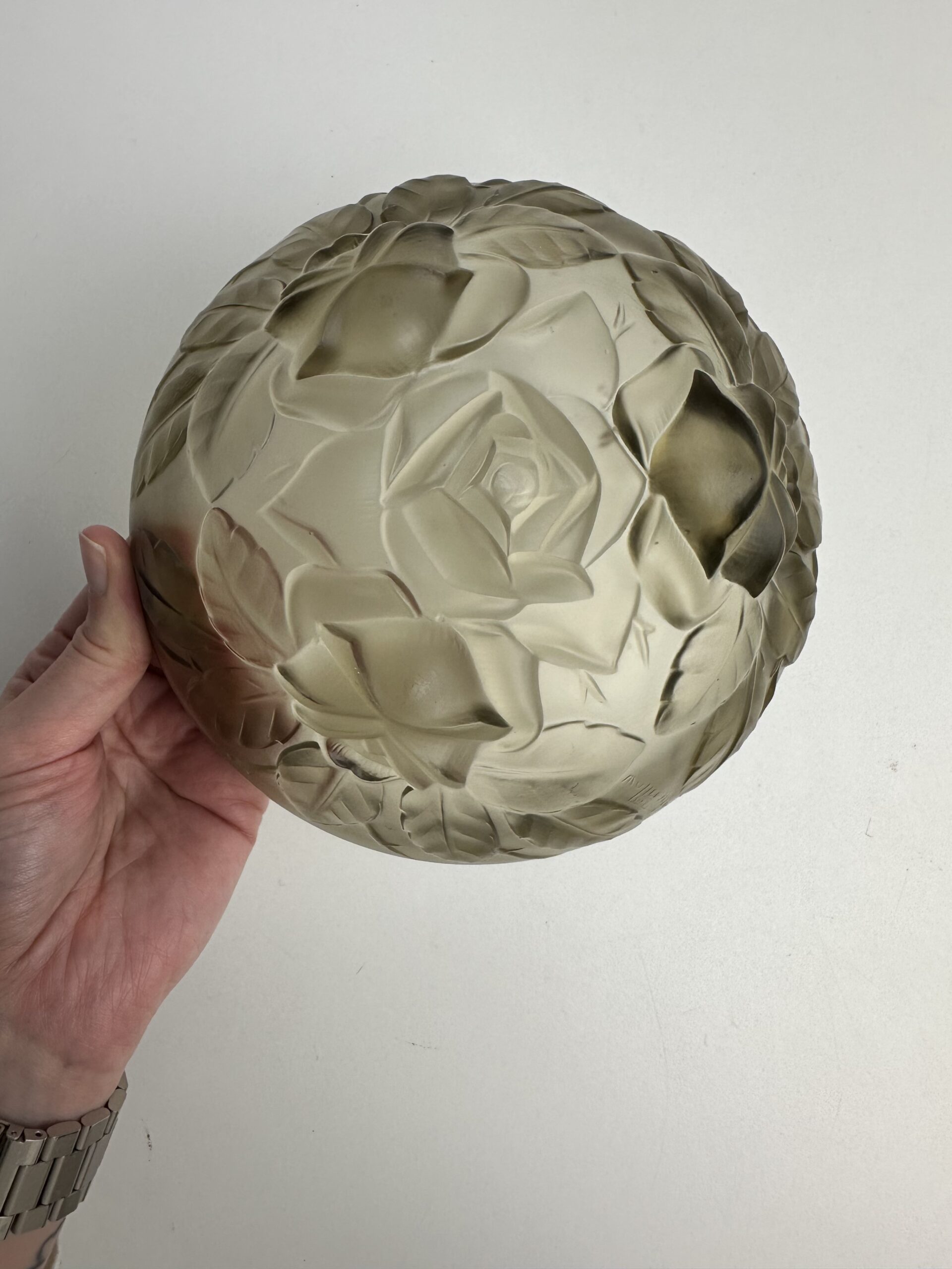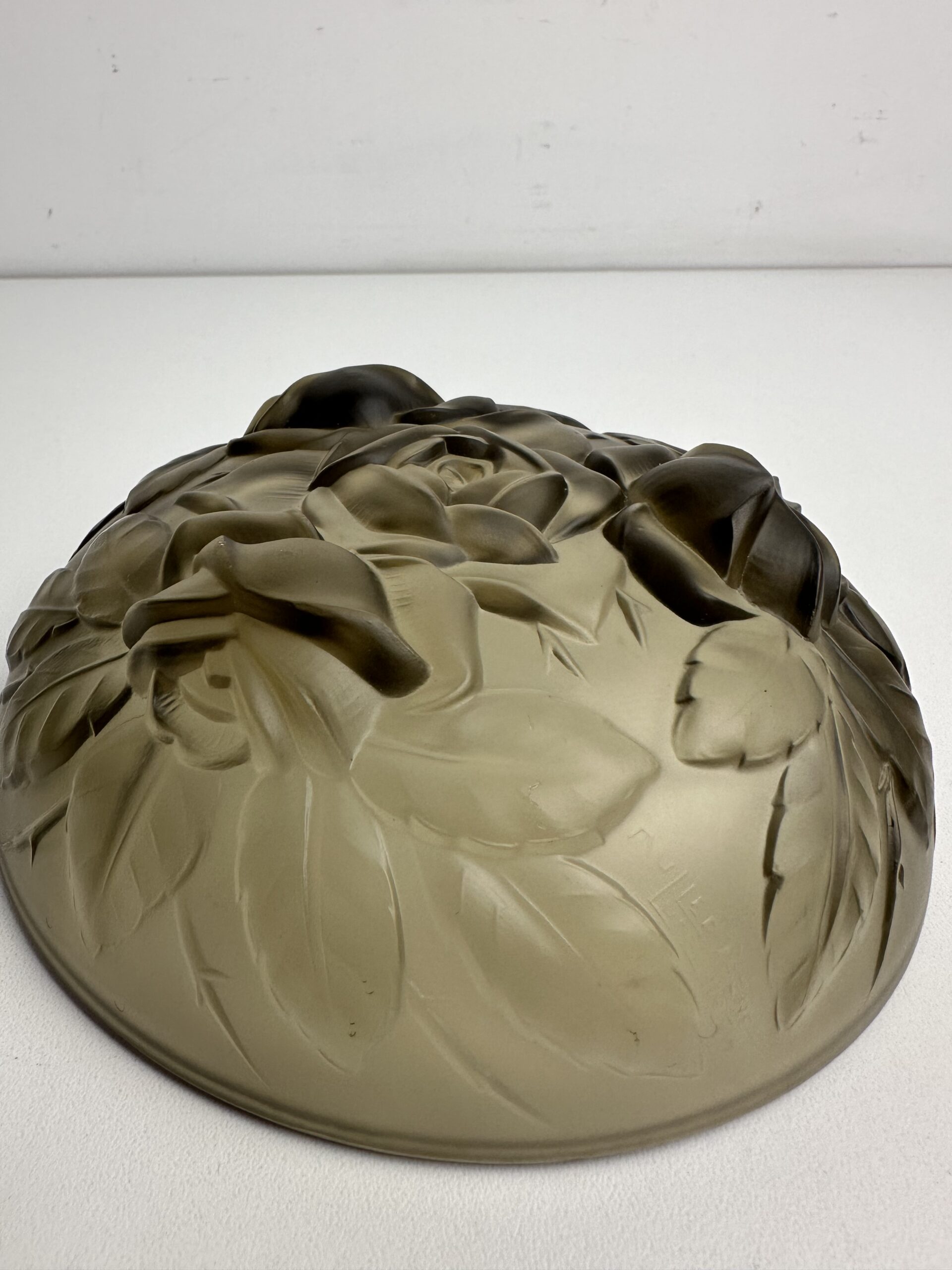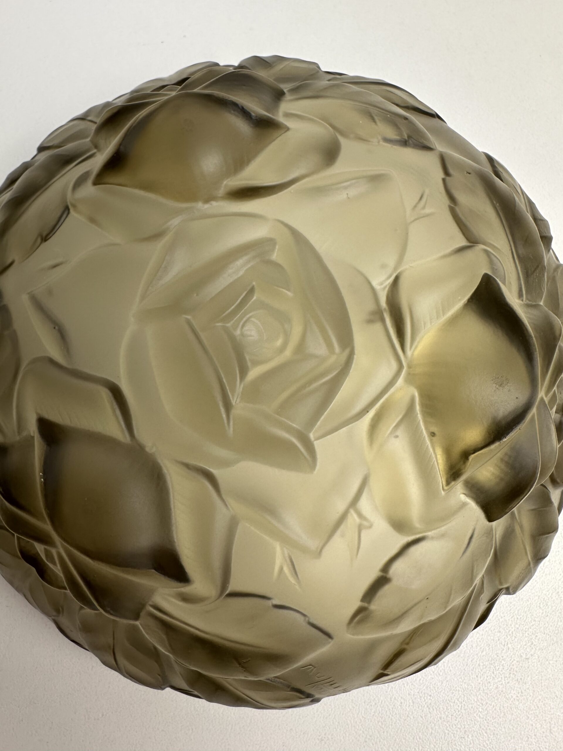 Muller Frères Lunéville, maison emblématique de la verrerie française du début du XXᵉ siècle est réputée pour la qualité de ses créations en verre moulé et pressé. Cette pièce se distingue par son délicat décor floral de roses, finement travaillé en relief sur toute la surface extérieure.