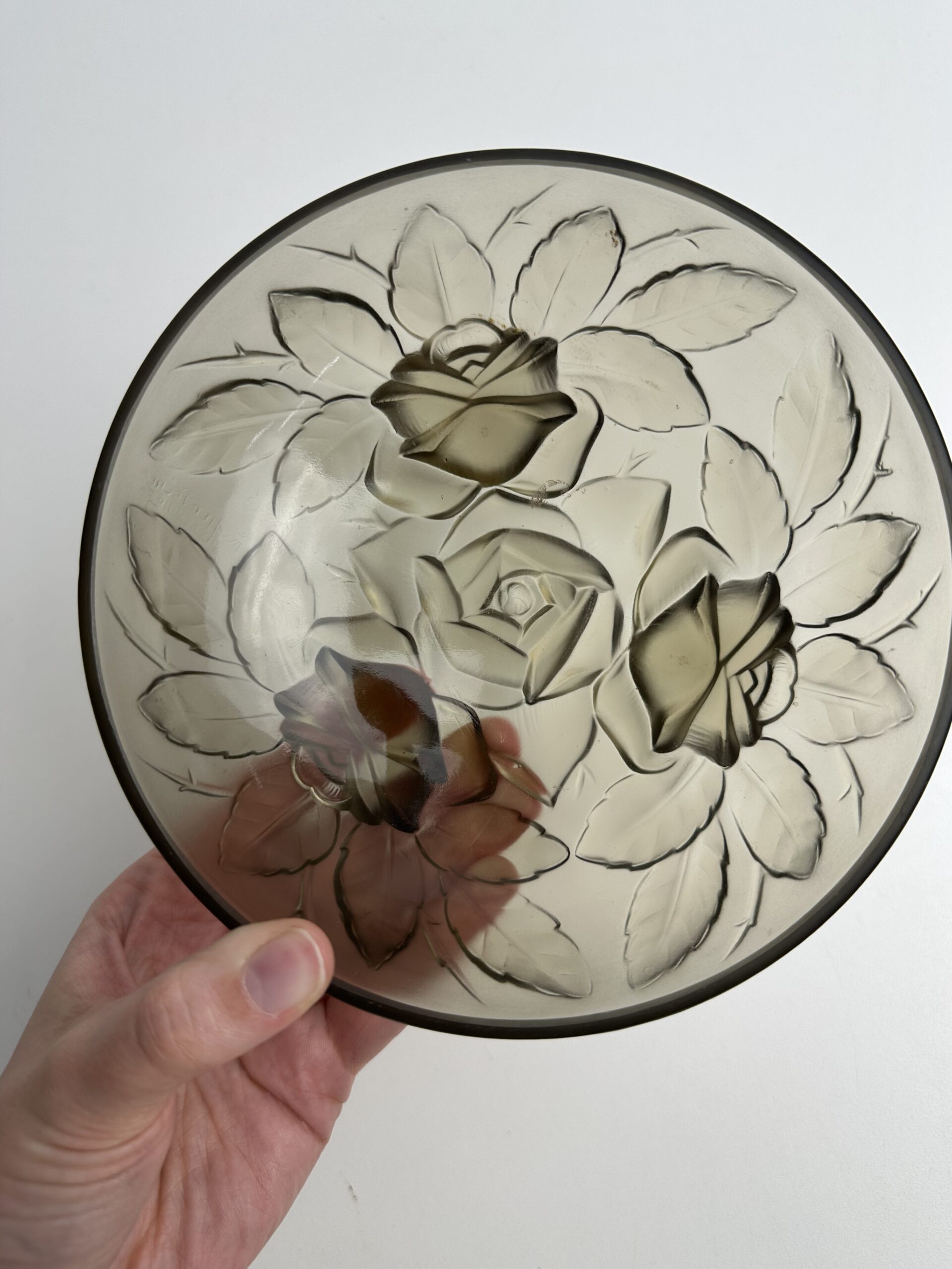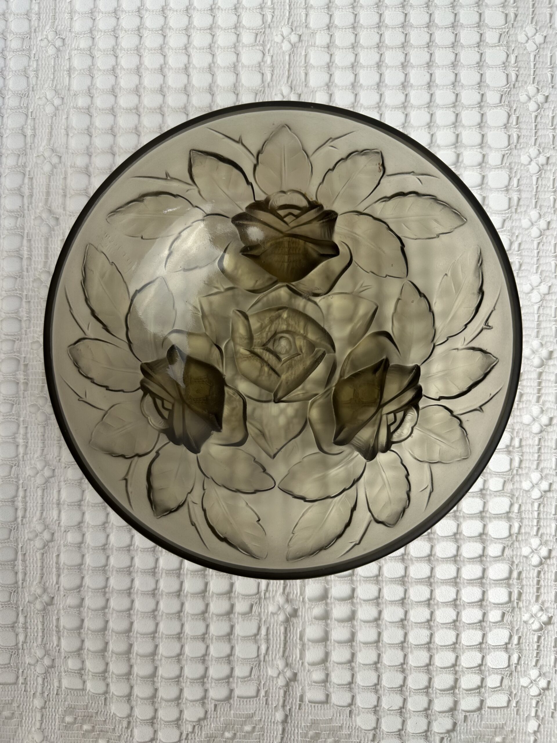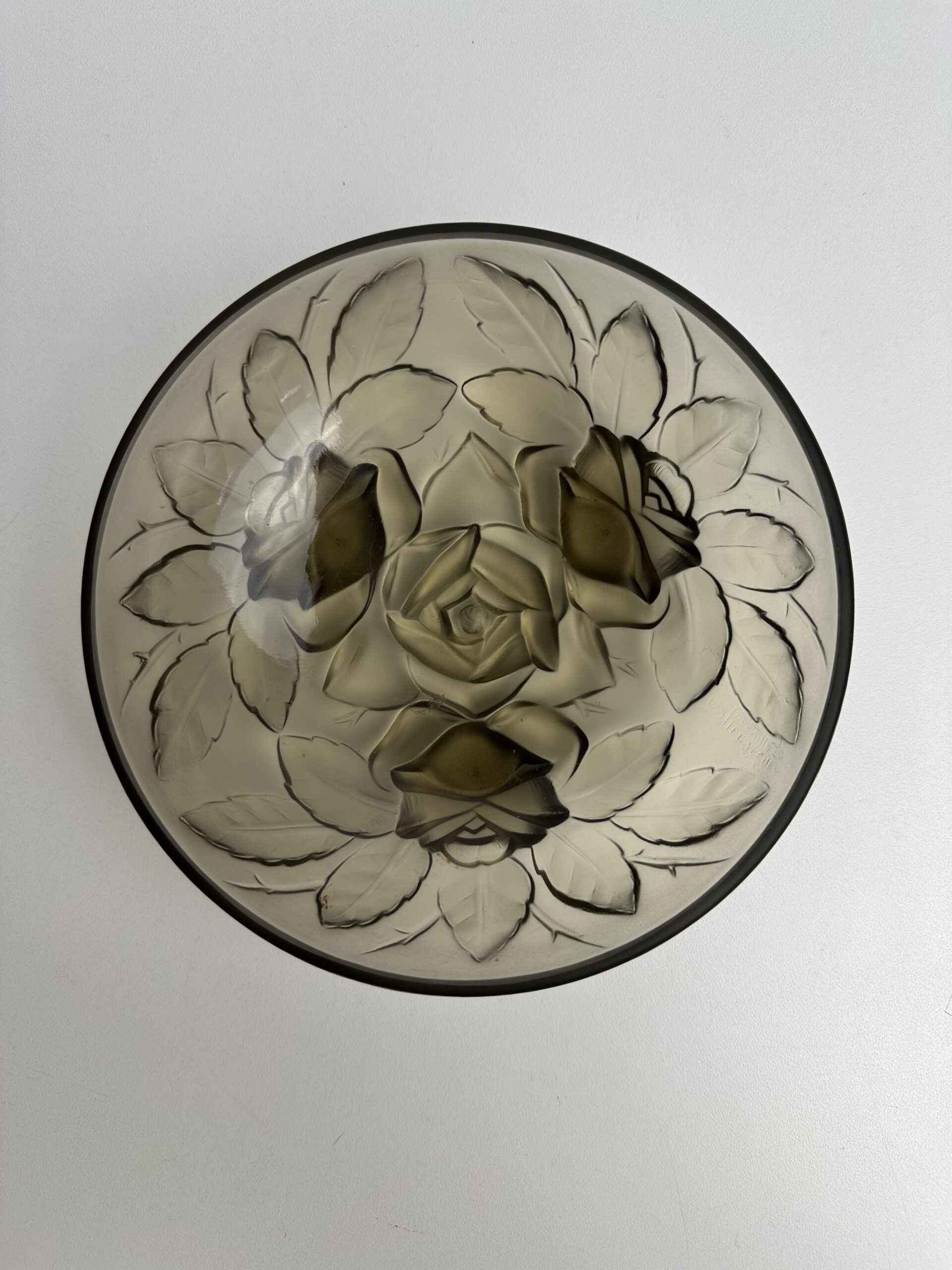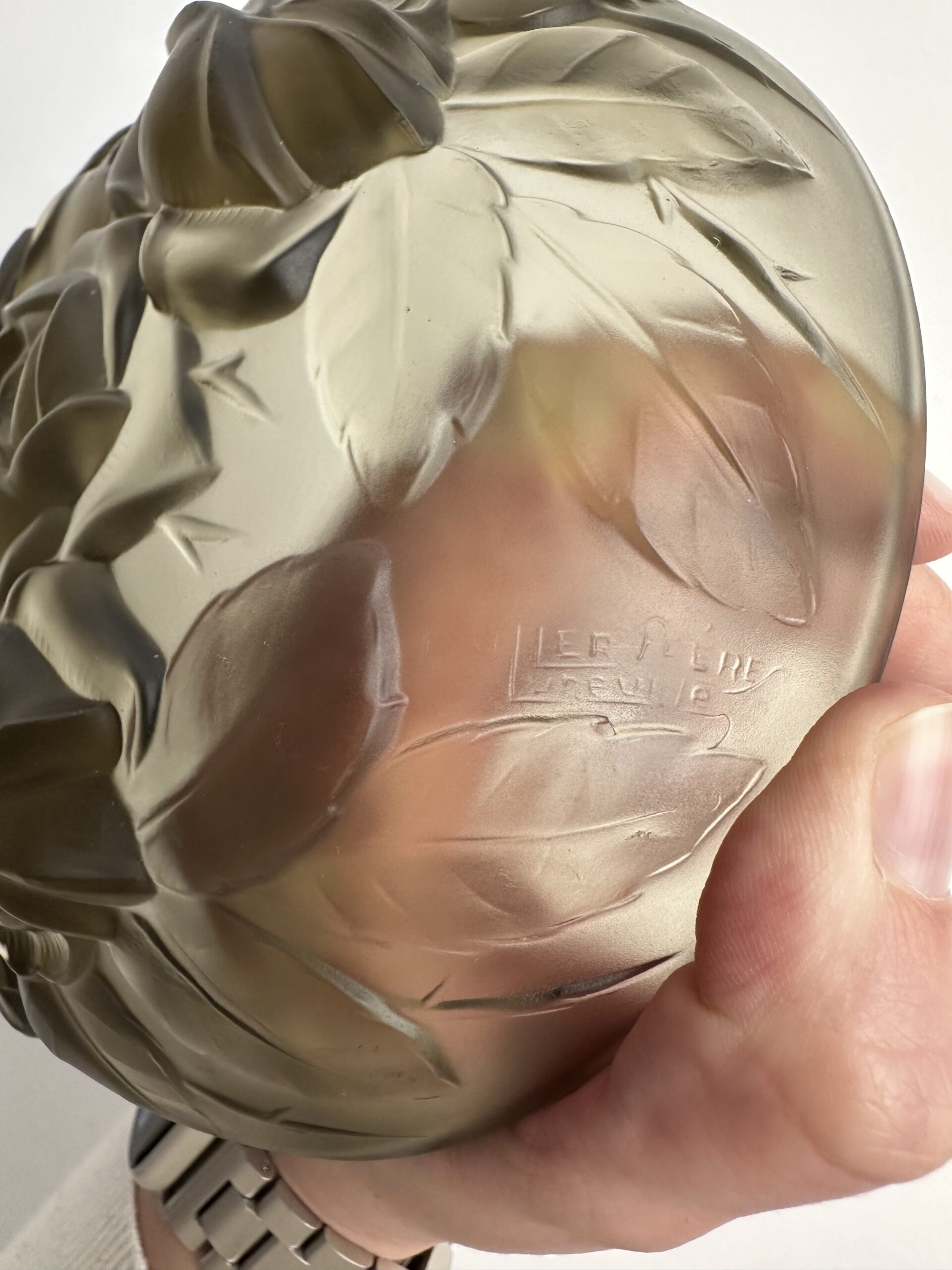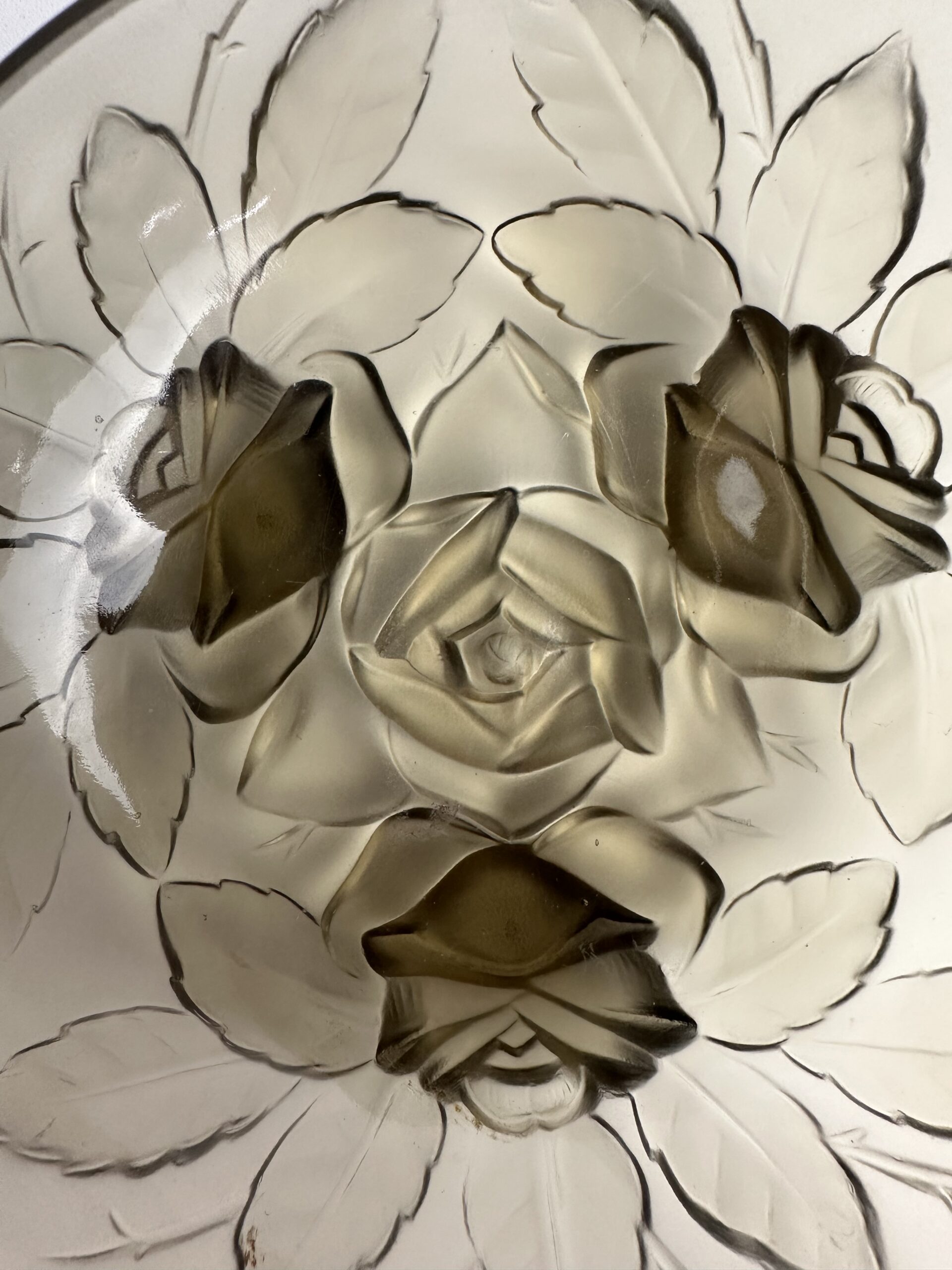 Muller Frères Lunéville, maison emblématique de la verrerie française du début du XXᵉ siècle est réputée pour la qualité de ses créations en verre moulé et pressé. Cette pièce se distingue par son délicat décor floral de roses, finement travaillé en relief sur toute la surface extérieure.