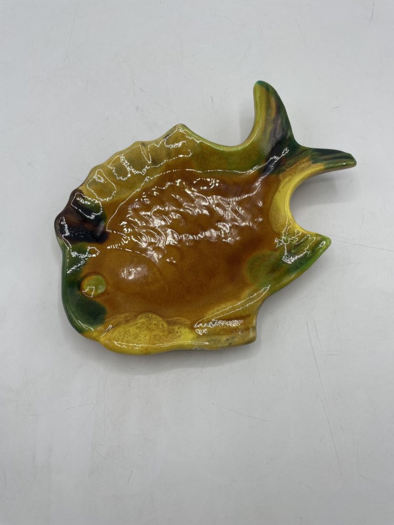 Cette joli coupelle en céramique est estampillée Vallauris. En forme de poisson, la coupelle a une jolie couleur jaune, orange, brun et vert et les détails du poisson sont en relief. De dimensions moyennes, le poisson multifonction peut servir de repose cuillère, de porte savon ou encore de vide poche !