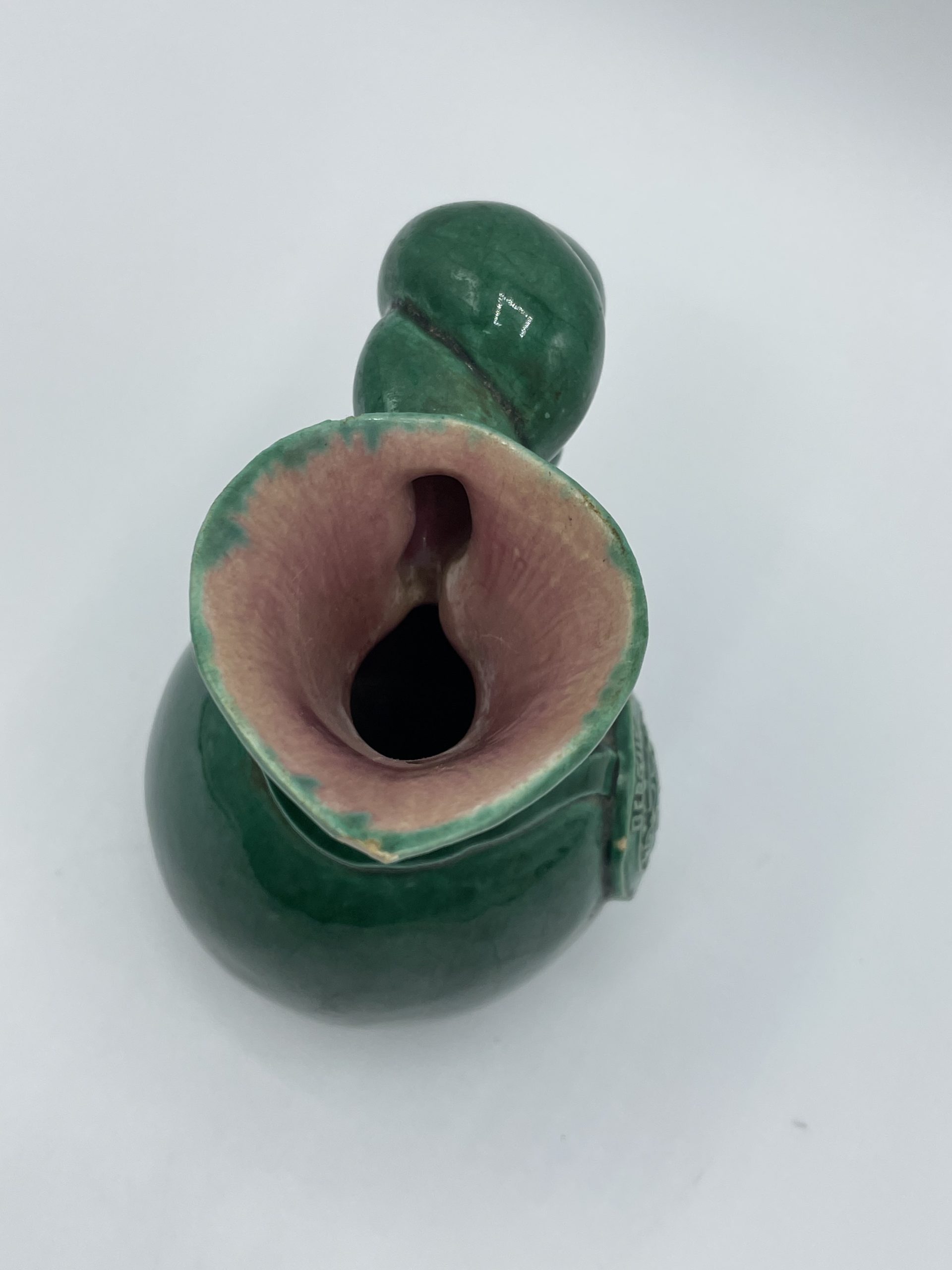 Cette jolie cruche en céramique de couleur vert bouteille vous fera craquer. La anse est torsadée et permet une meilleure prise en main. D’une jolie couleur vert bouteille, la carafe est décorée d’un écusson sur lequel est inscrit « BERGUES HOTEL DU COMMERCE » avec un blason. Vintage, 2 petits éclats sont à prévoir (cf photos), jolies marques du temps passé. Cette petite cruche donnera des airs de bistrot ou de café à votre cuisine, votre terrasse ou une jolie table !