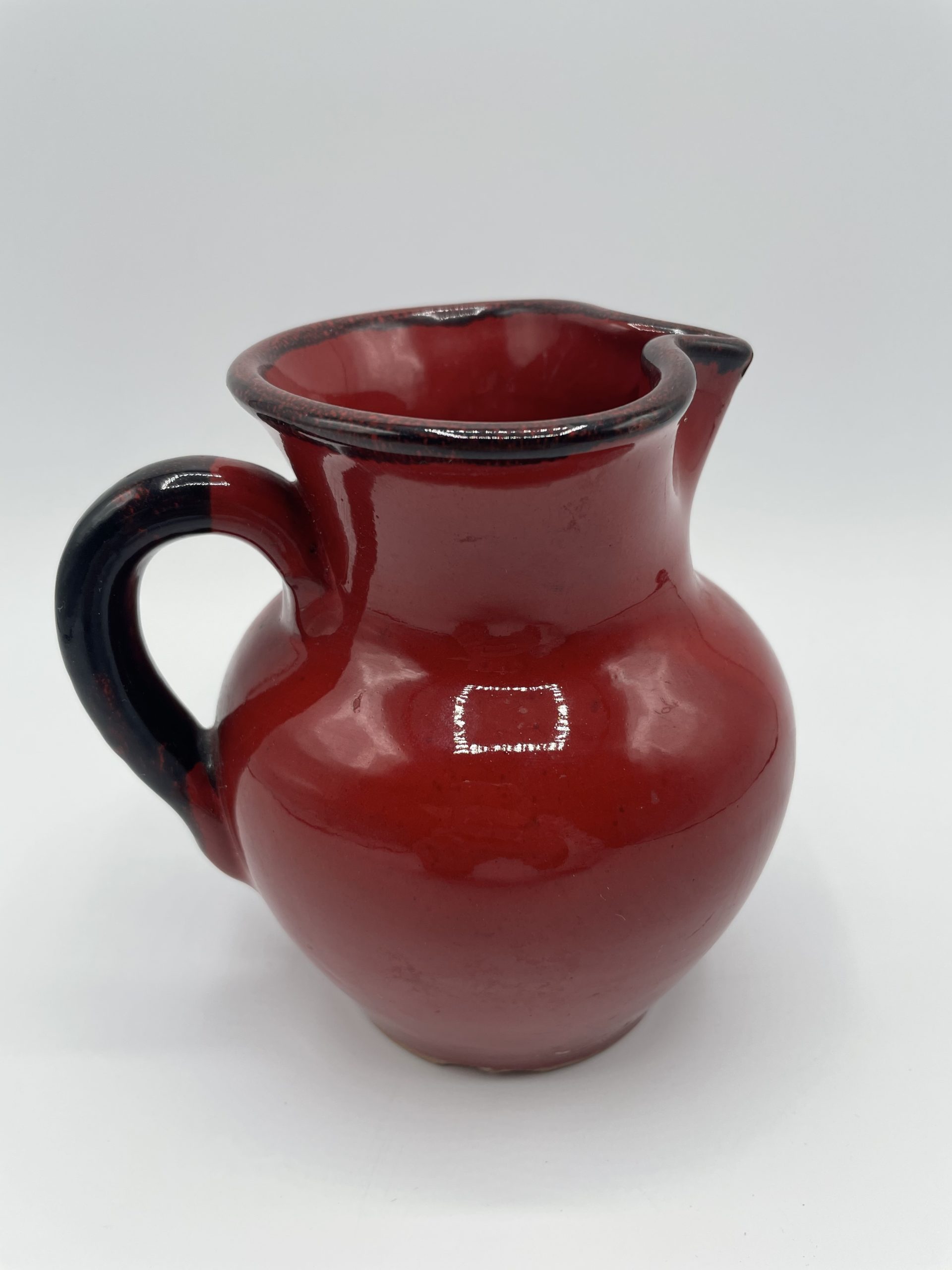 Cette jolie petite cruche en terre cuite vernie est estampillée poterie de VALLAURIS. De couleur rouge, elle a un liseré noir assorti à sa anse. Un petit éclat est visible derrière la cruche sans grand impact sur son aspect esthétique ni son bon usage (cf photos).Objet artisanal, cette petite cruche viendra joliment décorer votre table et peut aussi servir de vase pour un petit bouquet !
