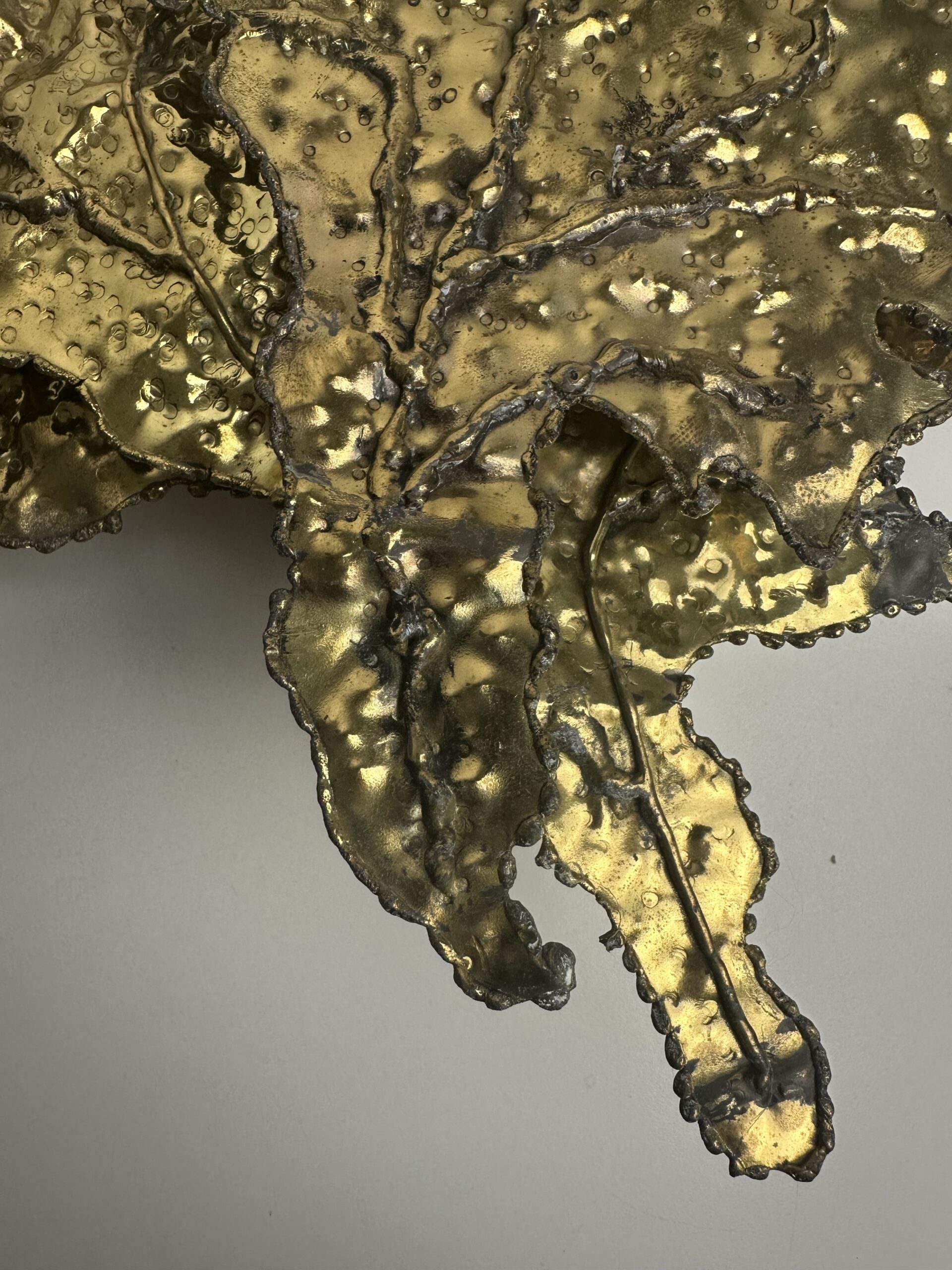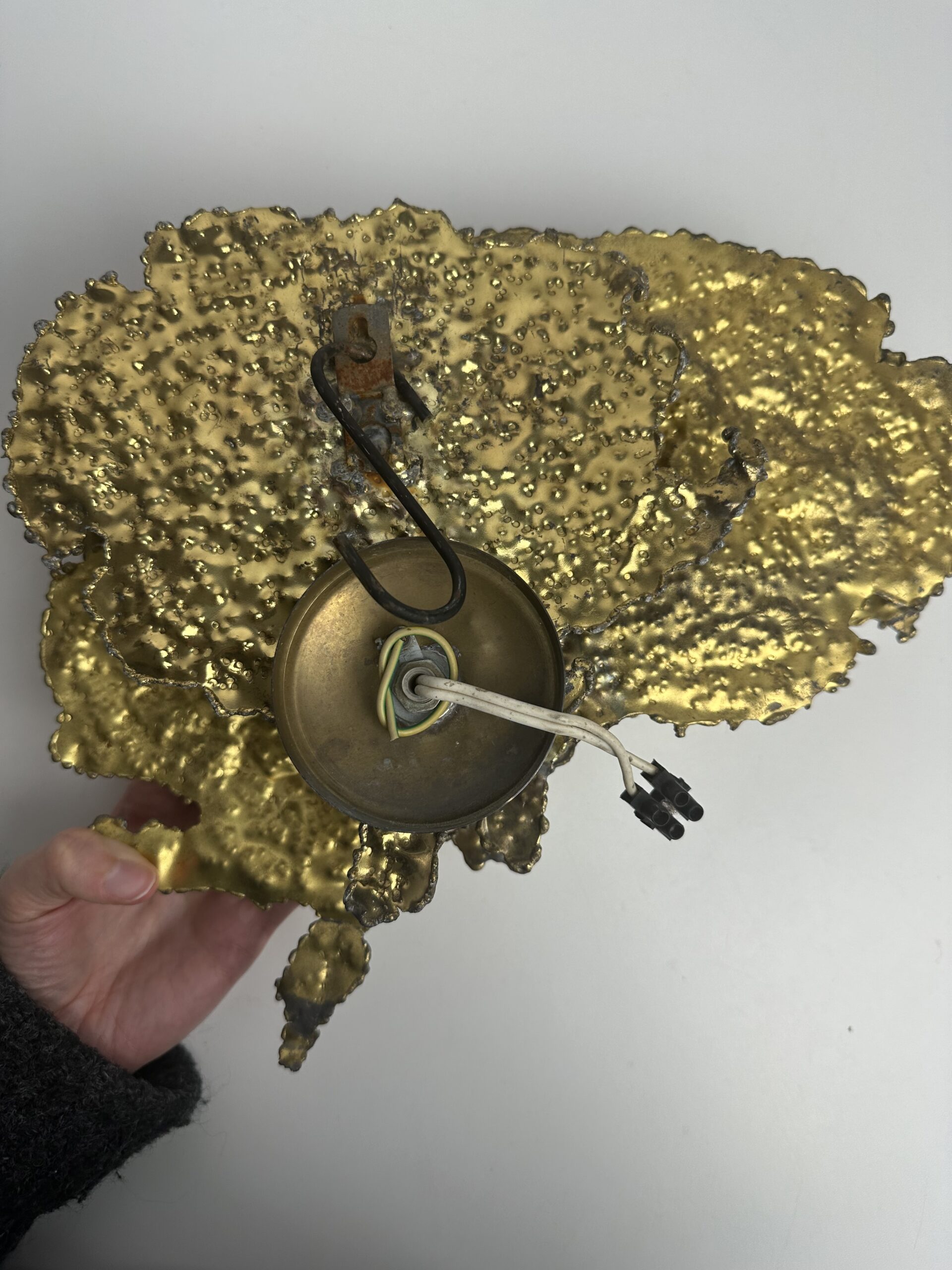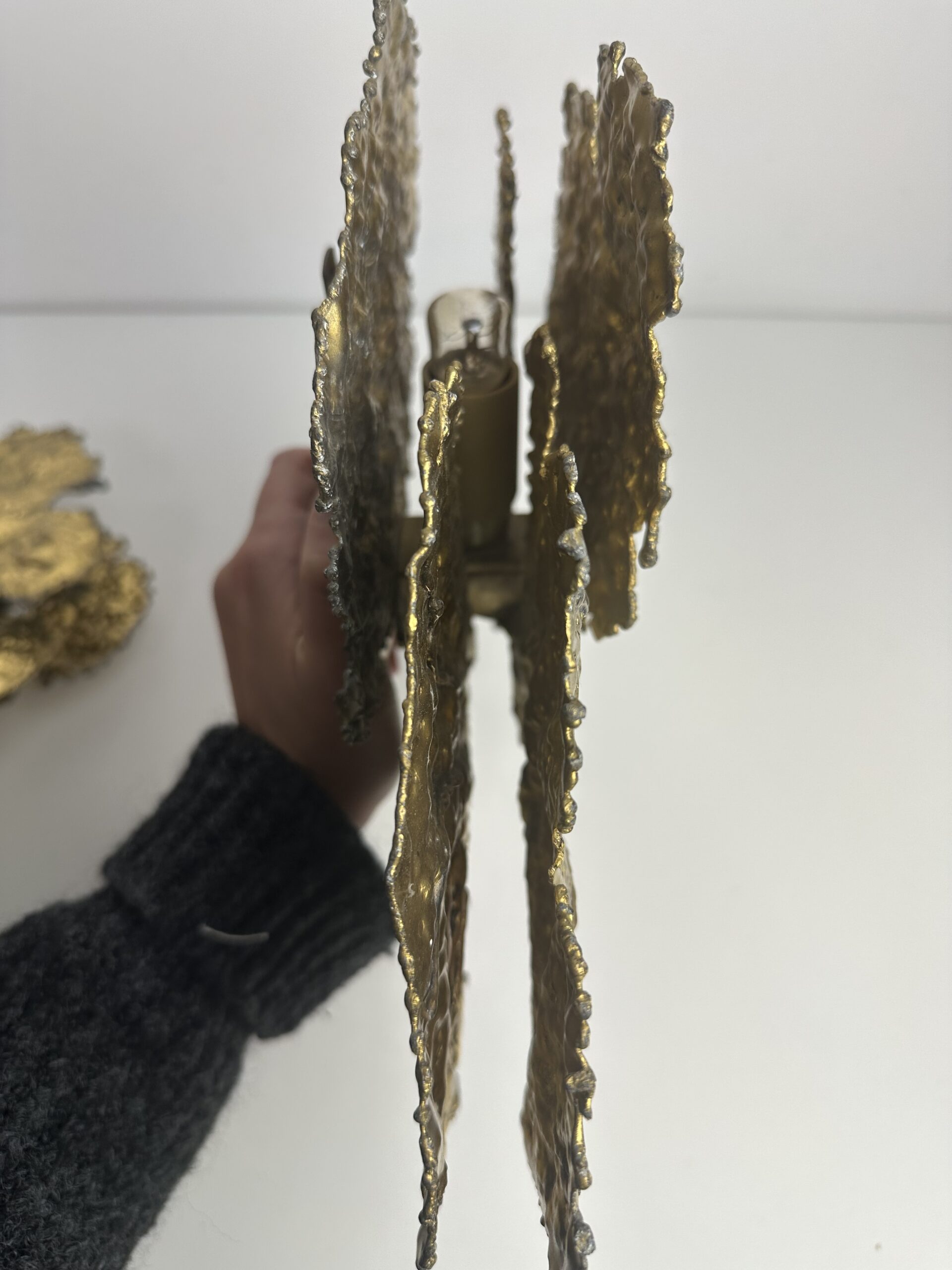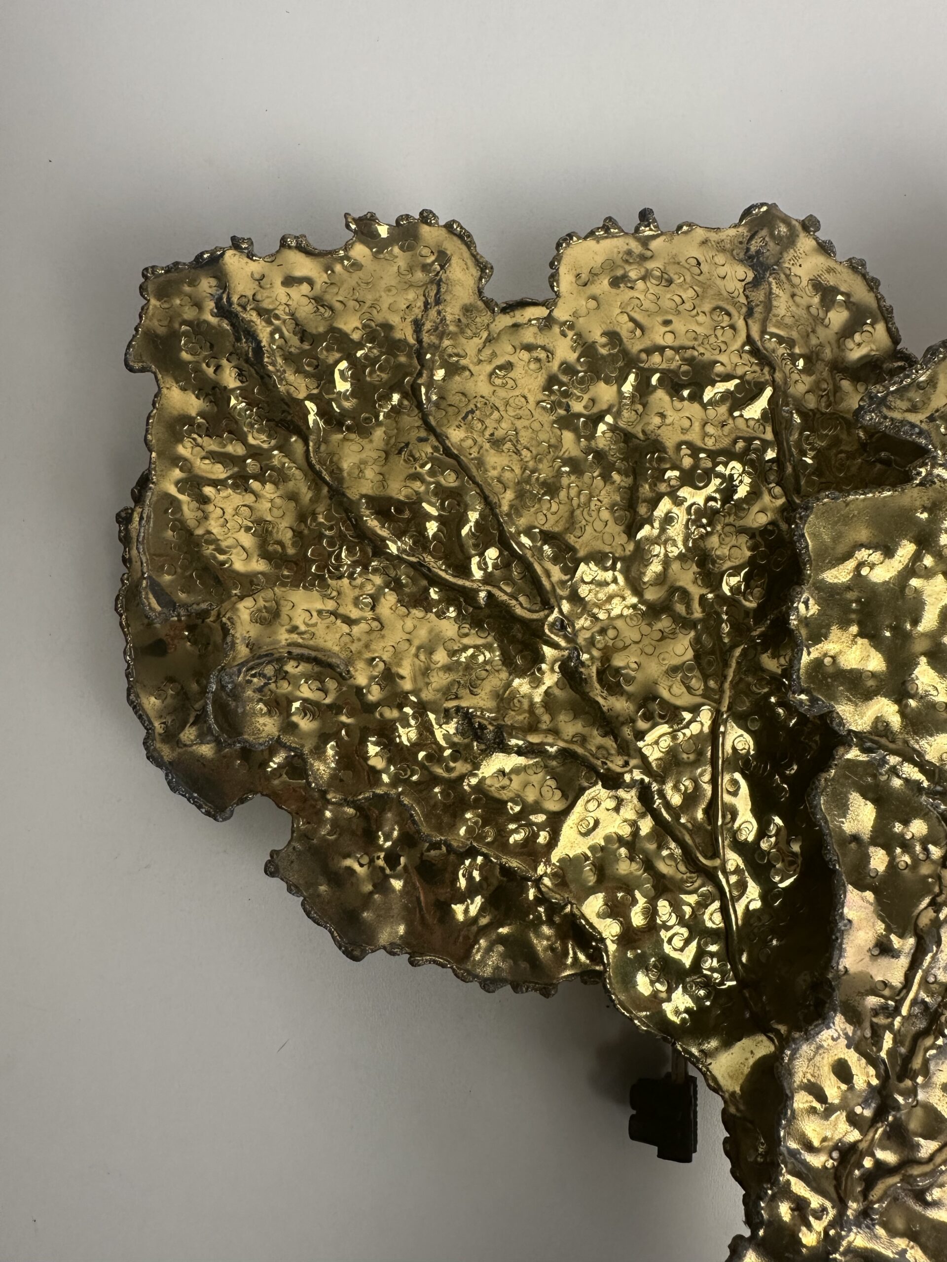 Le tout est en relief et texturé, ce qui leur confère un charme brut et un aspect presque sculptural. Ce duo d’appliques murales en forme de feuilles dorées laisse penser à un travail artisanal ou à une production inspirée des créations des années 60-70.