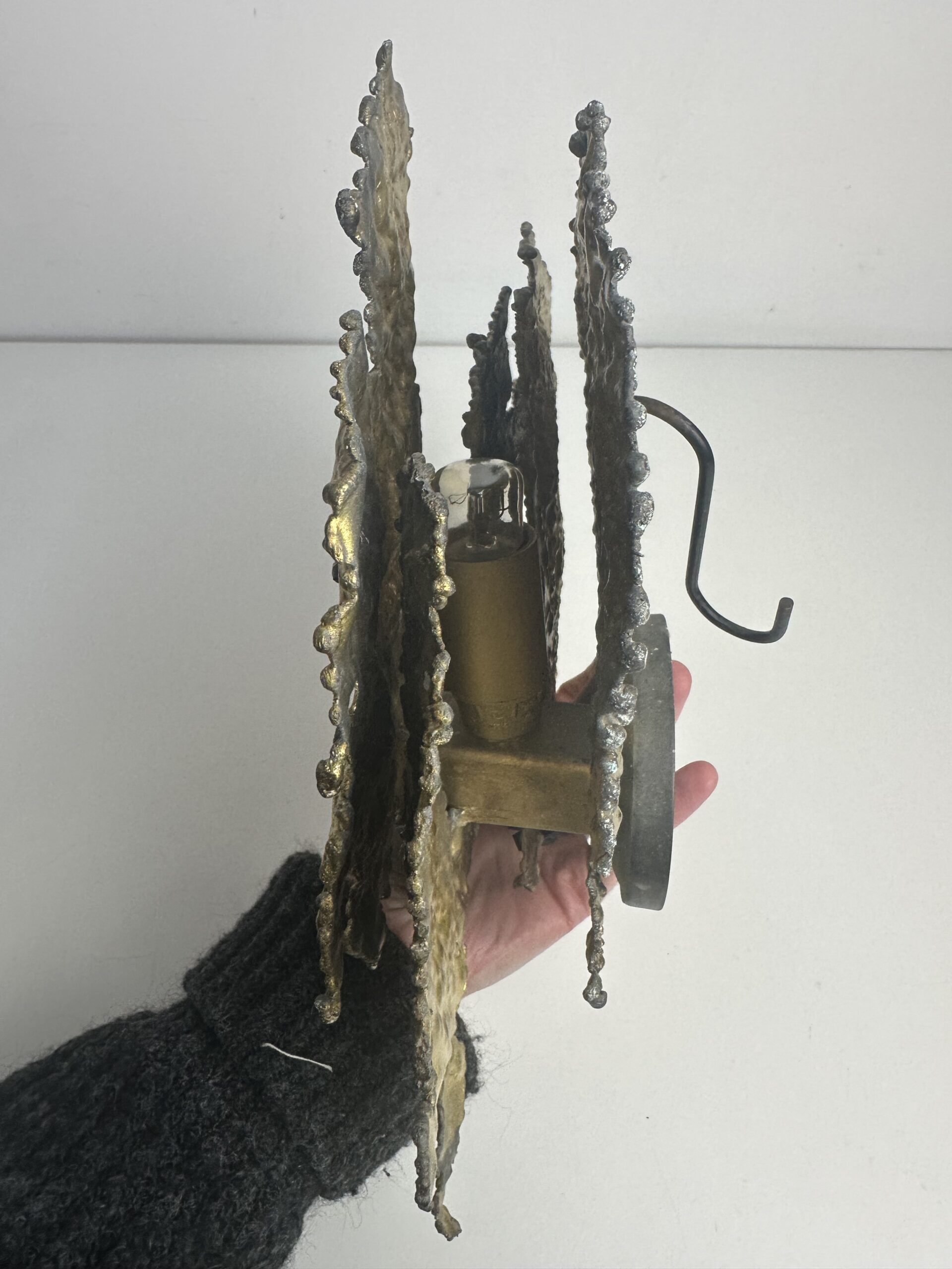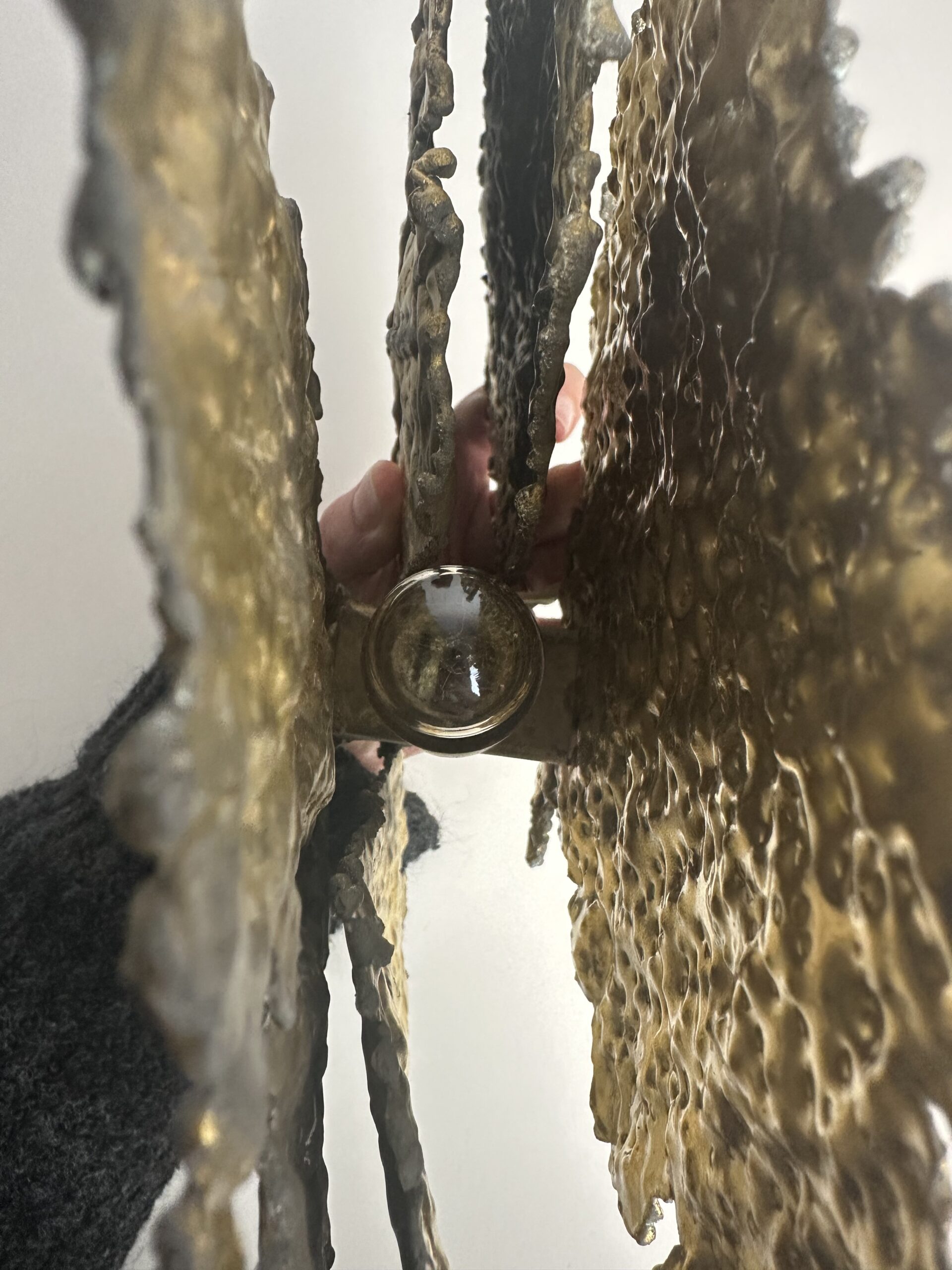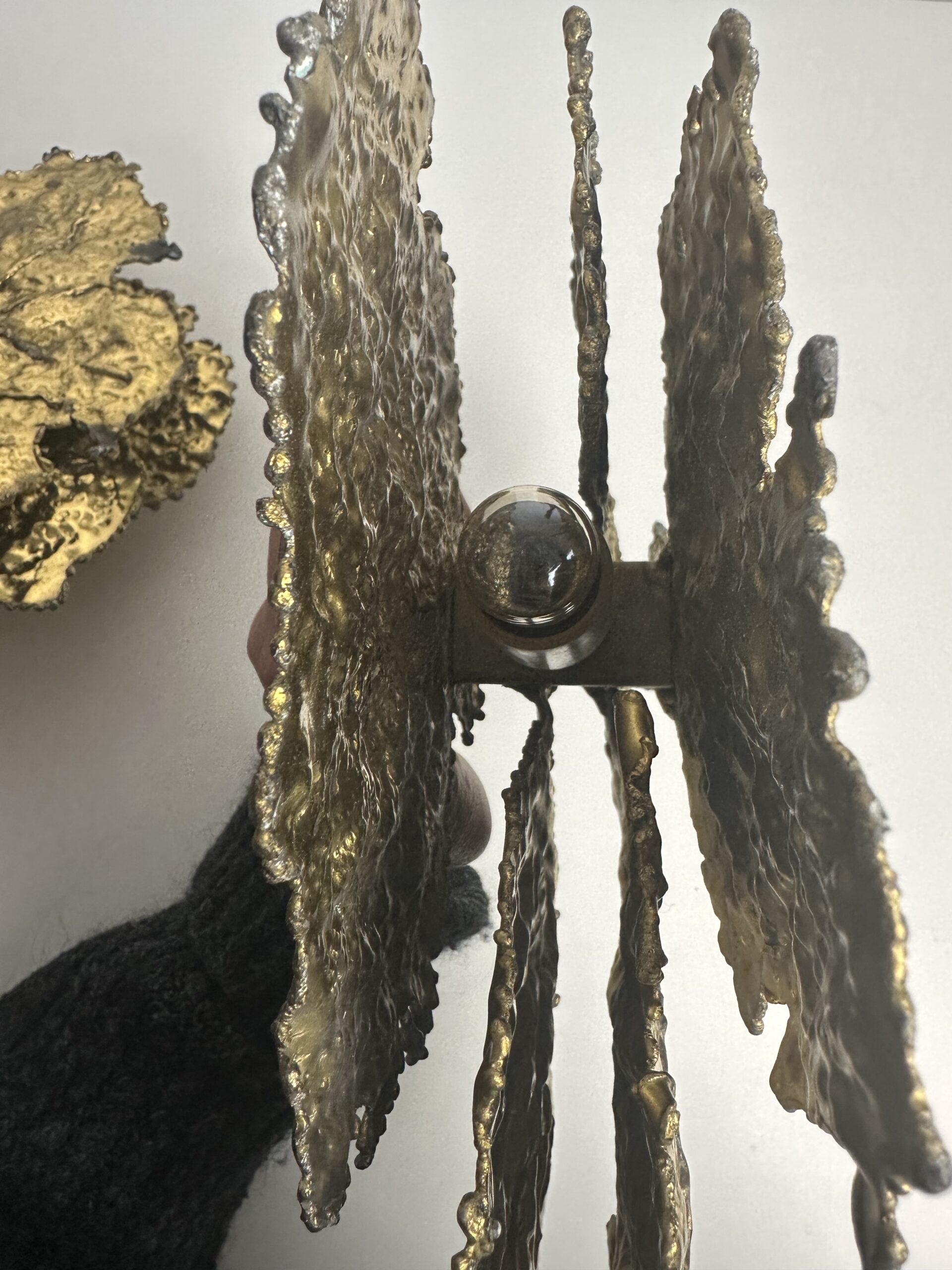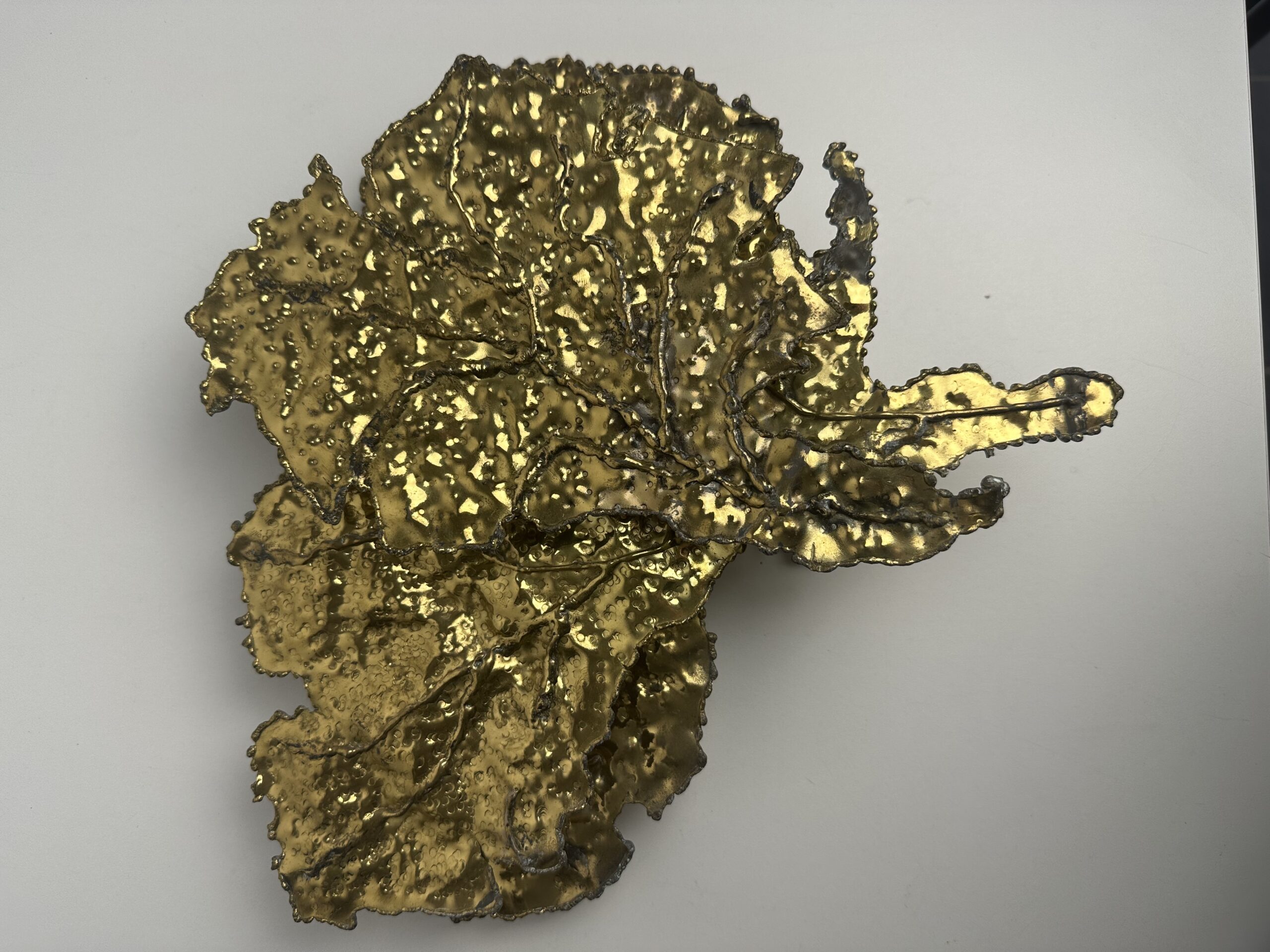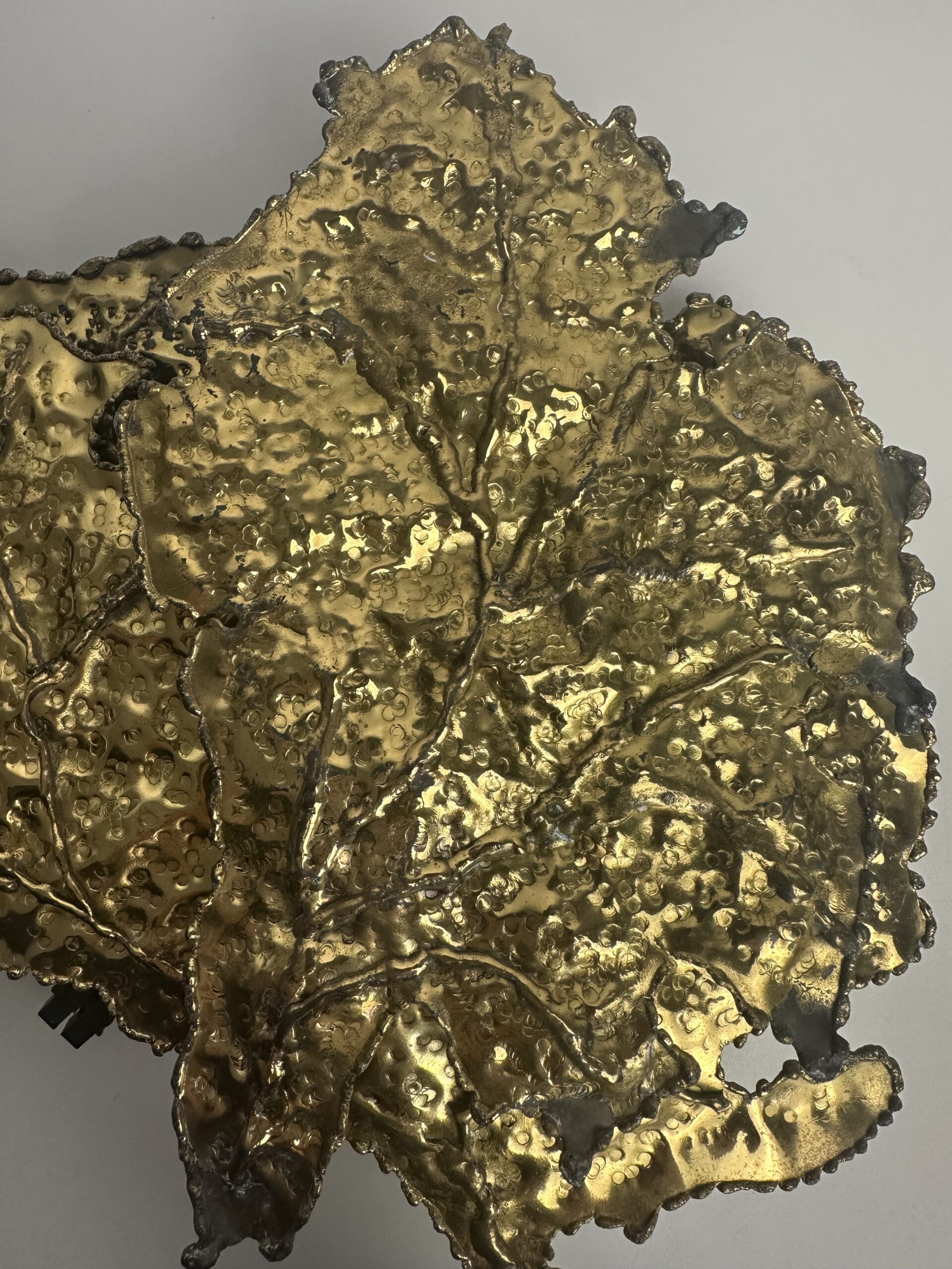 Le tout est en relief et texturé, ce qui leur confère un charme brut et un aspect presque sculptural. Ce duo d’appliques murales en forme de feuilles dorées laisse penser à un travail artisanal ou à une production inspirée des créations des années 60-70.