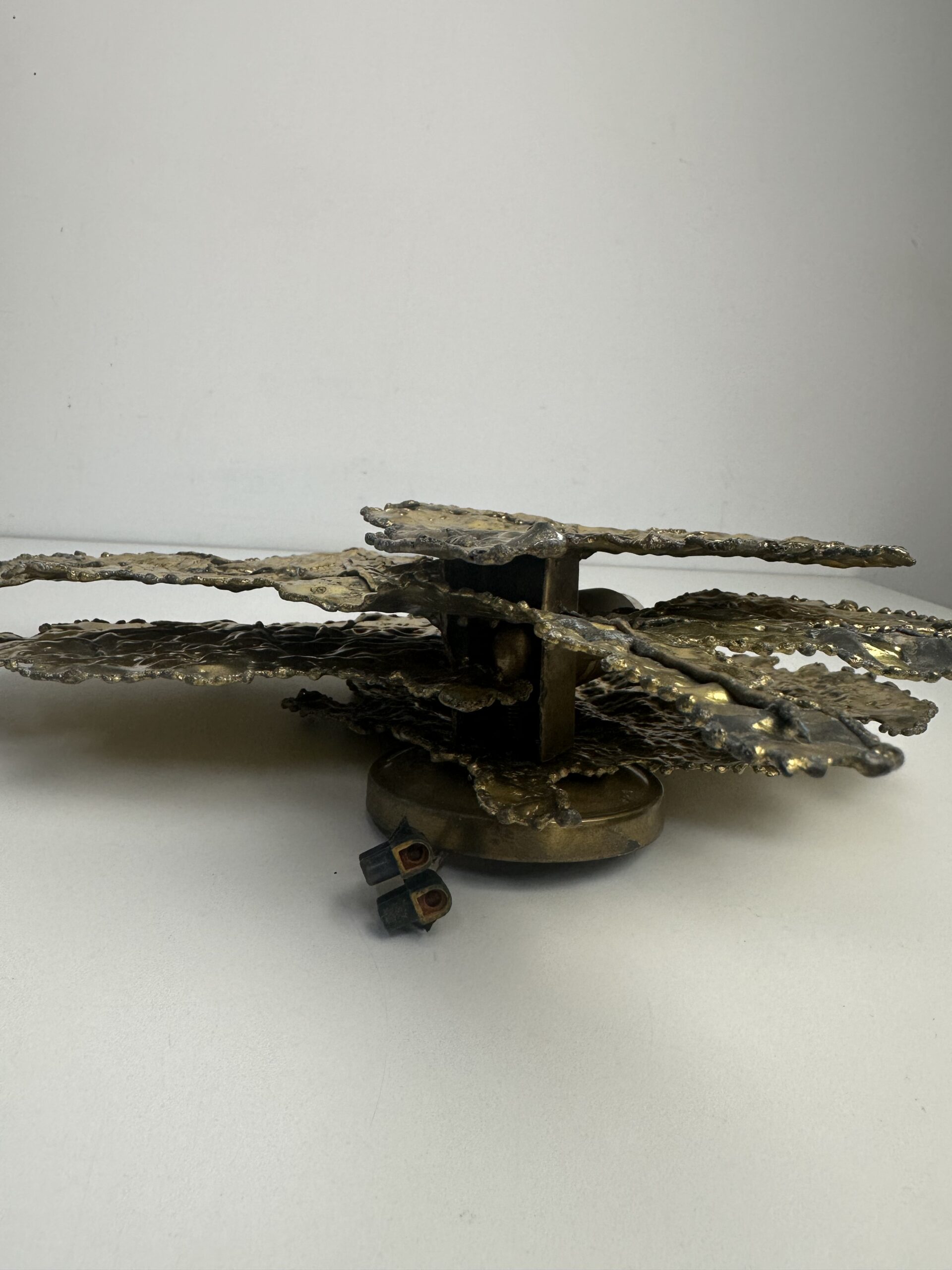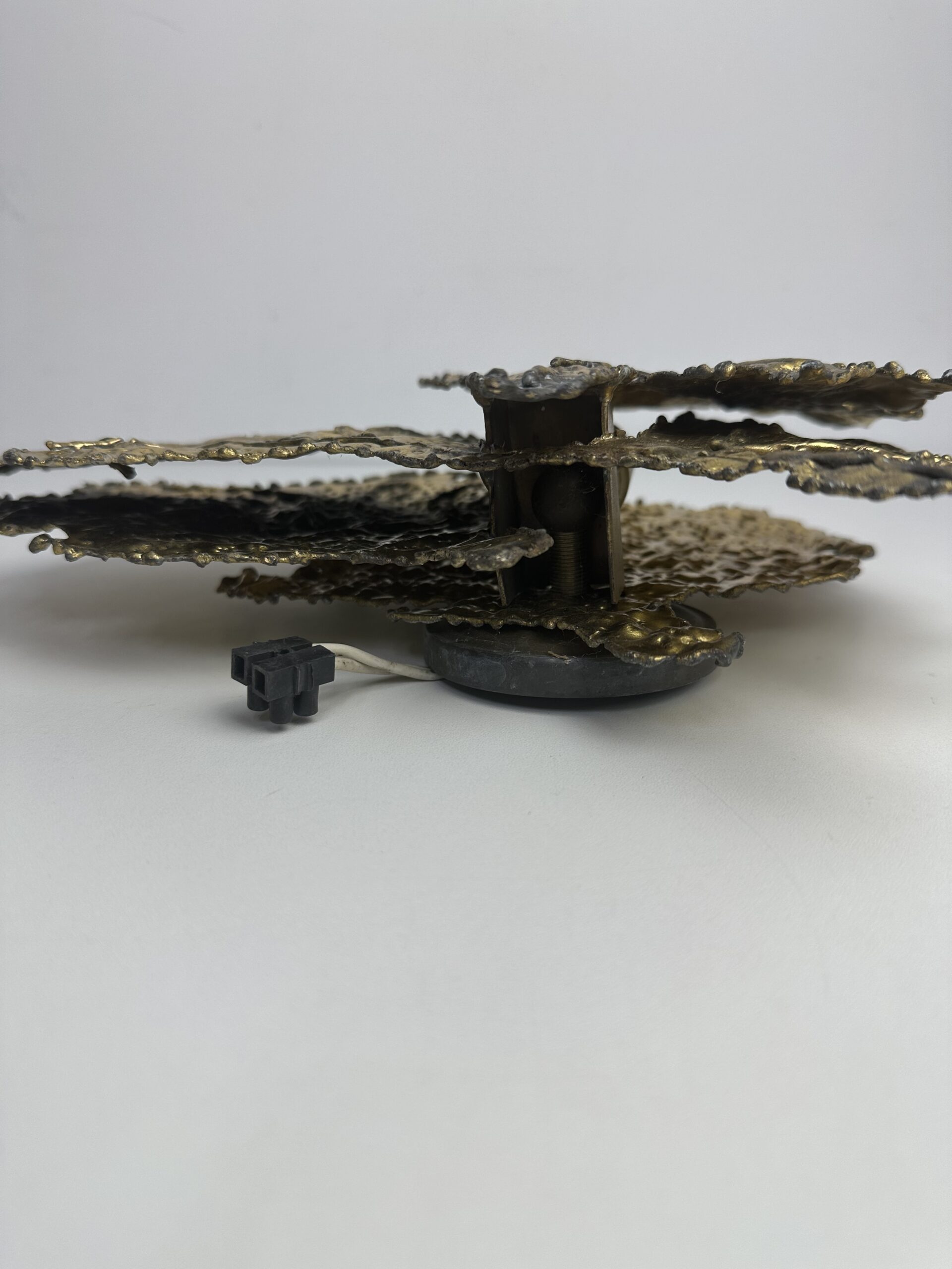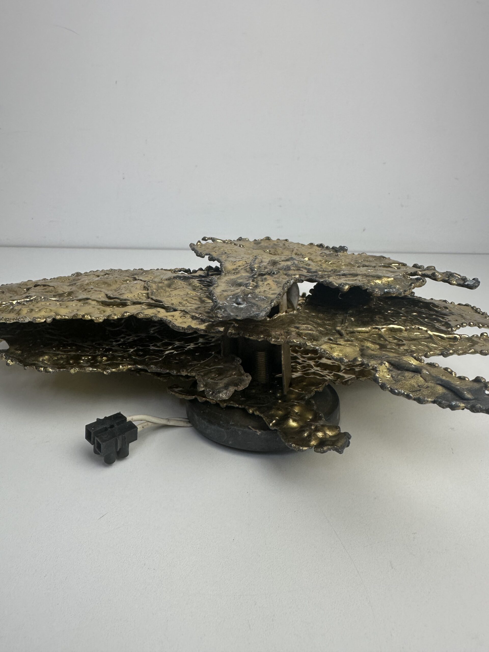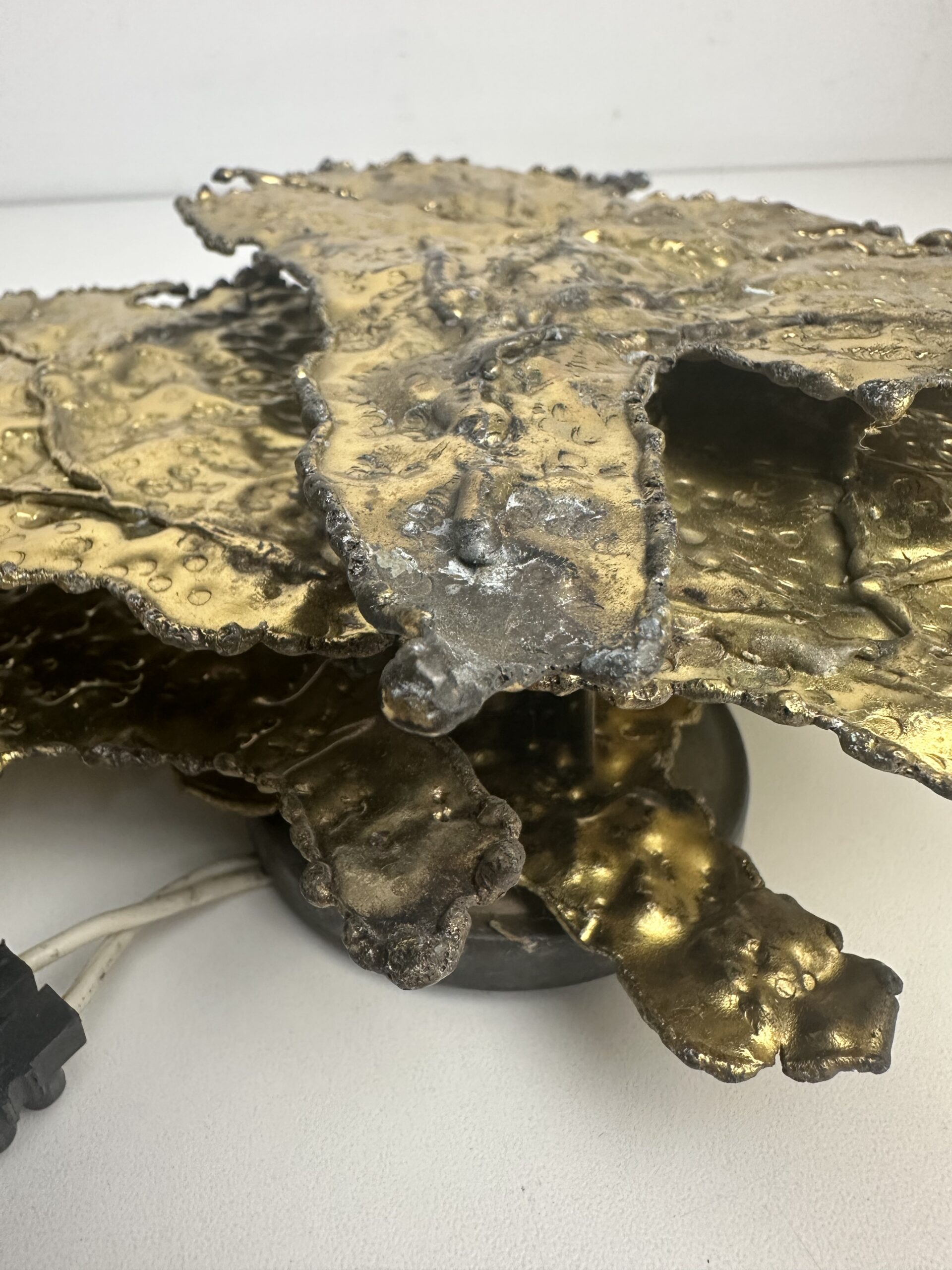 Le tout est en relief et texturé, ce qui leur confère un charme brut et un aspect presque sculptural. Ce duo d’appliques murales en forme de feuilles dorées laisse penser à un travail artisanal ou à une production inspirée des créations des années 60-70.