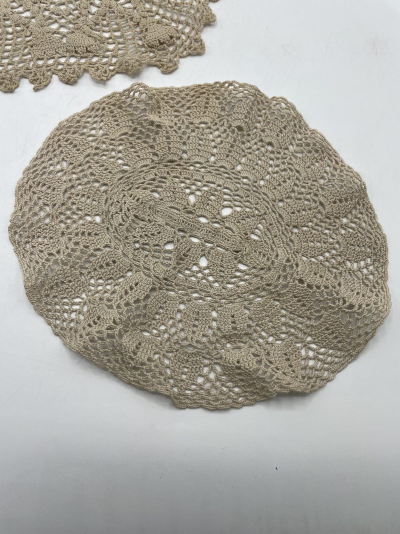Ce joli duo se compose de 2 napperons vintage dépareillés. De couleur sable, beige, les napperons ont des tailles et des formes différentes et ils sont tous les deux réalisés au crochet. Le plus grand a une très jolie forme de collerette, et le plus petit est de forme ovale. En bon état général, ces jolis napperons seront parfaits pour une belle décoration à l’esprit vintage, rétro, ou bohème !