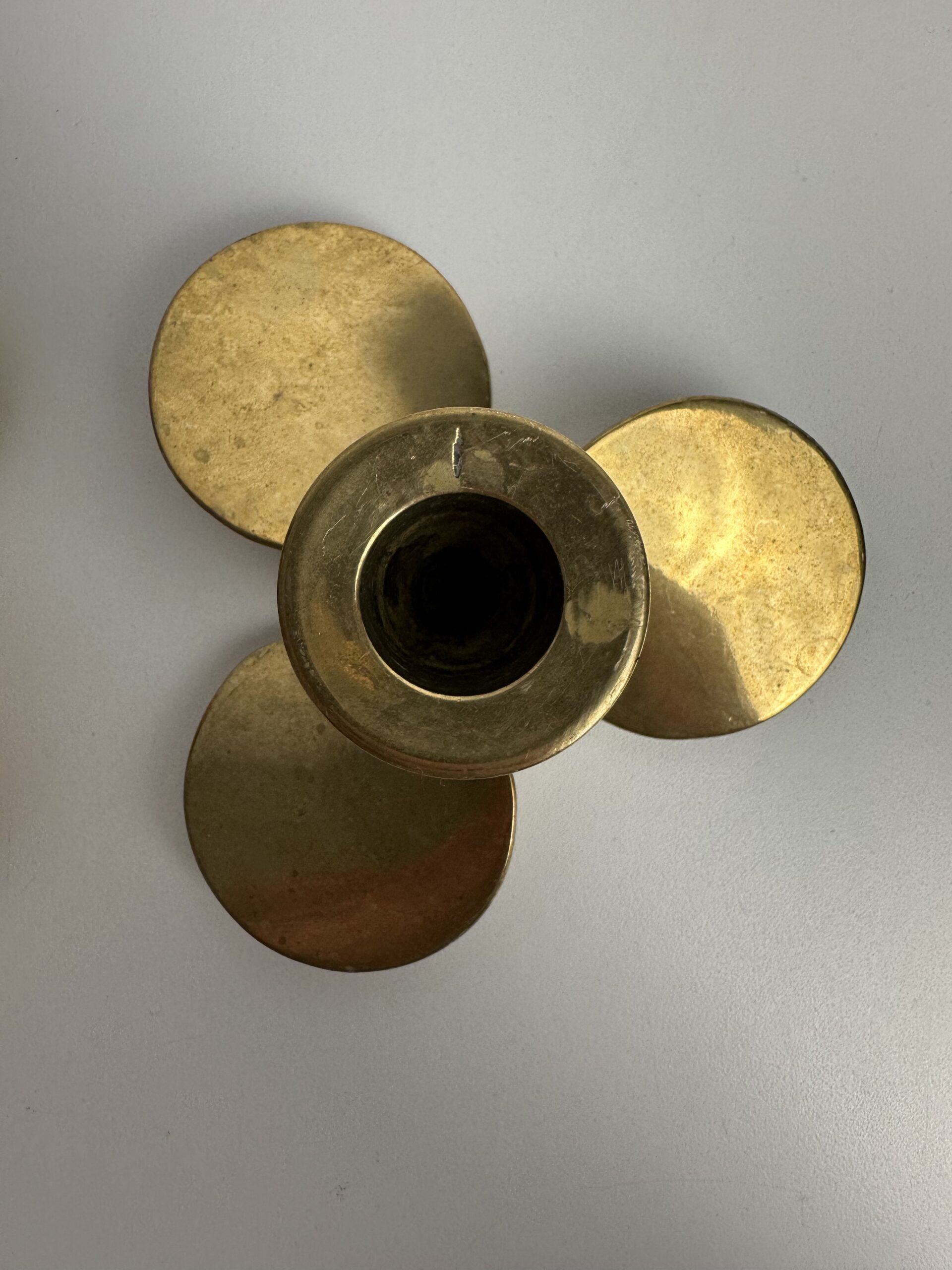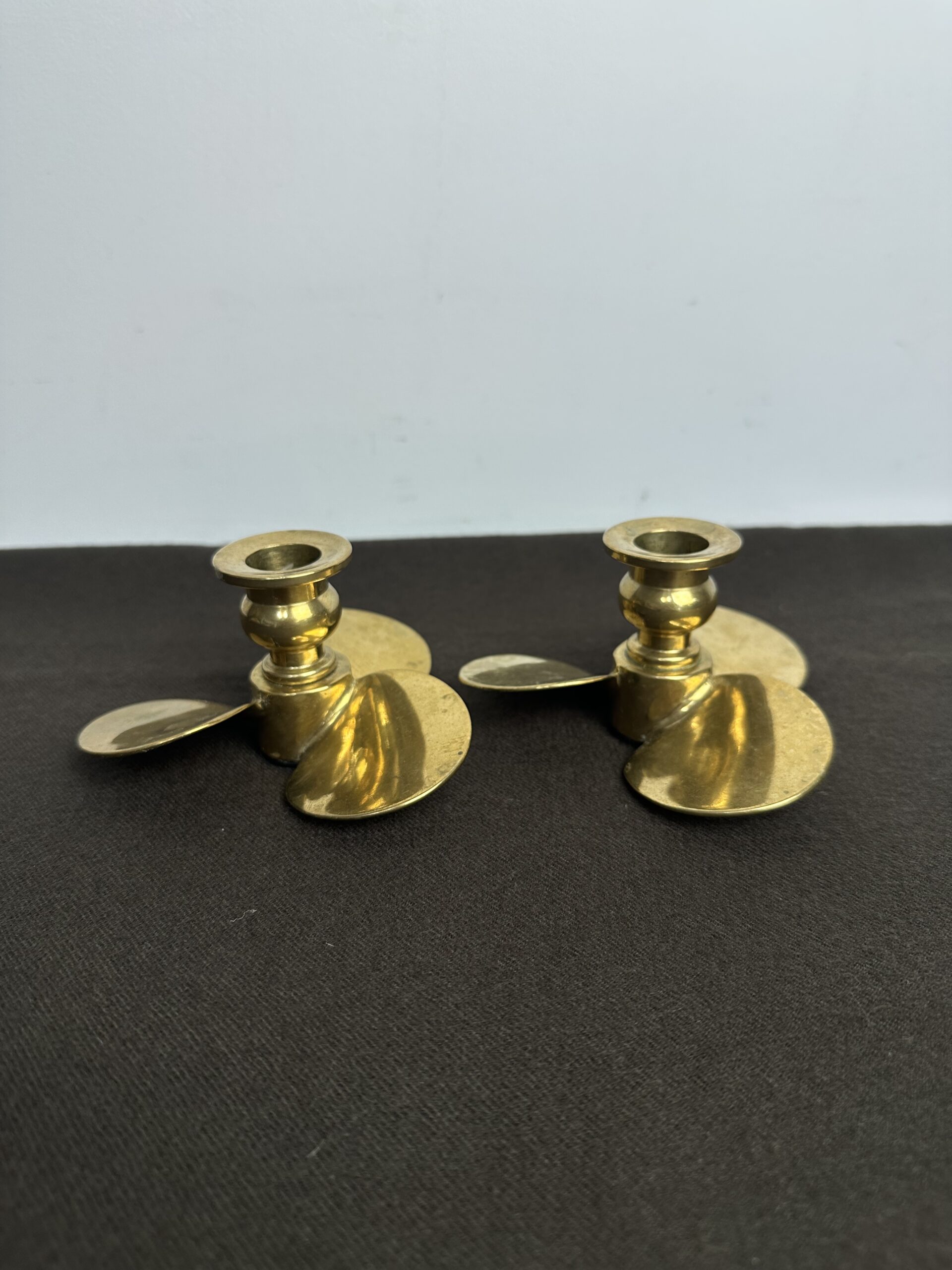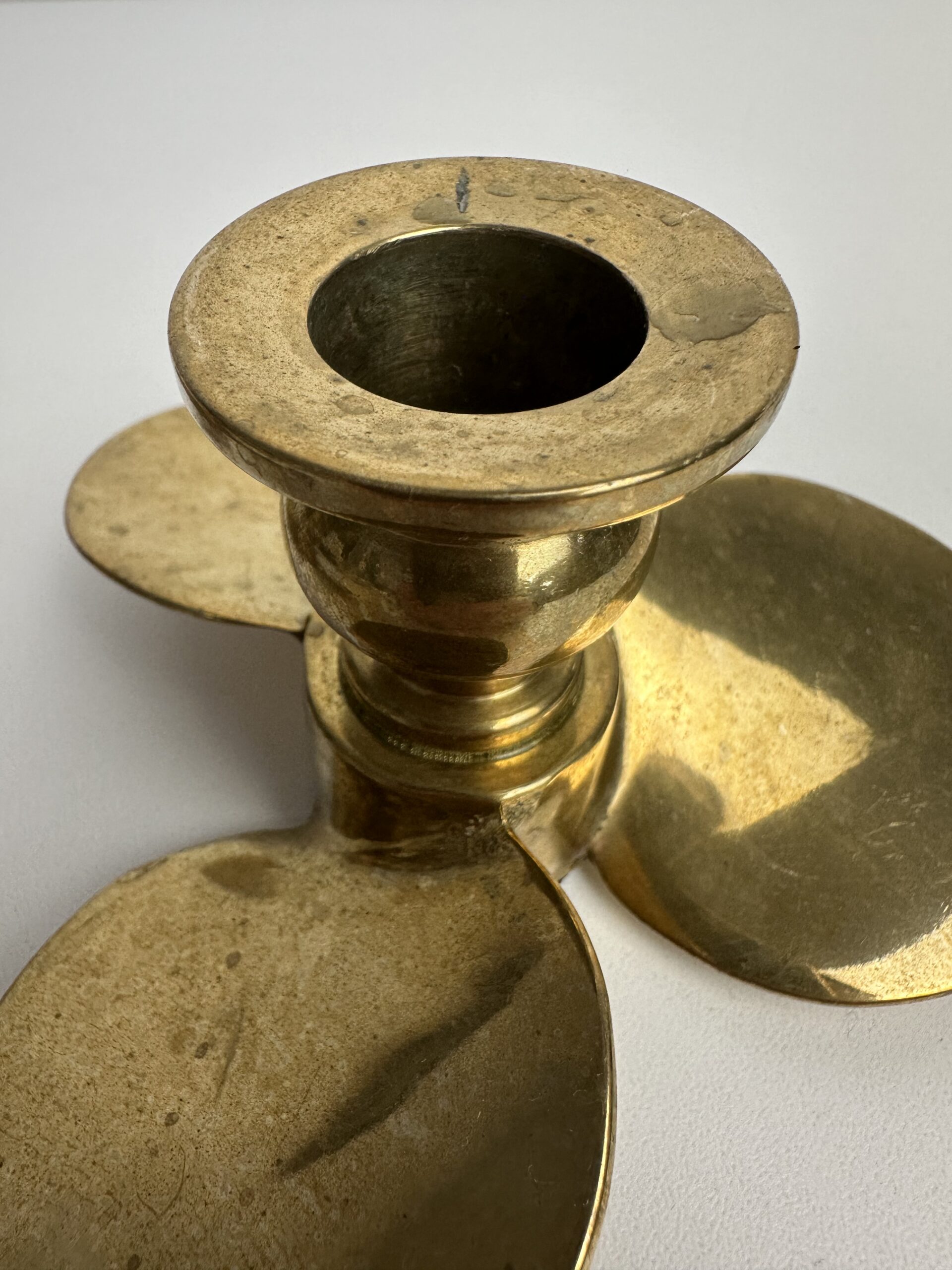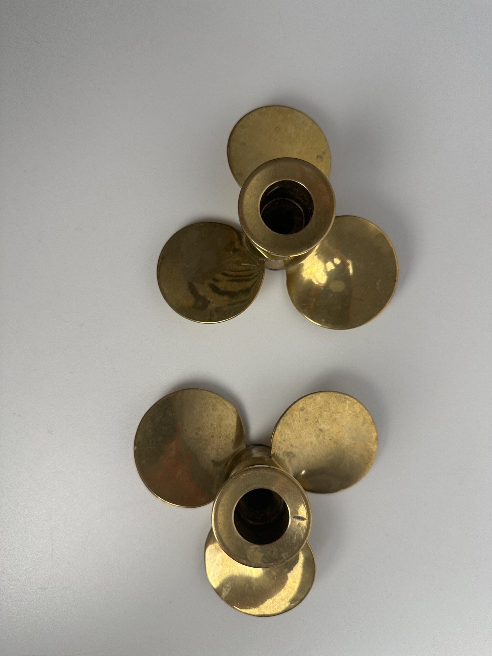 Probablement en laiton, les bougeoirs sont originaux avec leur base en forme de trois pétales arrondis. Ils nous évoquent une fleur ou une hélice, inspirée du design des années 60-70.