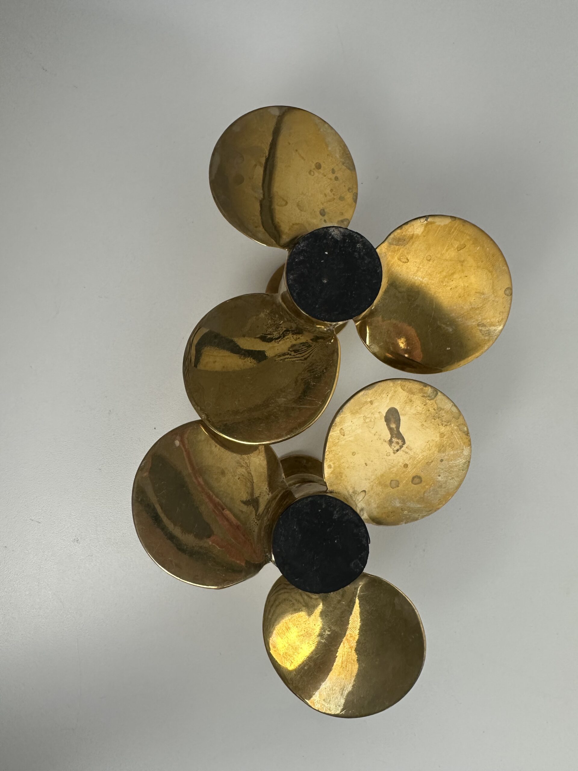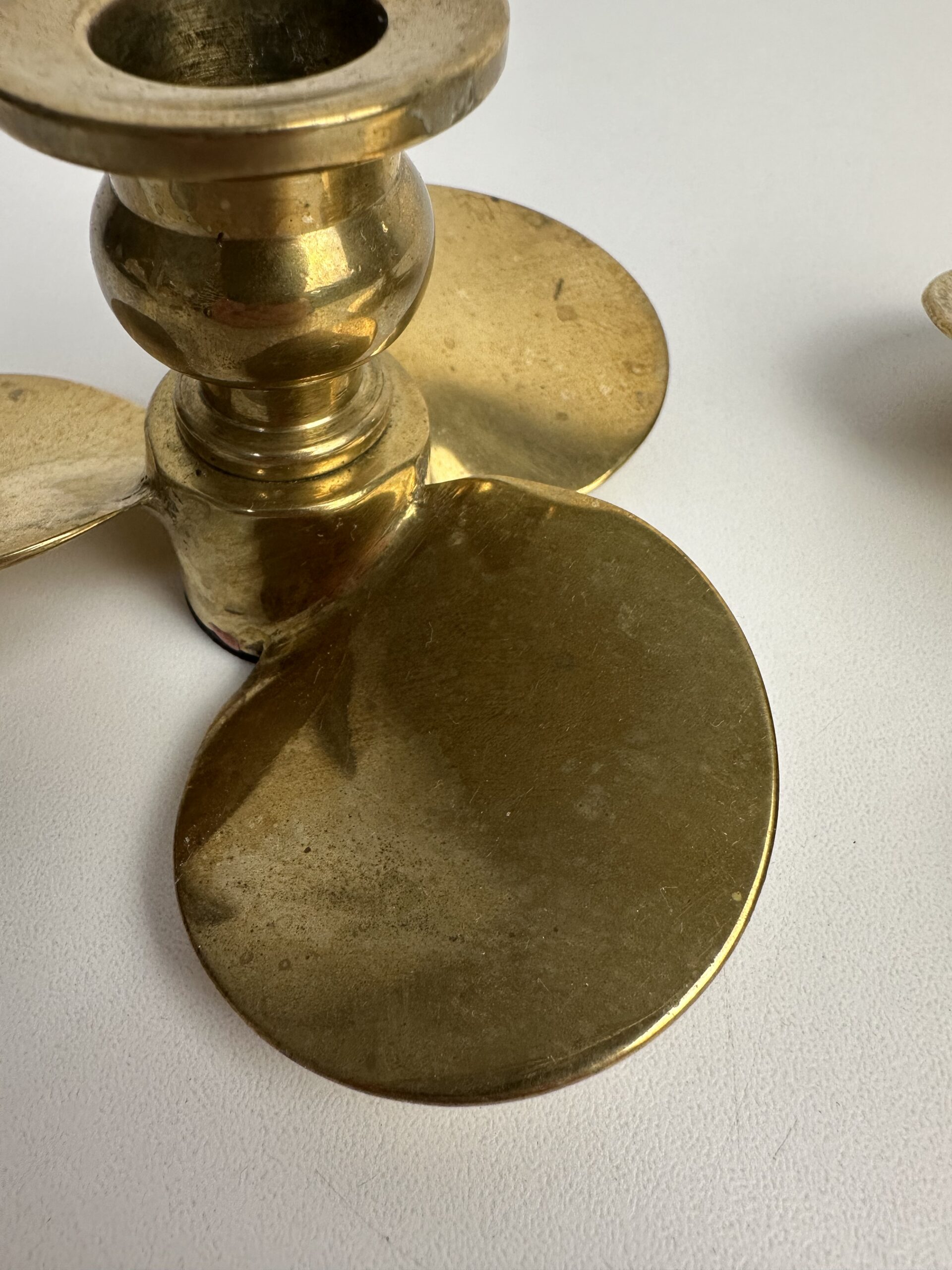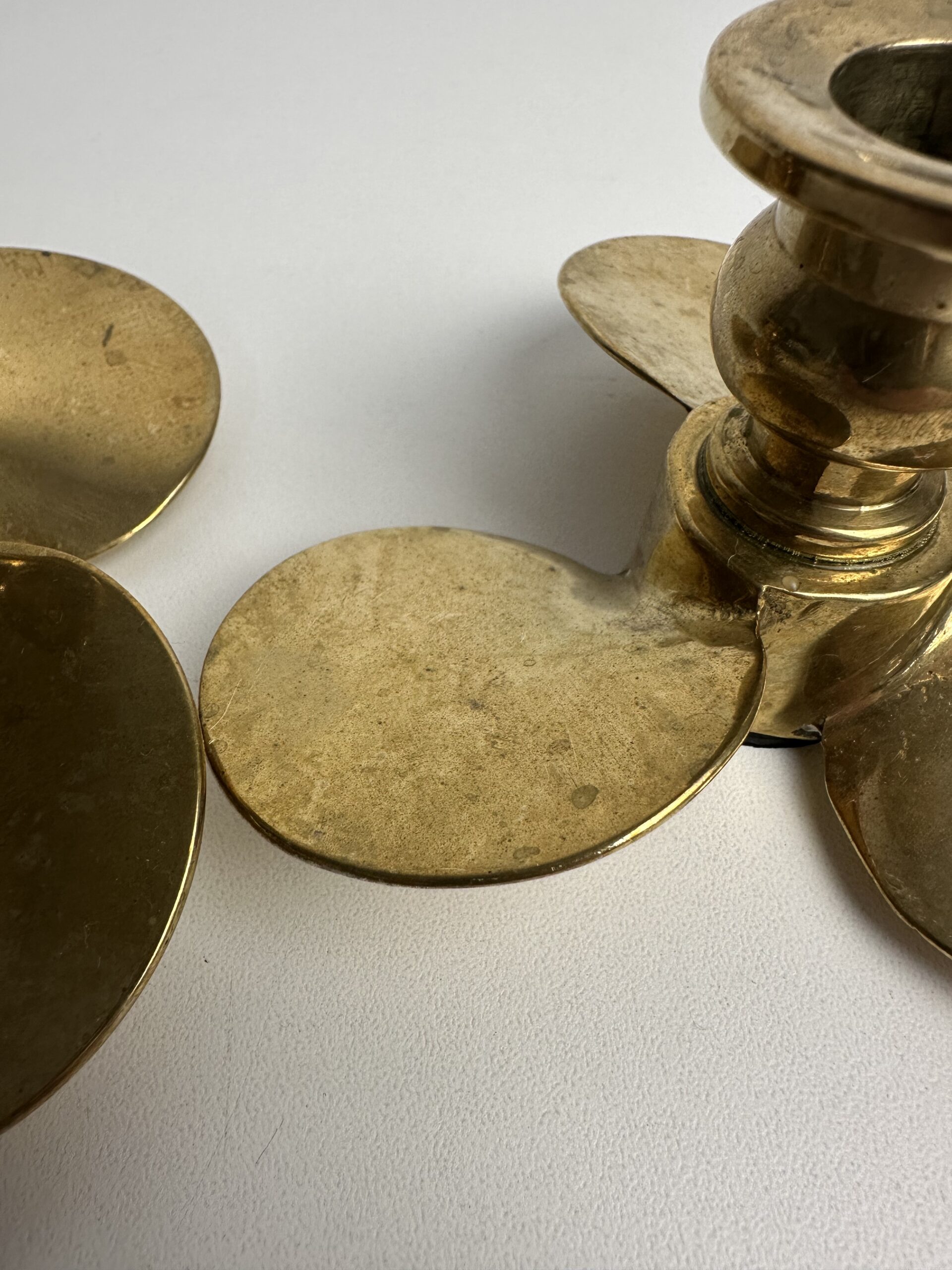 Probablement en laiton, les bougeoirs sont originaux avec leur base en forme de trois pétales arrondis. Ils nous évoquent une fleur ou une hélice, inspirée du design des années 60-70.