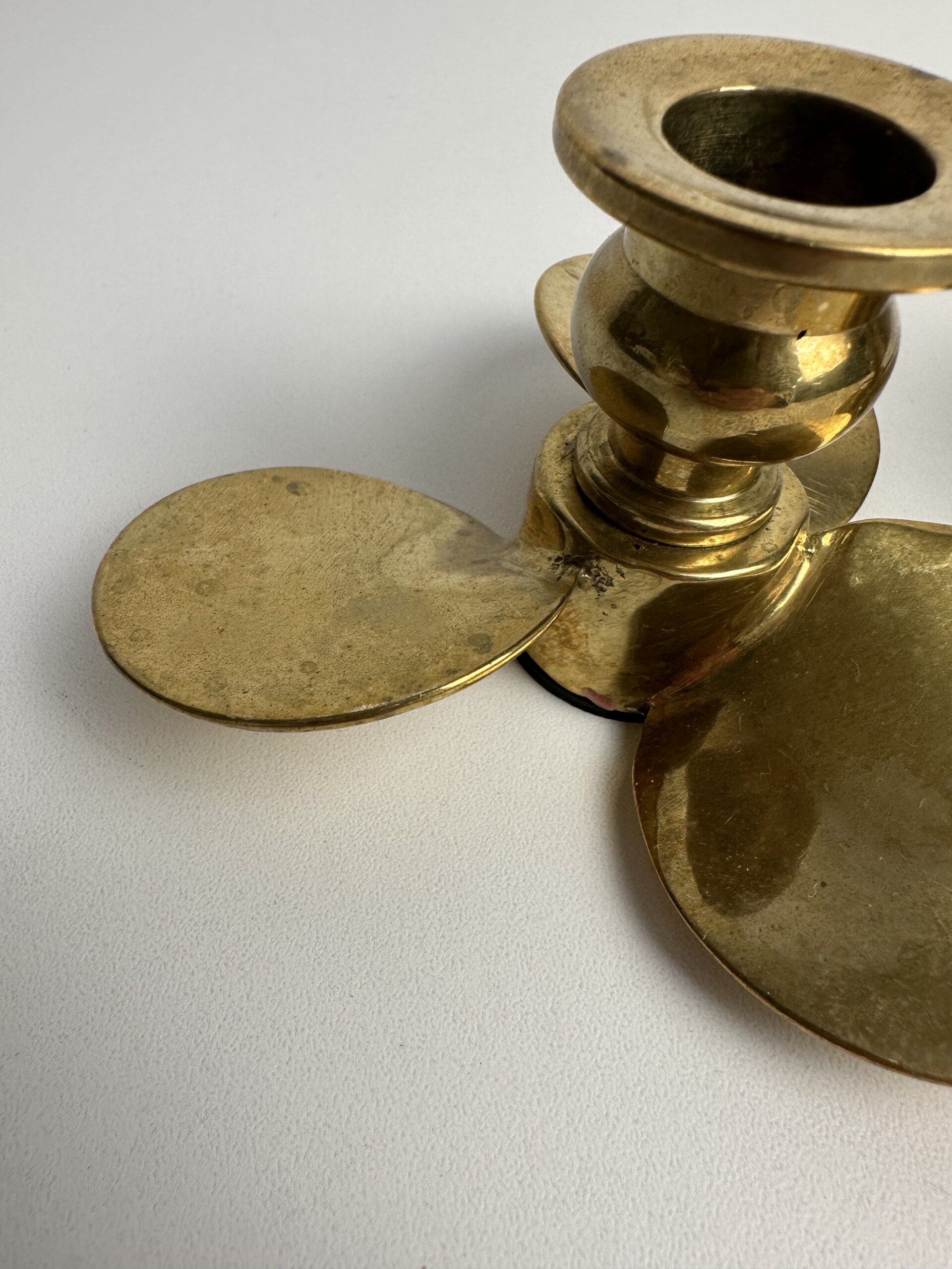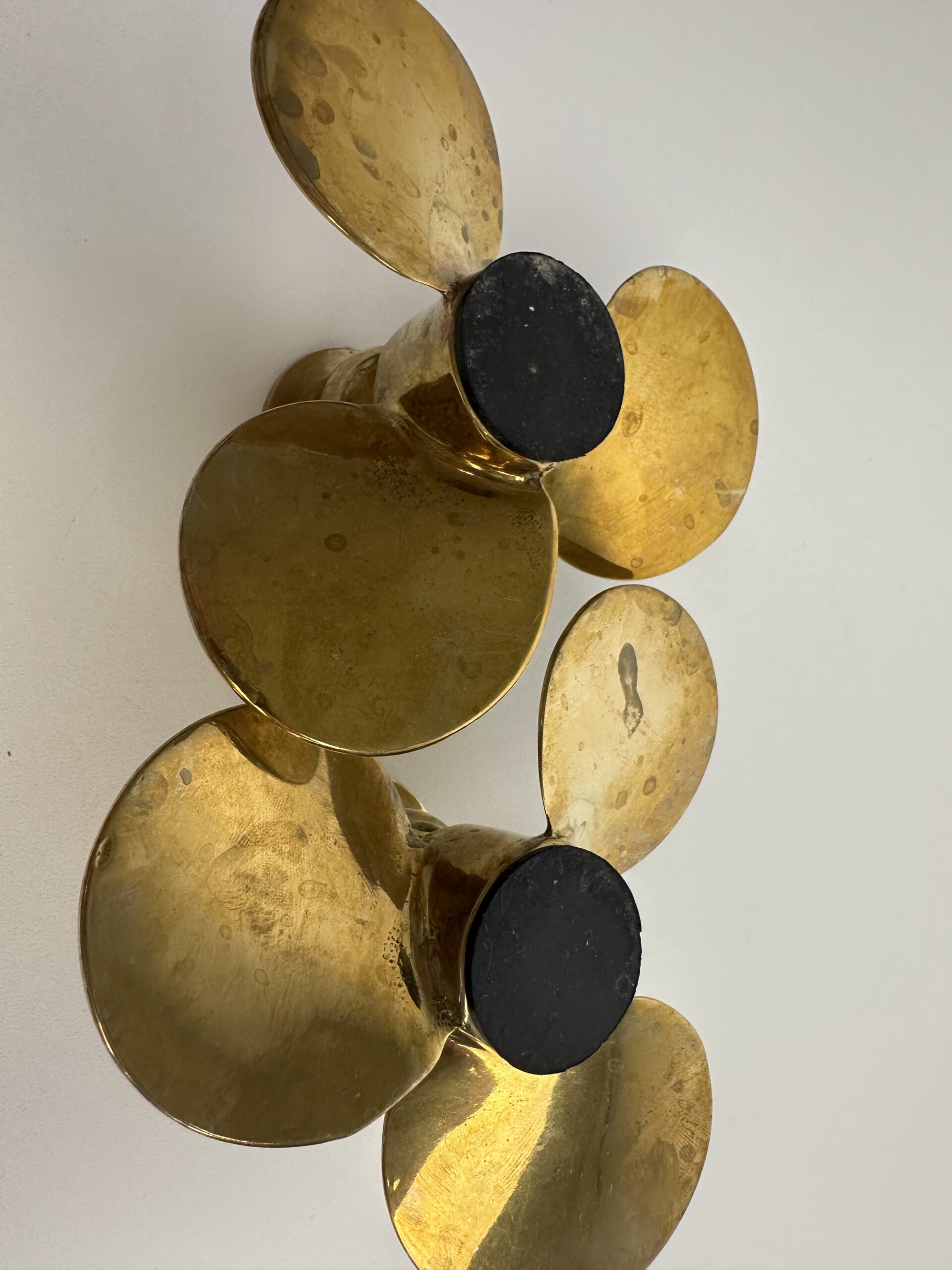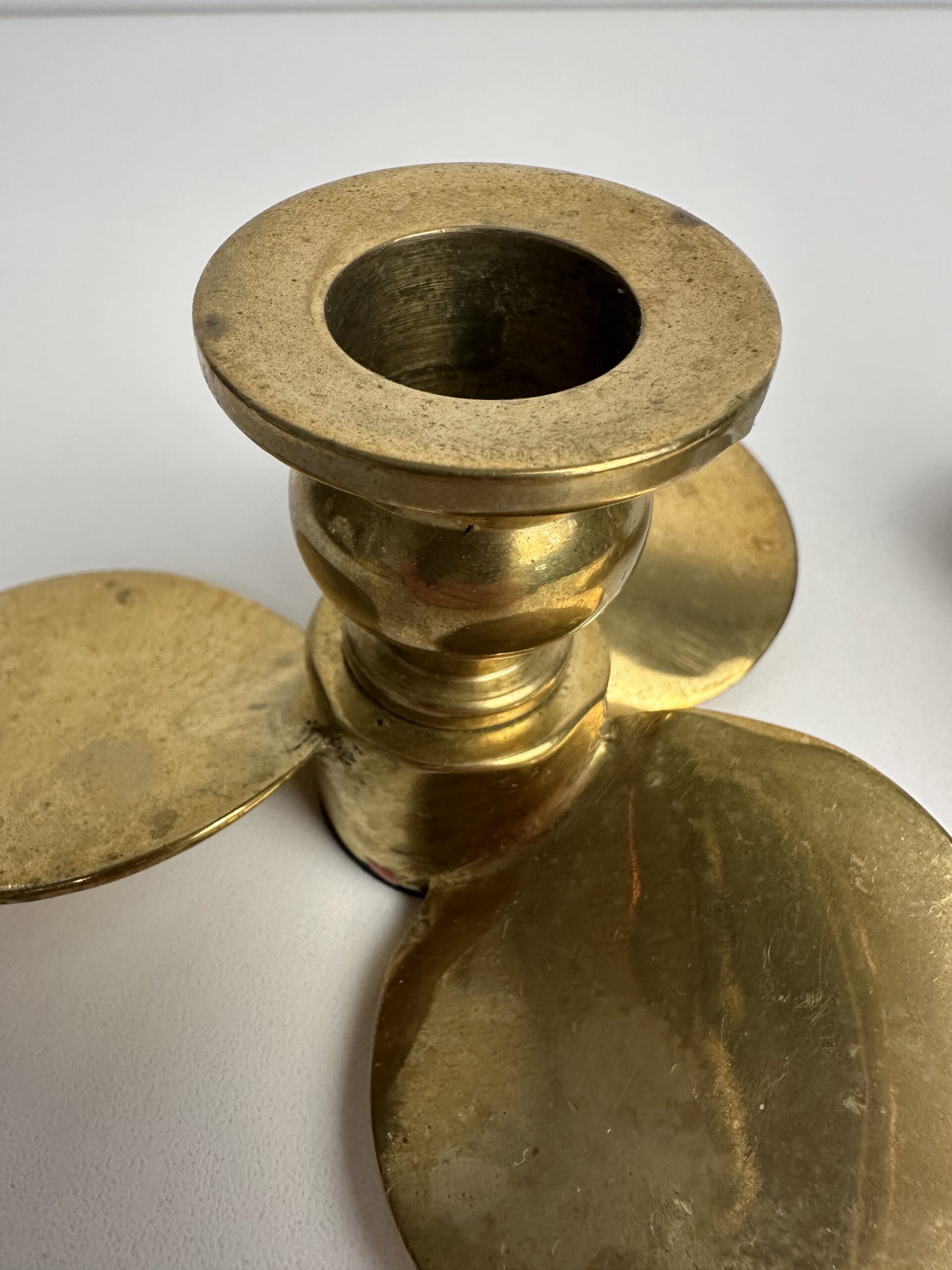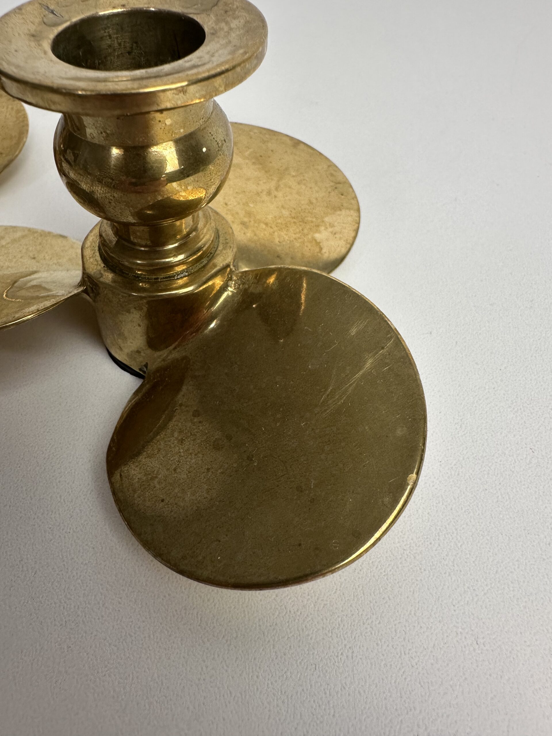 Probablement en laiton, les bougeoirs sont originaux avec leur base en forme de trois pétales arrondis. Ils nous évoquent une fleur ou une hélice, inspirée du design des années 60-70.