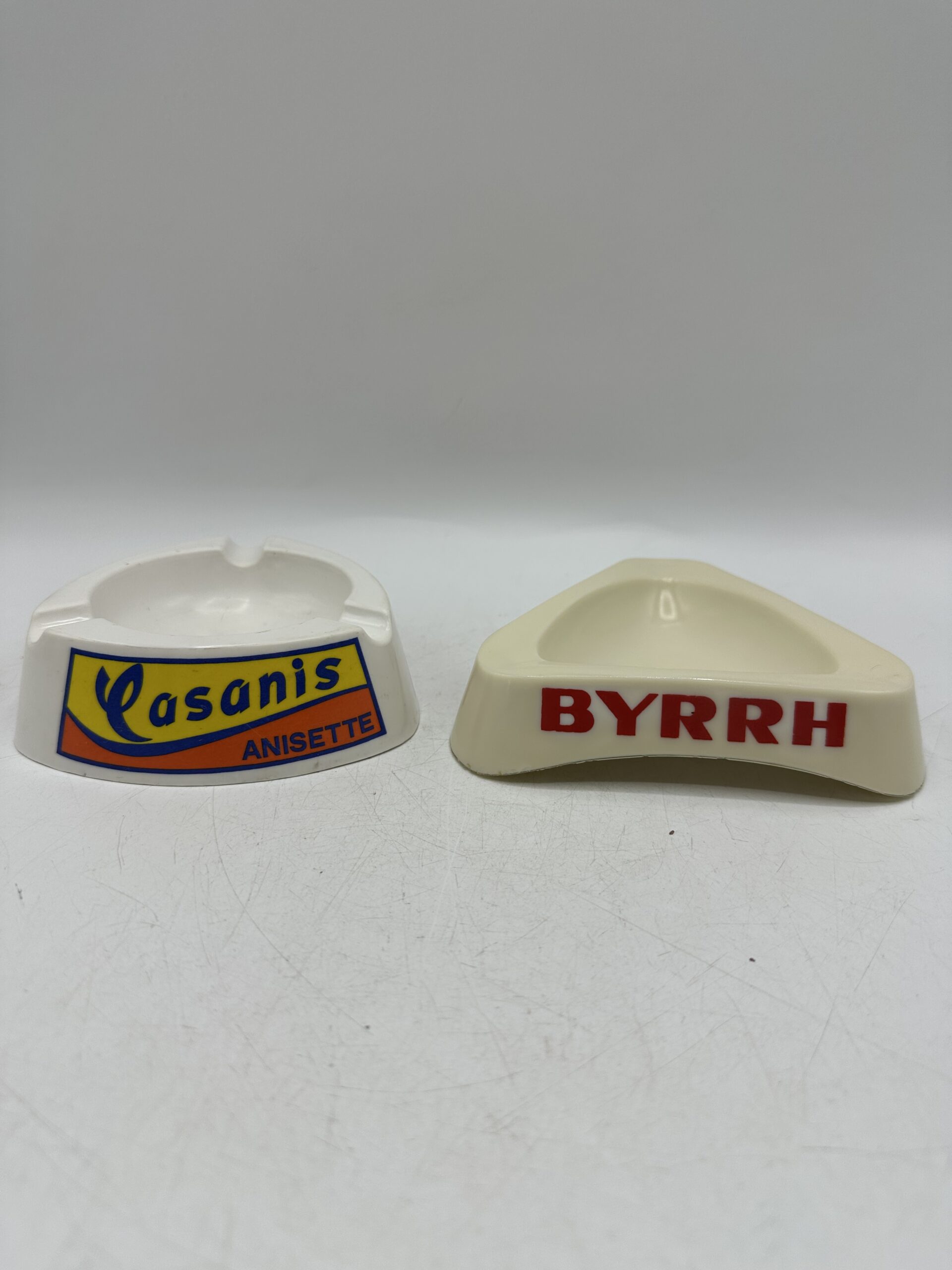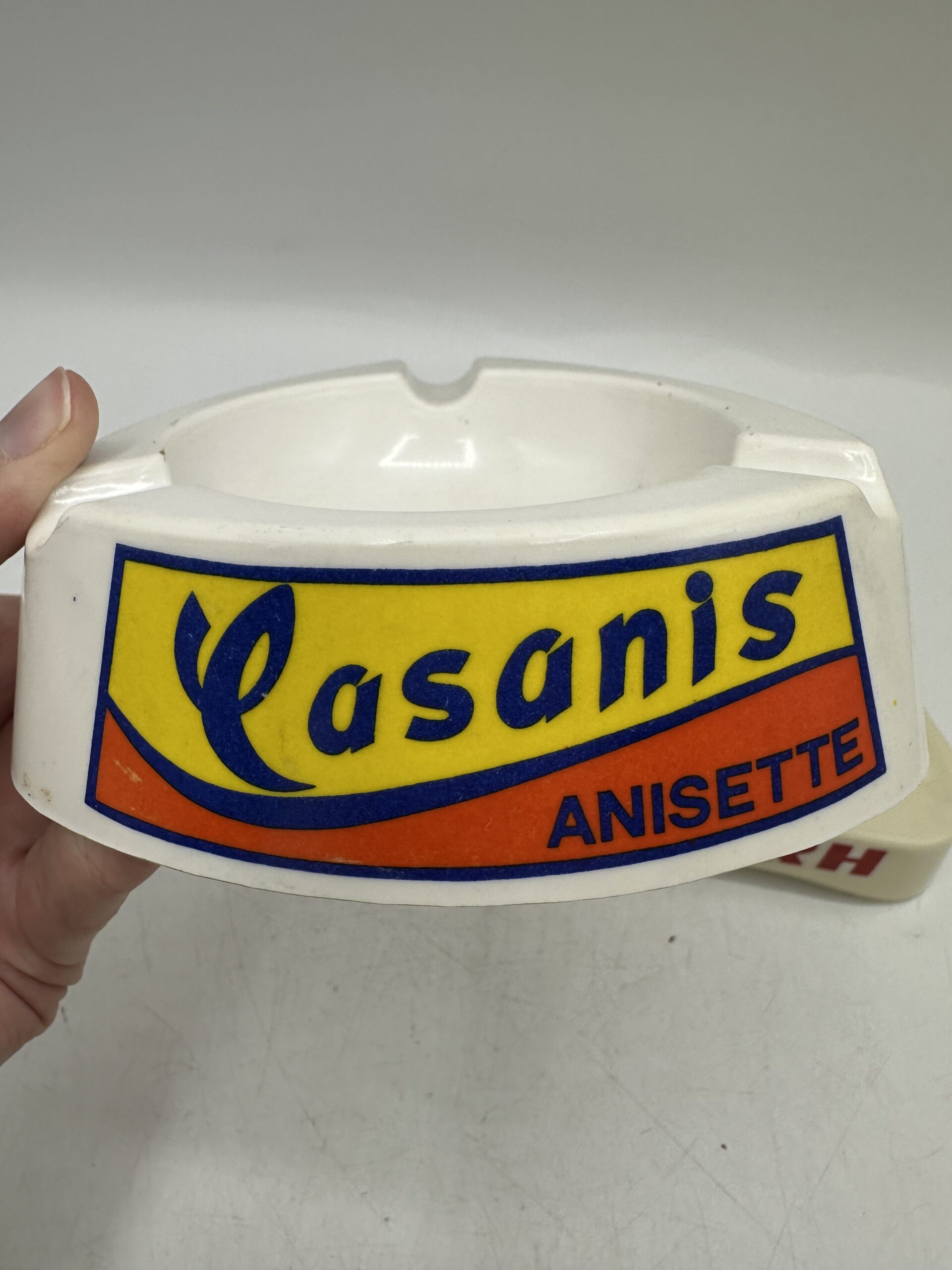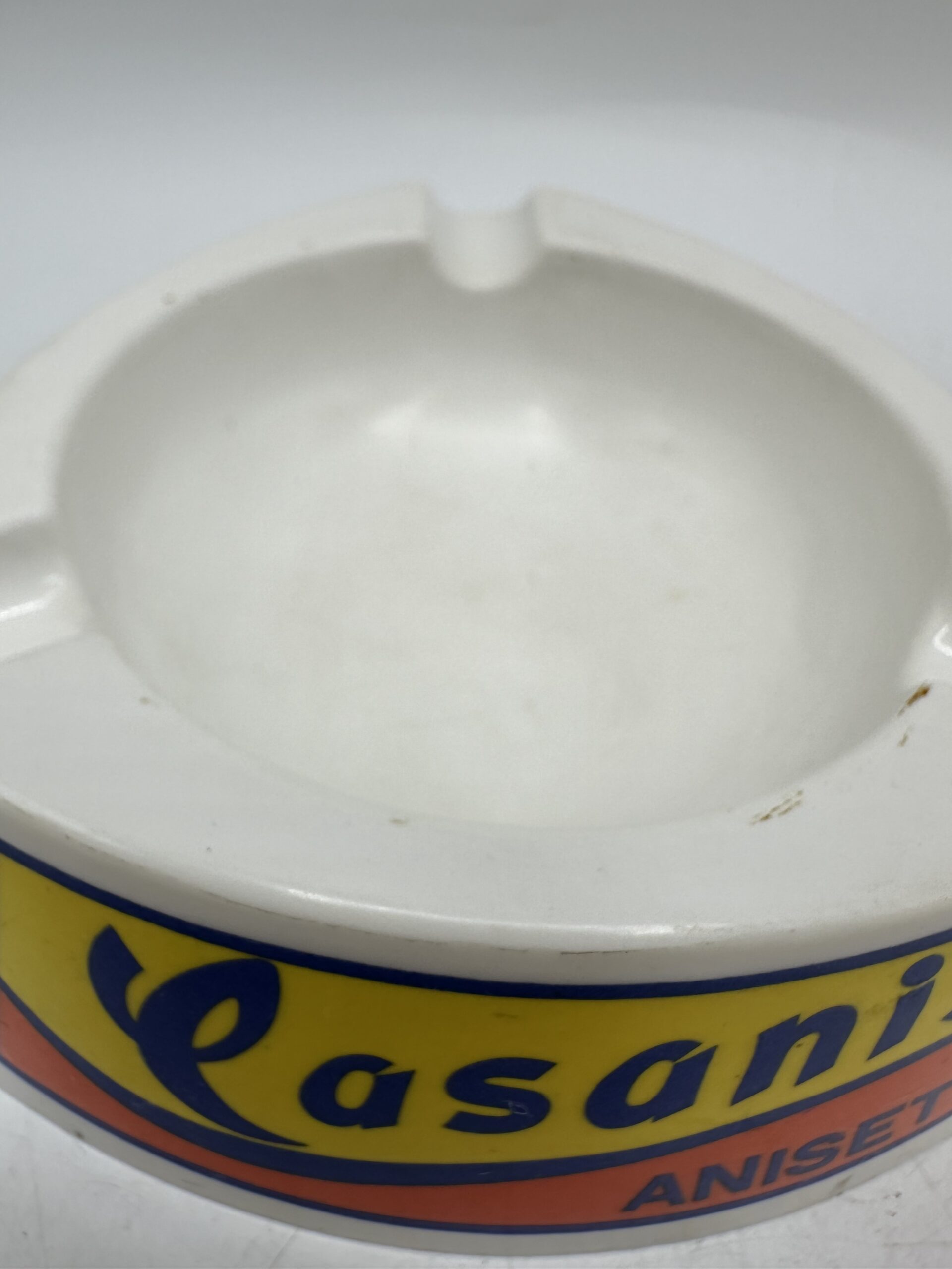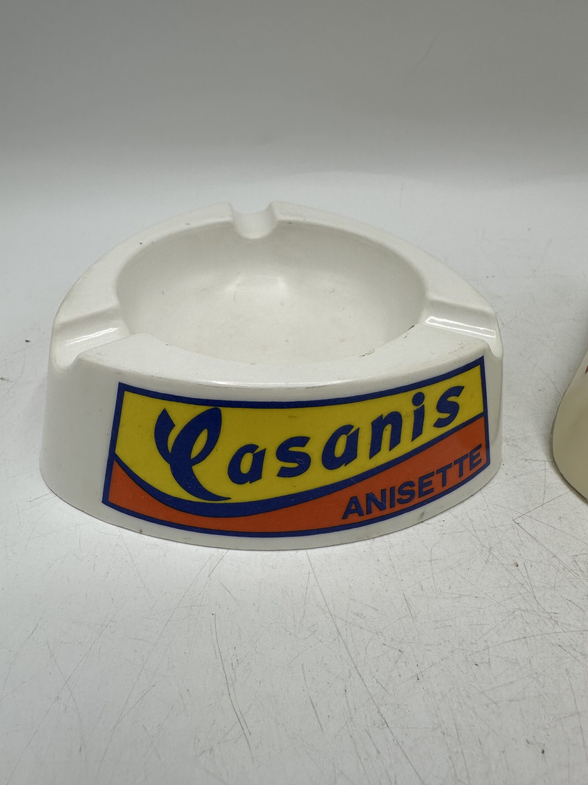 Le premier cendrier est un cendrier Casanis anisette. De forme triangulaire arrondi, il y a 3 logos jaune et orange avec l’écriture Casanis Anisette.