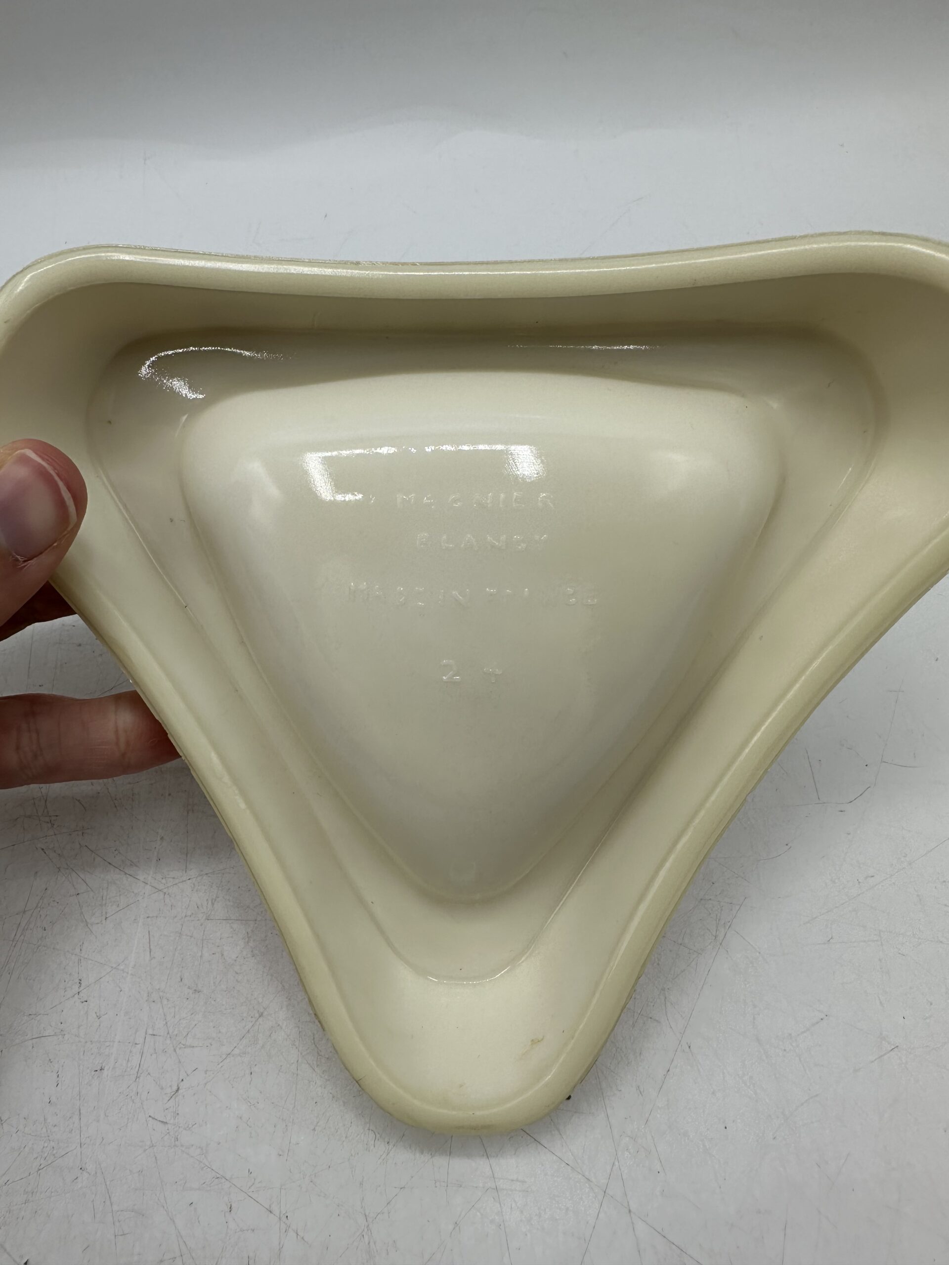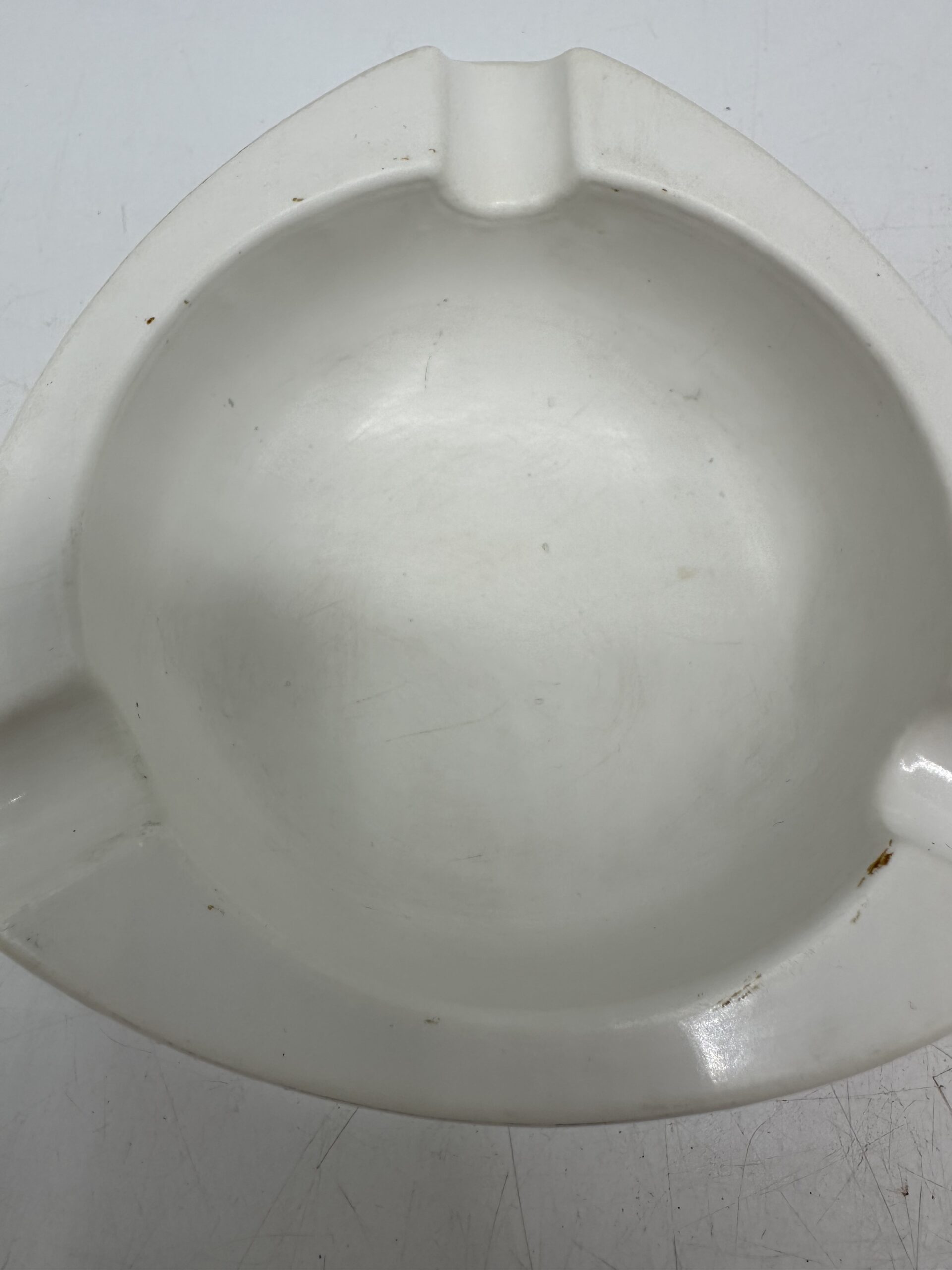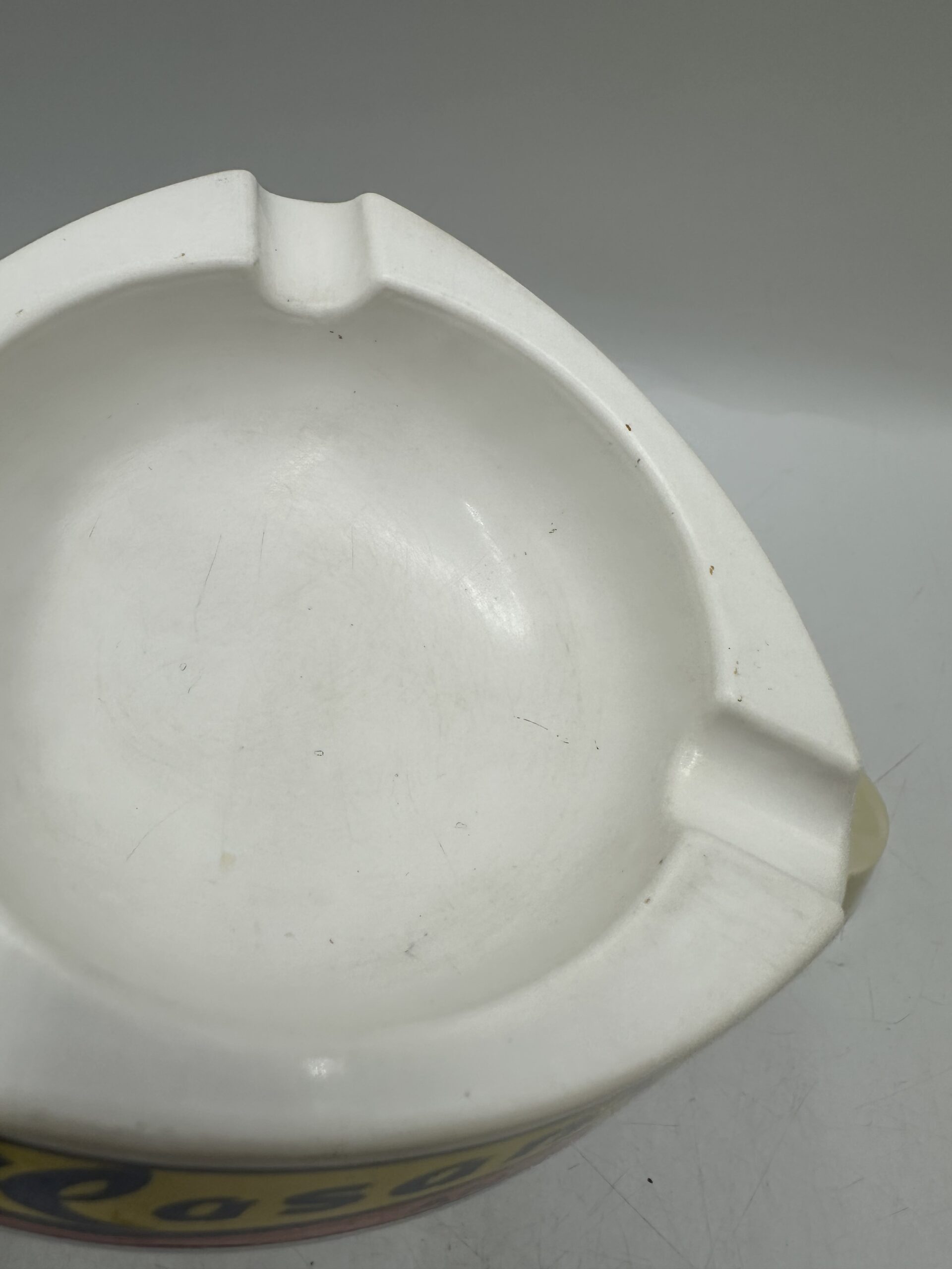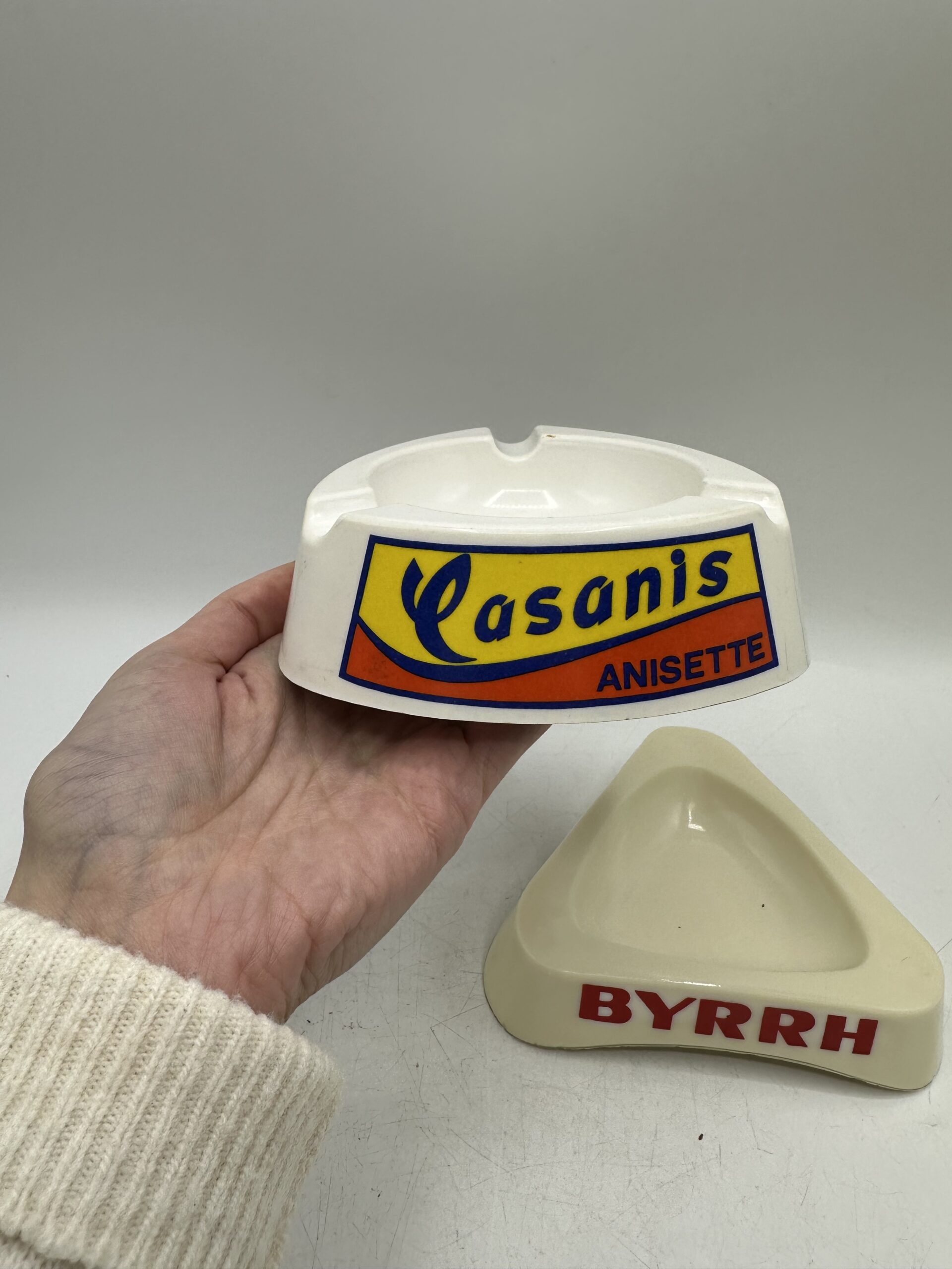 Le premier cendrier est un cendrier Casanis anisette. De forme triangulaire arrondi, il y a 3 logos jaune et orange avec l’écriture Casanis Anisette.