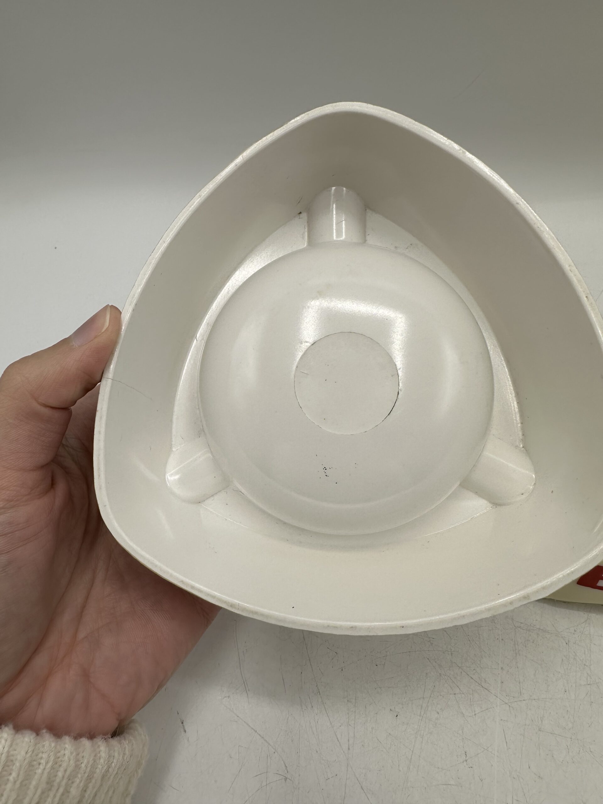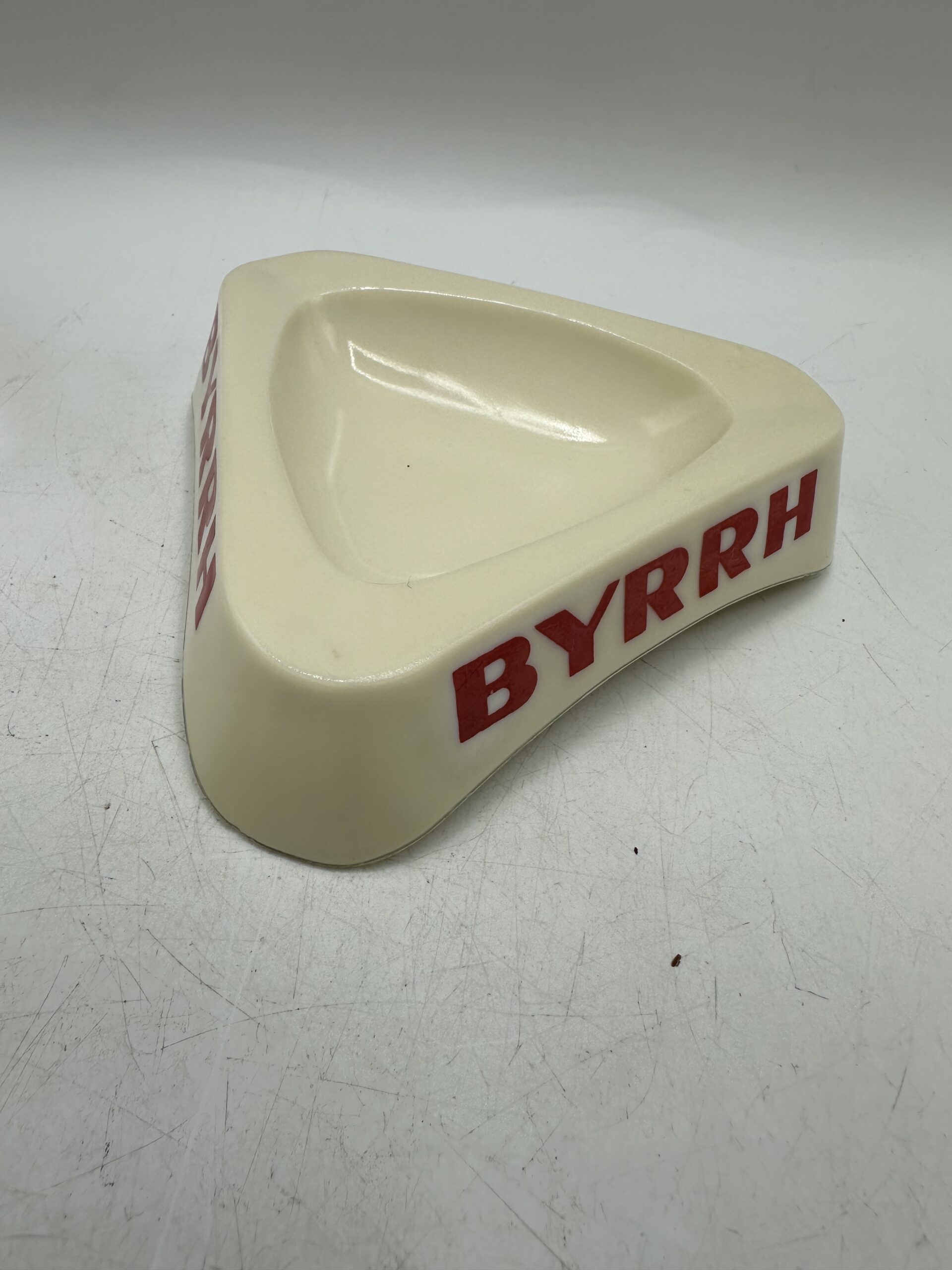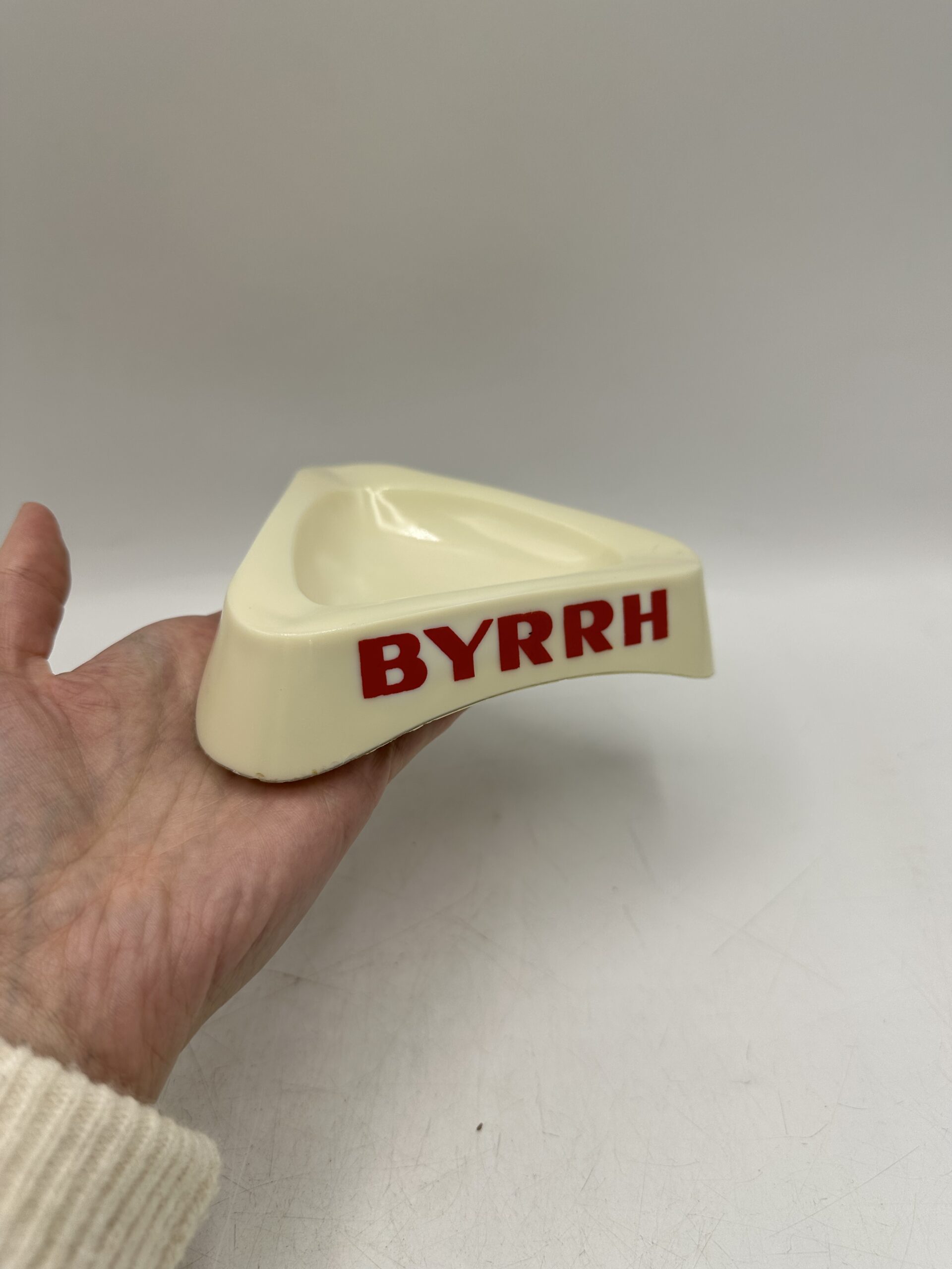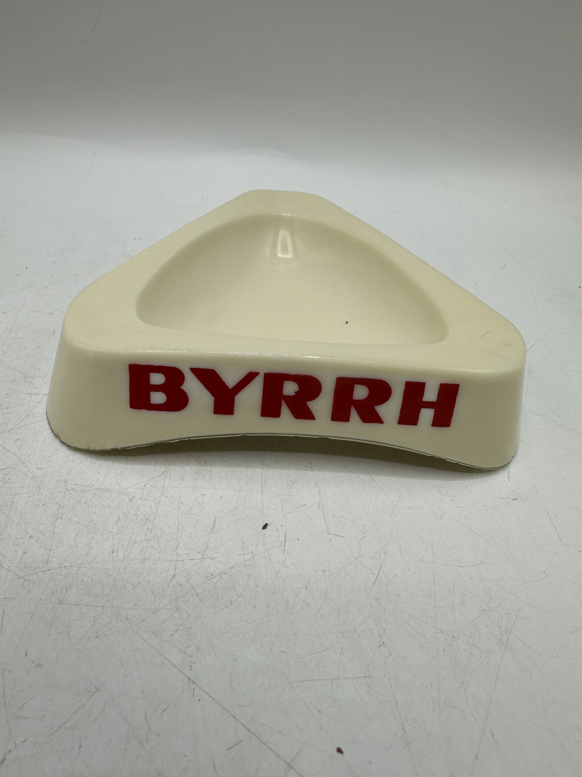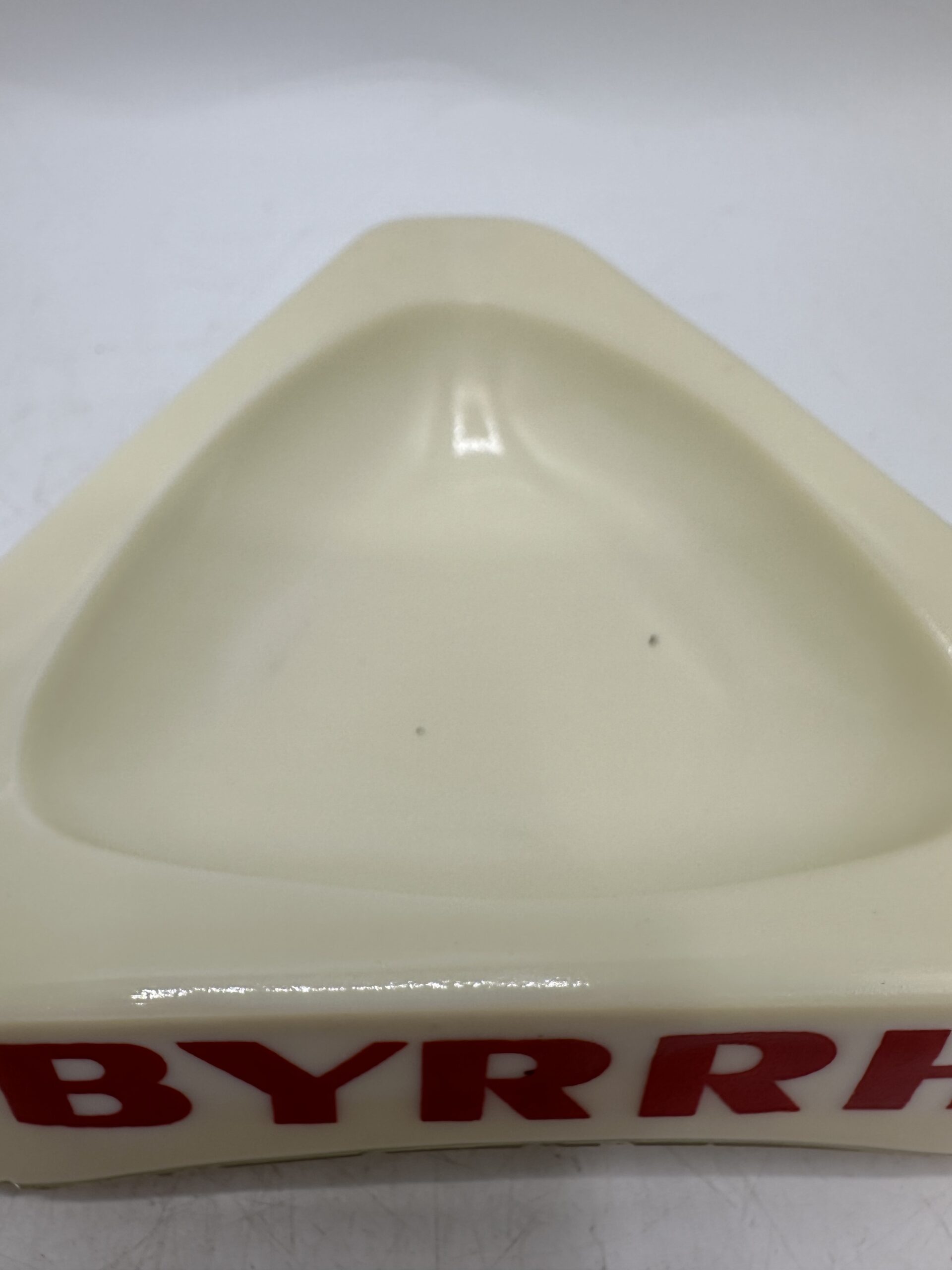 Le second est un cendrier Byrrh en opaline. De forme triangulaire, il y a 3 logos, un sur chaque face, avec écrit BYRRH en rouge.