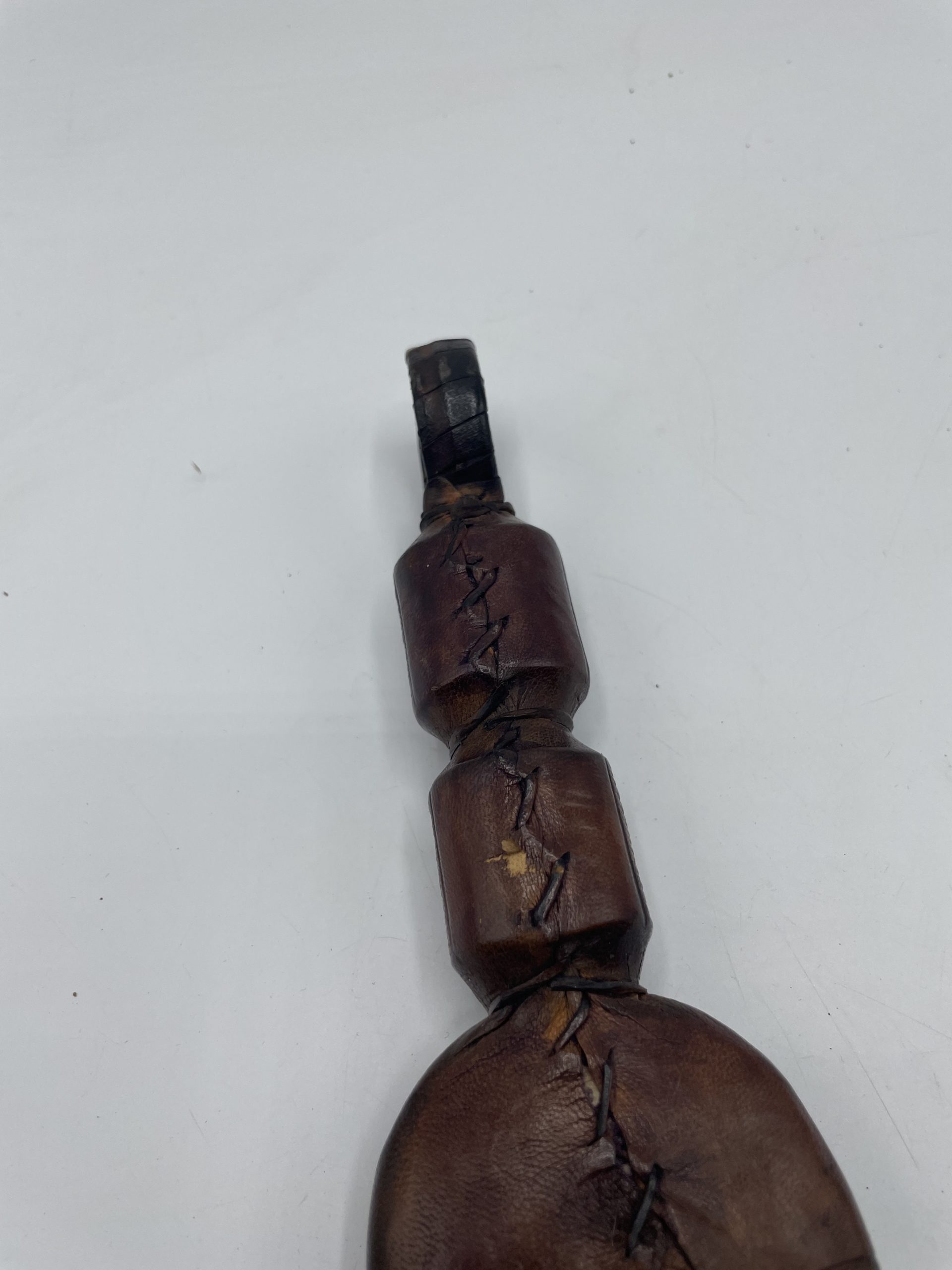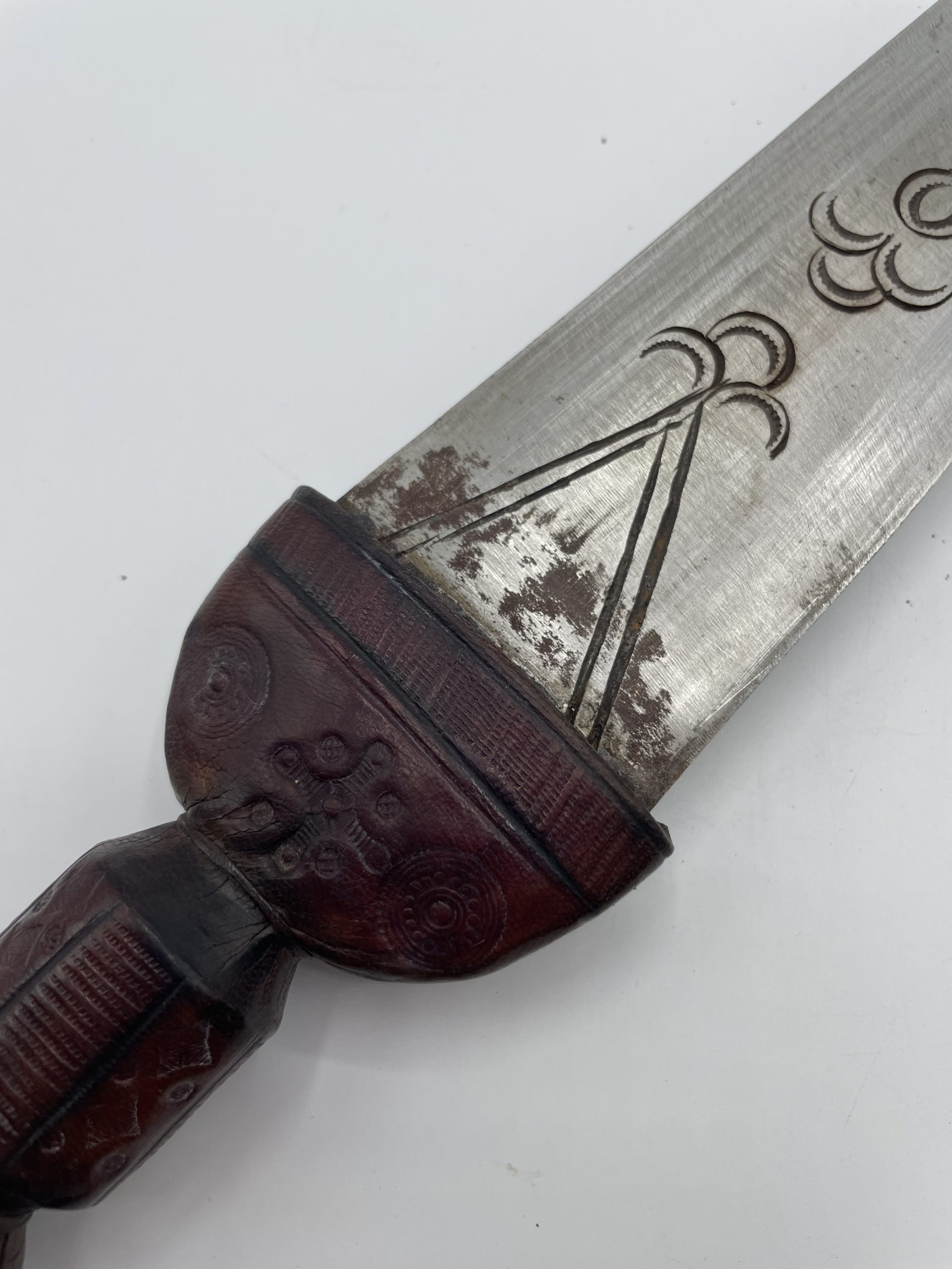 Ce sublime duo d’épées est en réalité un duo de dagues de touareg, ethnie berbère du Sahara. Les dagues ont des lames plates à double tranchant estampées de motifs de croissants de lune frappés dans un sens et dans l’autre. Les poignées et les fourreaux des dagues sont en bois et recouverts de cuir frappé de stries et de motifs ornementaux. Vintage, des traces d’usure sont à prévoir (cf photos) jolies marques du temps passé. Un sublime duo à collectionner !