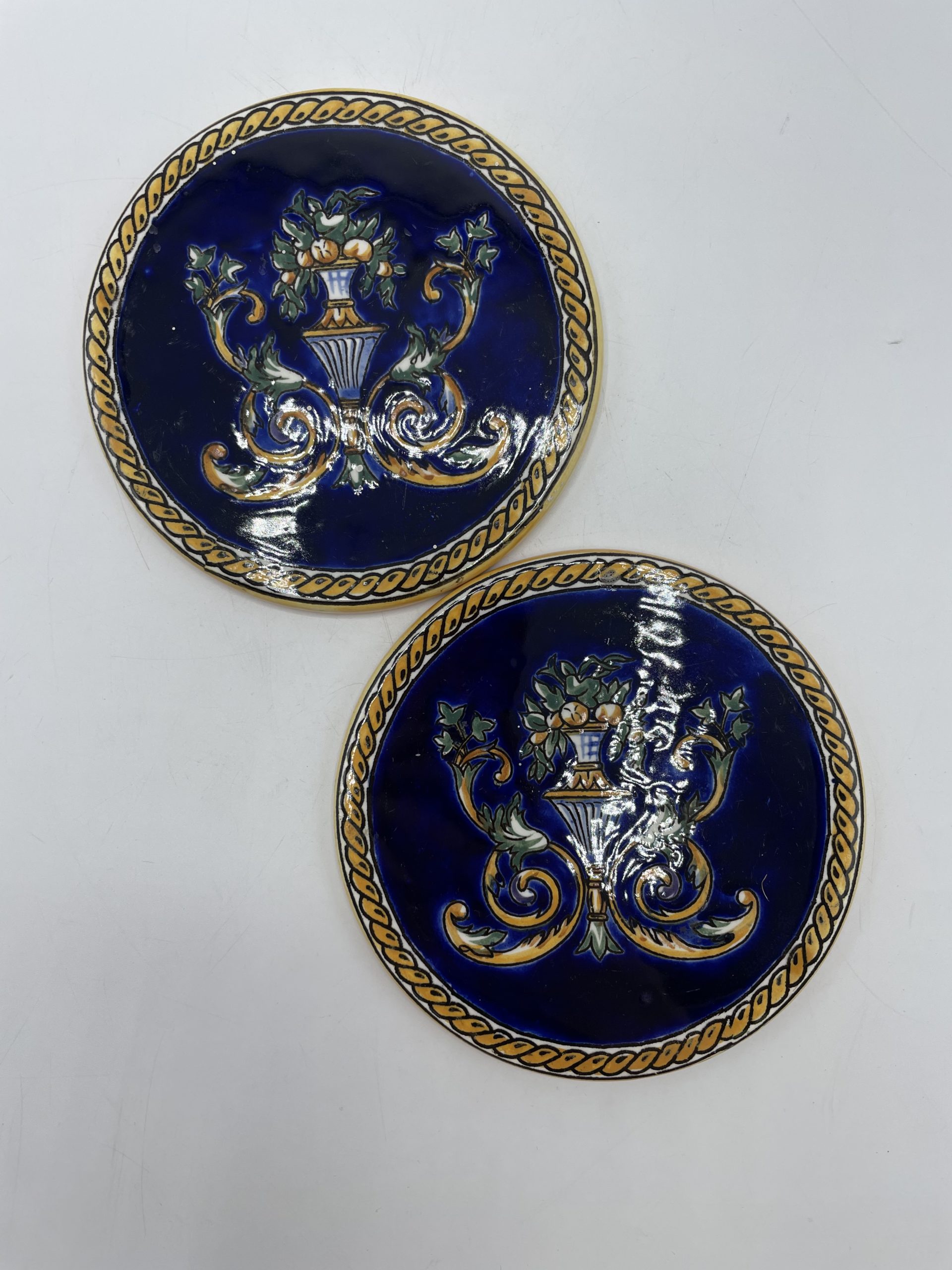 Ce magnifique duo de dessous de carafe est en porcelaine de Giens. Les dessous de carafe sont décorés d’un magnifique motif de vase, fruits, ornements et frises de couleur jaune, bleu marine et vert, à l’esprit classique et baroque. Vintages, les dessous de carafe ou dessous de verres présentent quelques traces d’usure (cf photos) jolies marques du temps passé. Très élégants, ces dessous de carafe sont de beaux objets décoratifs qui embelliront une jolie table pour un repas de fêtes ou un dimanche en famille.