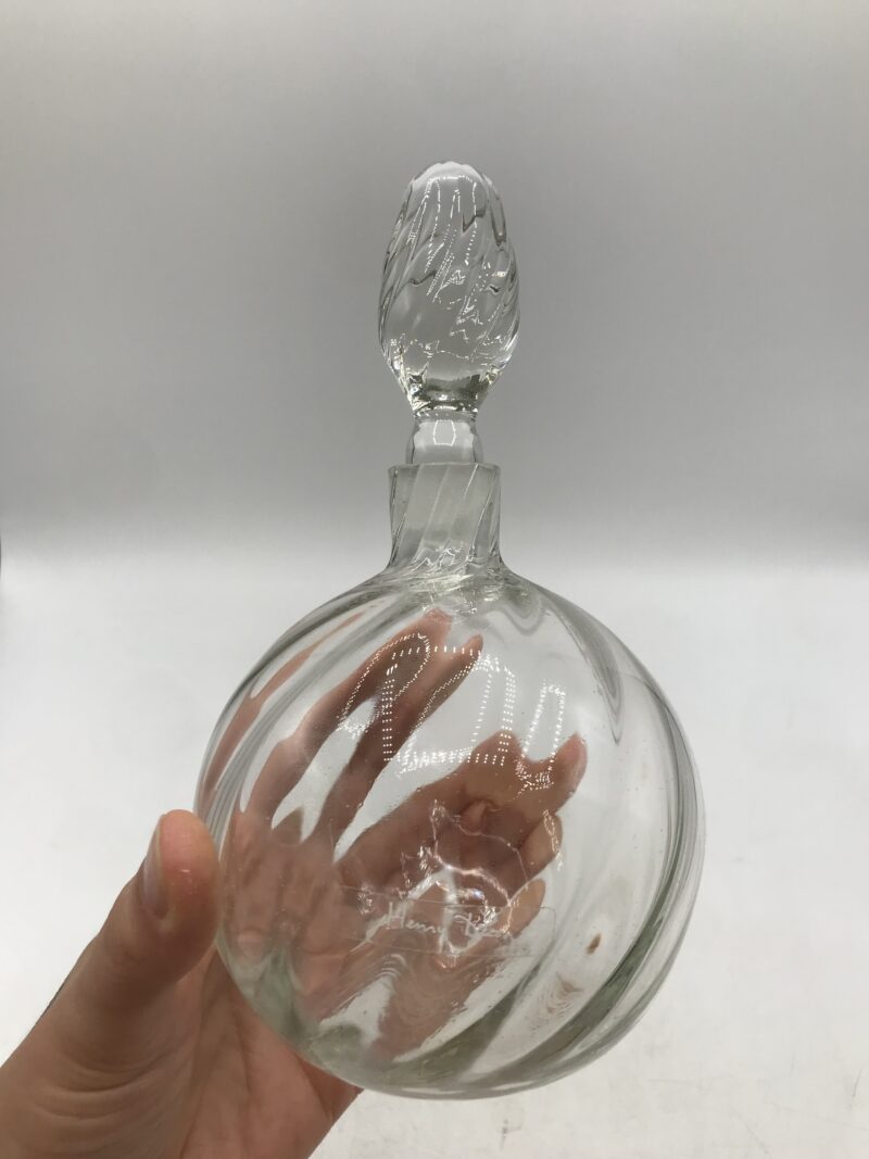 Alerte pépite !!! Duo de flacons en verre signés Henry Dean. Ce duo est composé d’un flacon de forme ronde avec des stries qui lui donne un très joli mouvement de vague. Ce dernier a un diamètre de 9 cm pour une hauteur totale de 18 cm. Il porte encore l’étiquette Henry Dean, il est en parfait état. Le deuxième est plus petit et de forme différente, le verre à été taillé en facette sur le contour. Il a un diamètre de 5,5 cm pour une hauteur totale de 16 cm. A noter qu’il ne porte plus son étiquette Henry Dean et présente des bords un peu abimés (cf photos). Un joli duo prêts à investir votre salle de bain pour partager de beaux moments de vie.