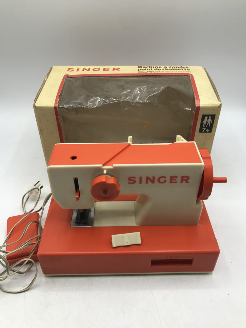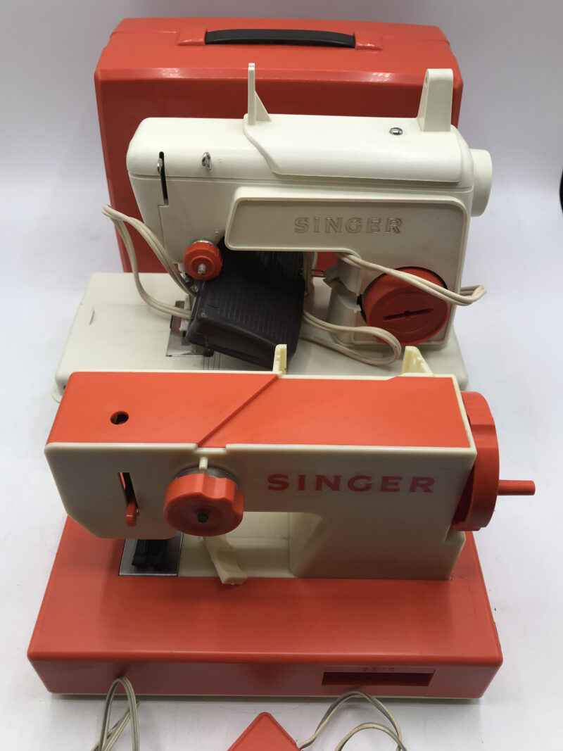 Duo de machine Singer vintage. Pour les amoureux de jouets anciens, voici un lot qui vous fera de l’œil. Le duo est composé du modèle 67B13, et d’un autre format plus petit. Datant des années 1970 elles feront ressortir vos meilleurs souvenirs. A noter que les machines non pas été testées elles sont vendues en l’état. Des pièces sont abimées (cf photos). Une jolie parenthèse dans ce monde à mille à l’heure. Parfait pour créer une ambiance vintage et enfantine, objets de déco pour une vitrine ou tout simplement pour venir compléter une collections de singer anciennes. De couleur orange pétante, elles ne passeront pas inaperçues.
