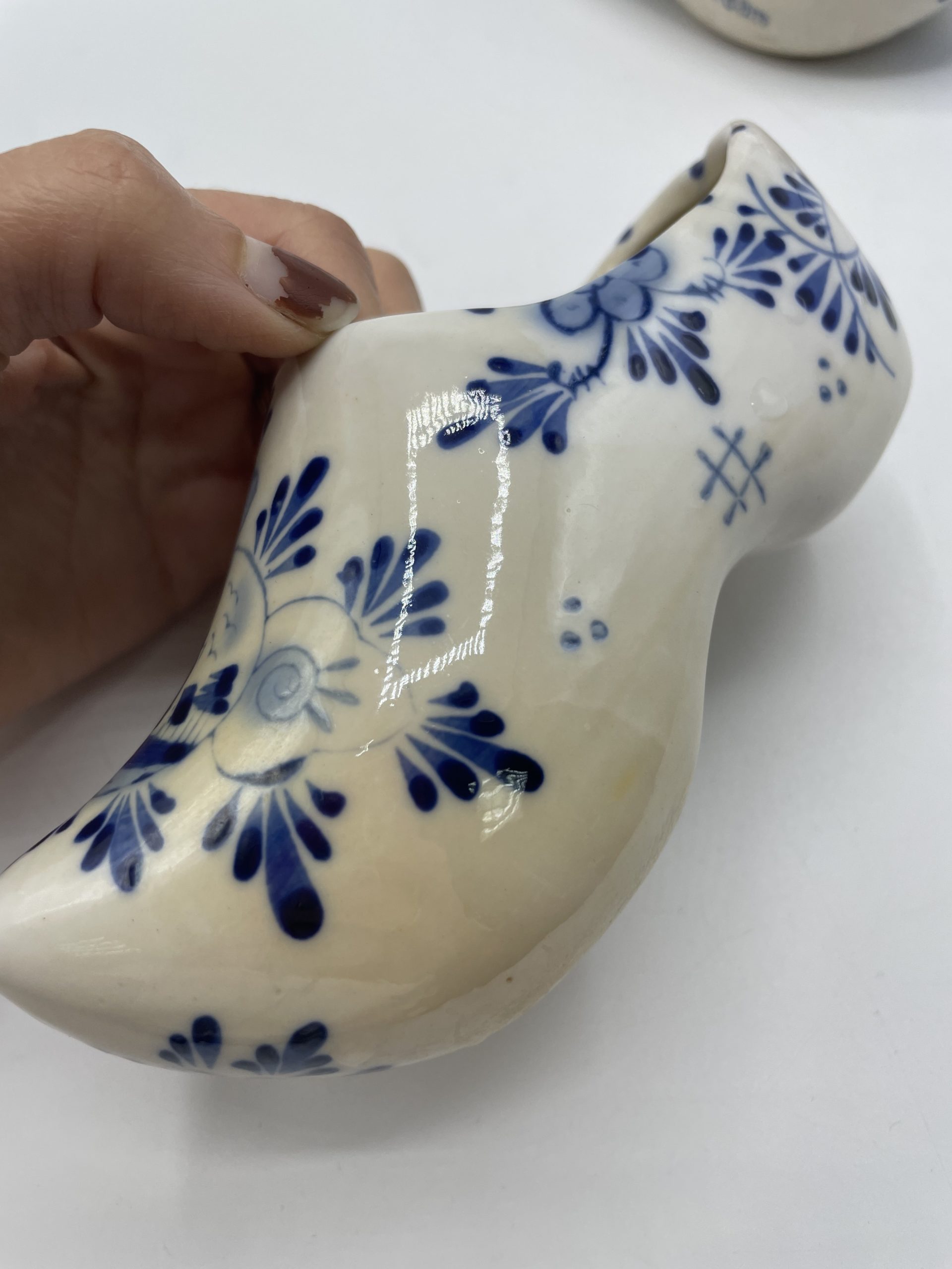 On craque d’amour pour ce joli duo de petits sabots en céramique. De couleur blanche, les sabots sont décorés de motifs de moulins et de fleurs bleus typiques du folklore hollandais. Estampillé Laddrak Amsterdam, ces sabots en céramique présentent quelques traces d’usure (cf photos) jolies marques du temps passé. Ces jolis sabots sont un joli souvenir des Pays Bas et peuvent être utilisés comme jolis bibelots, vide poche ou pourquoi pas de bougeoirs ou de petites jardinières !