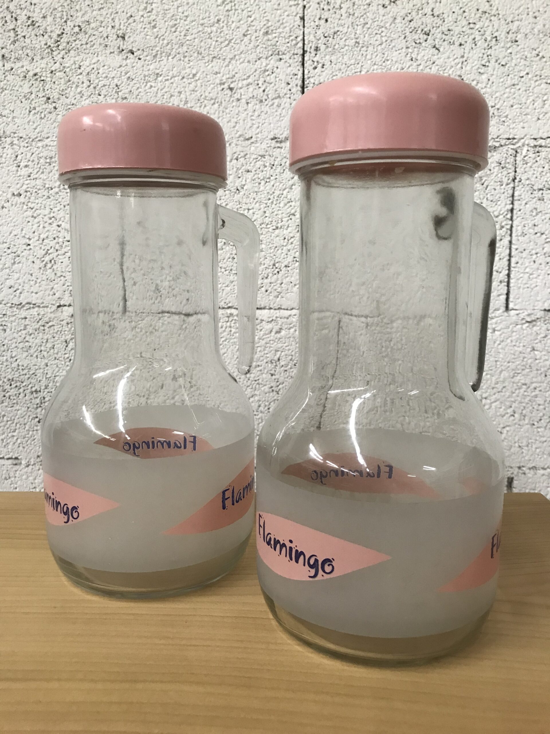 Alerte pépite !!! Duo de pichets Flamingo années 60/70. L’été est là, la chaleur s’installe petit à petit. Quoi de mieux qu’une bonne orangeade pour se rafraichir. Au moment du service surprenez vos amis avec ces deux pichets de grande contenance. Parfait pour mettre des glaçons et animer un centre de table. Le duo est composé de deux carafes identiques. Les pichets ont un diamètre de 13 cm pour une hauteur de 30 cm. Les carafes ont un bouchon rose en plastique et il est noté sur la partie en verre Flamingo. De beaux objets retro vintage qui apporteront une touche de fraicheur. Elles sont en bon état général, quelques traces d’usure mais rien de gênant (cf photos). Un nettoyage est à prévoir.