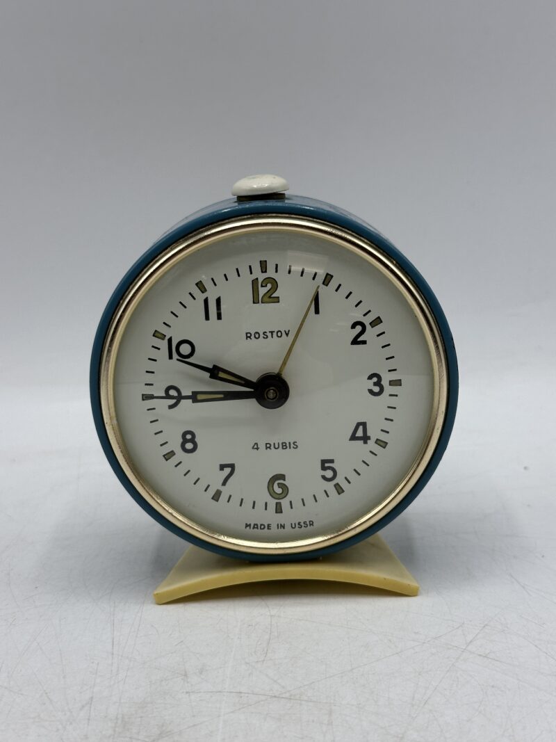 Le premier, le plus petit, est un réveil vintage soviétique Rostov 4 Rubis bleu, made in USSR. Il évoque toute la robustesse et l’histoire d’une fabrication d’antan.