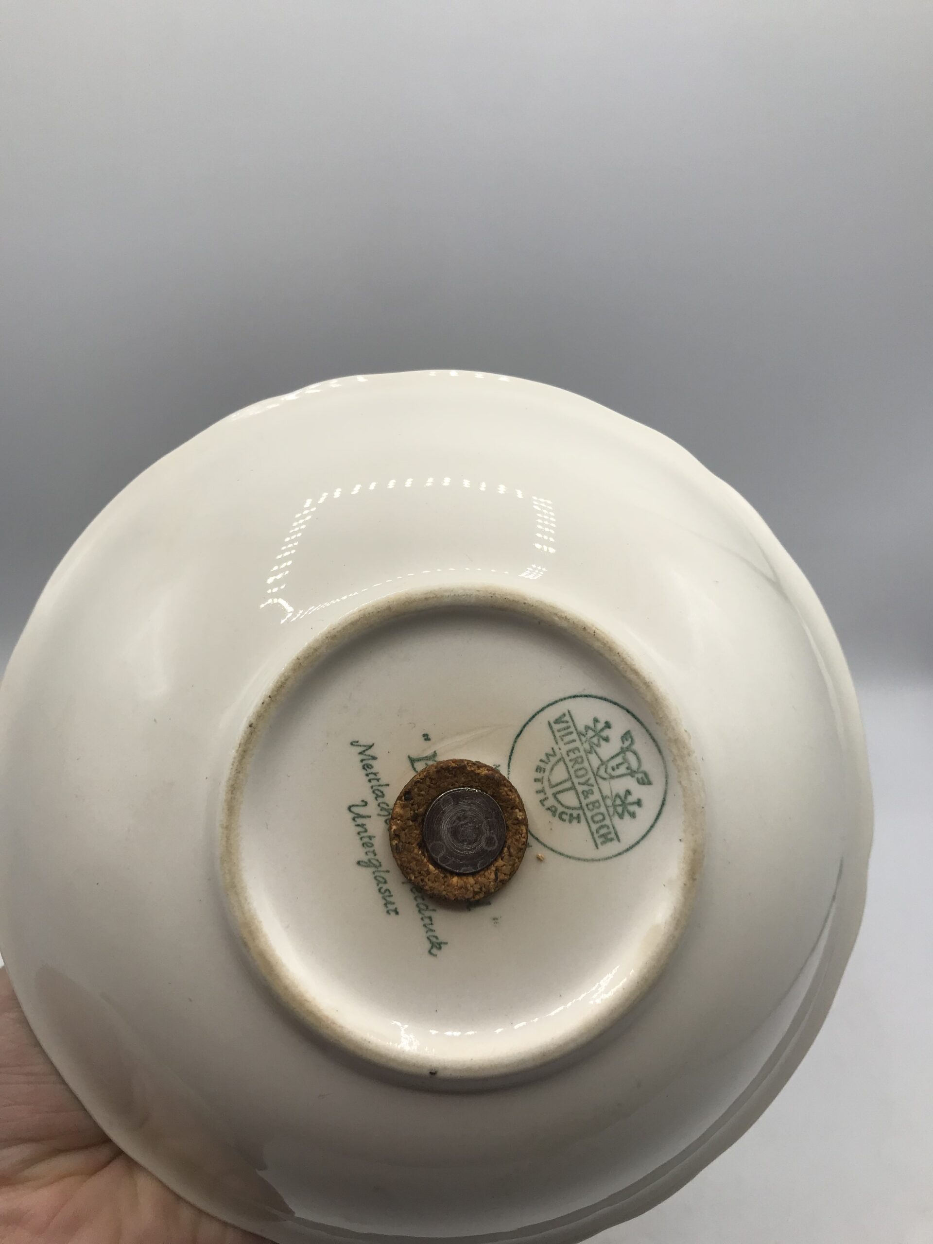 Duo de serviteur Villeroy et Boch « Burgenland ». Cette collection est très appréciée, notre duo ne fera pas de vieux os. Il est composé de deux serviteur, un de couleur bleu et l’autre de couleur rose. Les serviteur ont un diamètre de 16 cm pour la coupelle du bas et 4,5 cm de hauteur, et un diamètre de 13 cm pour la coupelle du haute pour une hauteur de 4 cm. De parfaits supports pour mettre en valeur des petites douceurs au moment du dessert. Ils sont en très bon état pas d’éclat à signaler. Plein de charme ils prendront vite leur place dans votre décoration ou au moment du service. Vos convives vont rester baba.