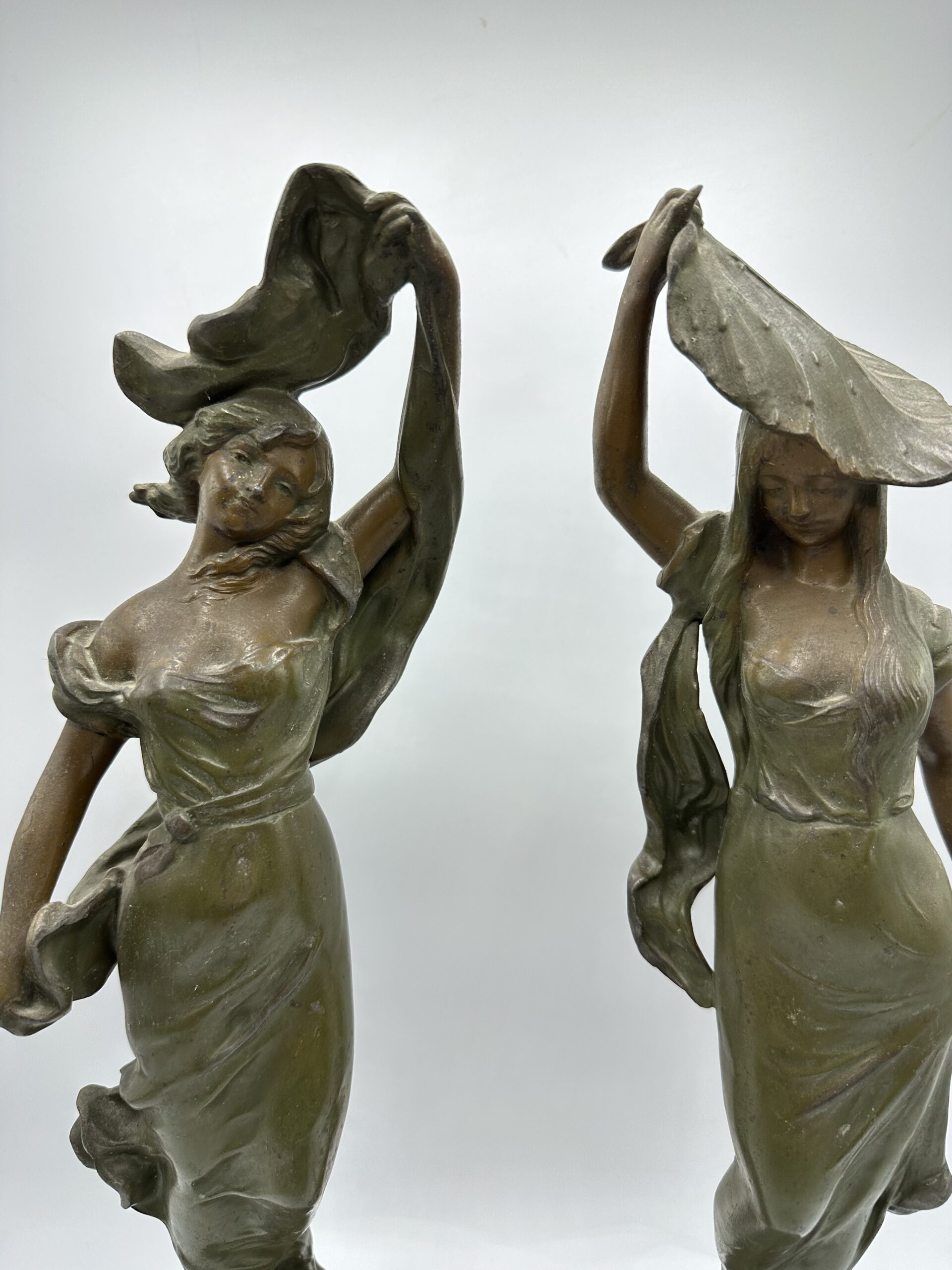 Ces jolies statues anciennes représentent deux figures féminines, délicatement drapées, qui évoquent le mouvement et la poésie naturelle. Leur patine d’origine apporte un charme authentique et un caractère ancien très recherché.
