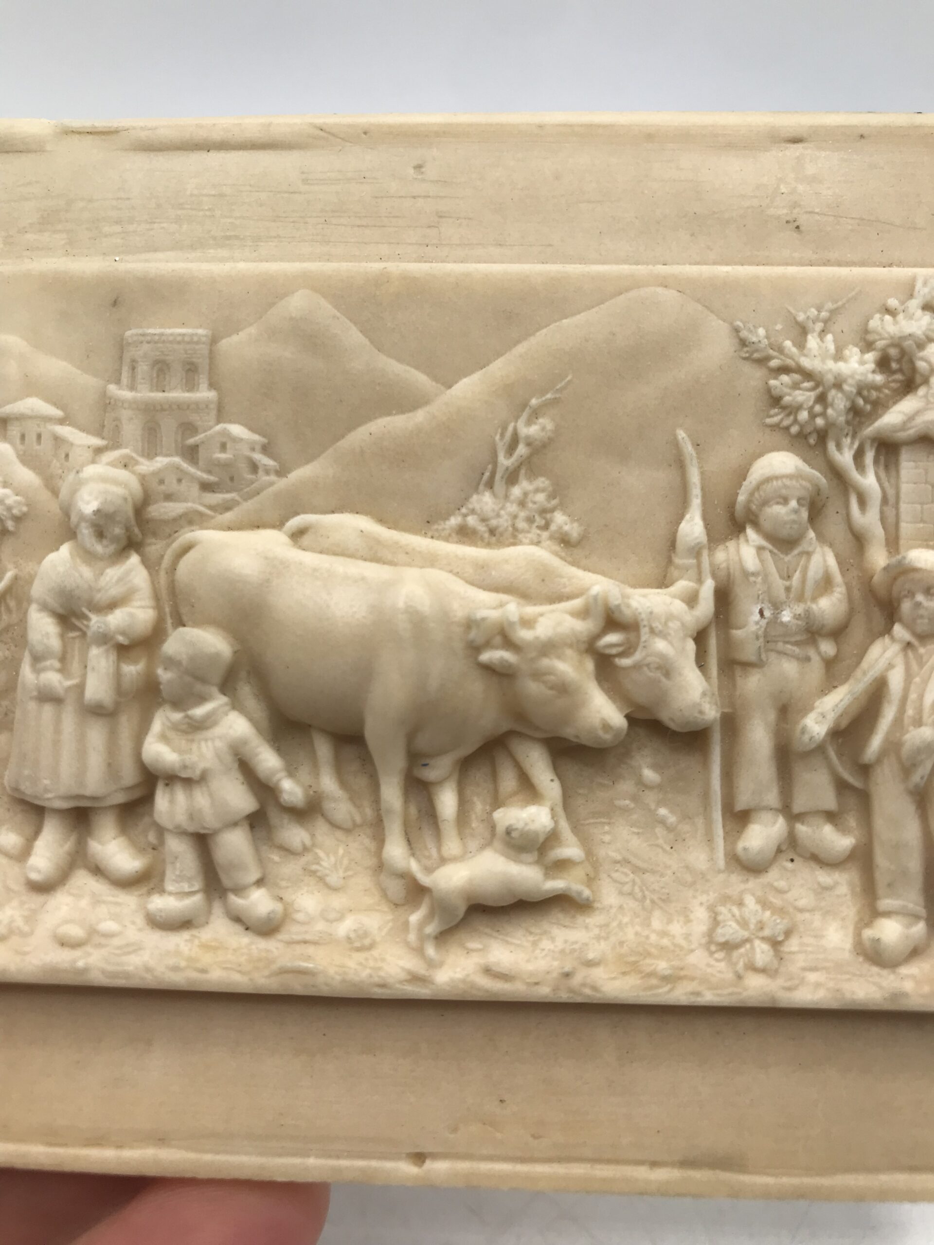 Duo de tableau en calcaire. Voici un duo étonnant, il est composé de deux tableaux en calcaire. Datant du XXème siècle ces deux tableaux représentent la même scène paysanne. Belle représentation de la technique du calcaire de la fontaine pétrifiante de Saint Nectaire. Jolis petits tableaux décoratifs à accrocher ou à faire encadrer. A noter qu’ils présentent des marques d’usure et des petites cassures sur certains détails des personnages (cf photos). Une jolie note empreinte du temps passé. L’art traverse les générations et nous accompagne sous différentes formes, mais il est toujours présent. Laissez vous séduire par cette douceur d’antan et crée une ambiance atypique.