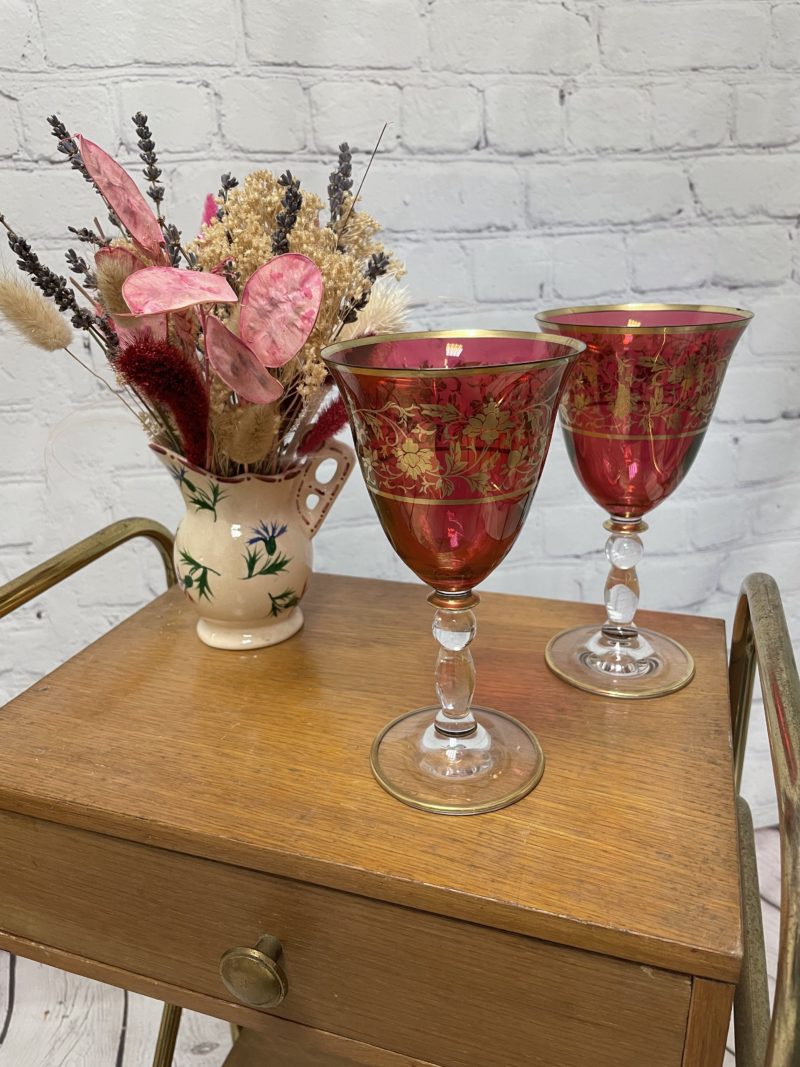 Ce joli duo de verres à pied vous faire fondre. De couleur rouge et or, ces verres à vin sont décorés de motifs de fleurs et de liserés dorés dans le même esprit que les verres en cristal de Bohème. Vintage, des traces d’usure et un petit éclat sont à prévoir (cf photos) jolies marques du temps passé. Un magnifique duo pour apprécier les plus grands crus !
